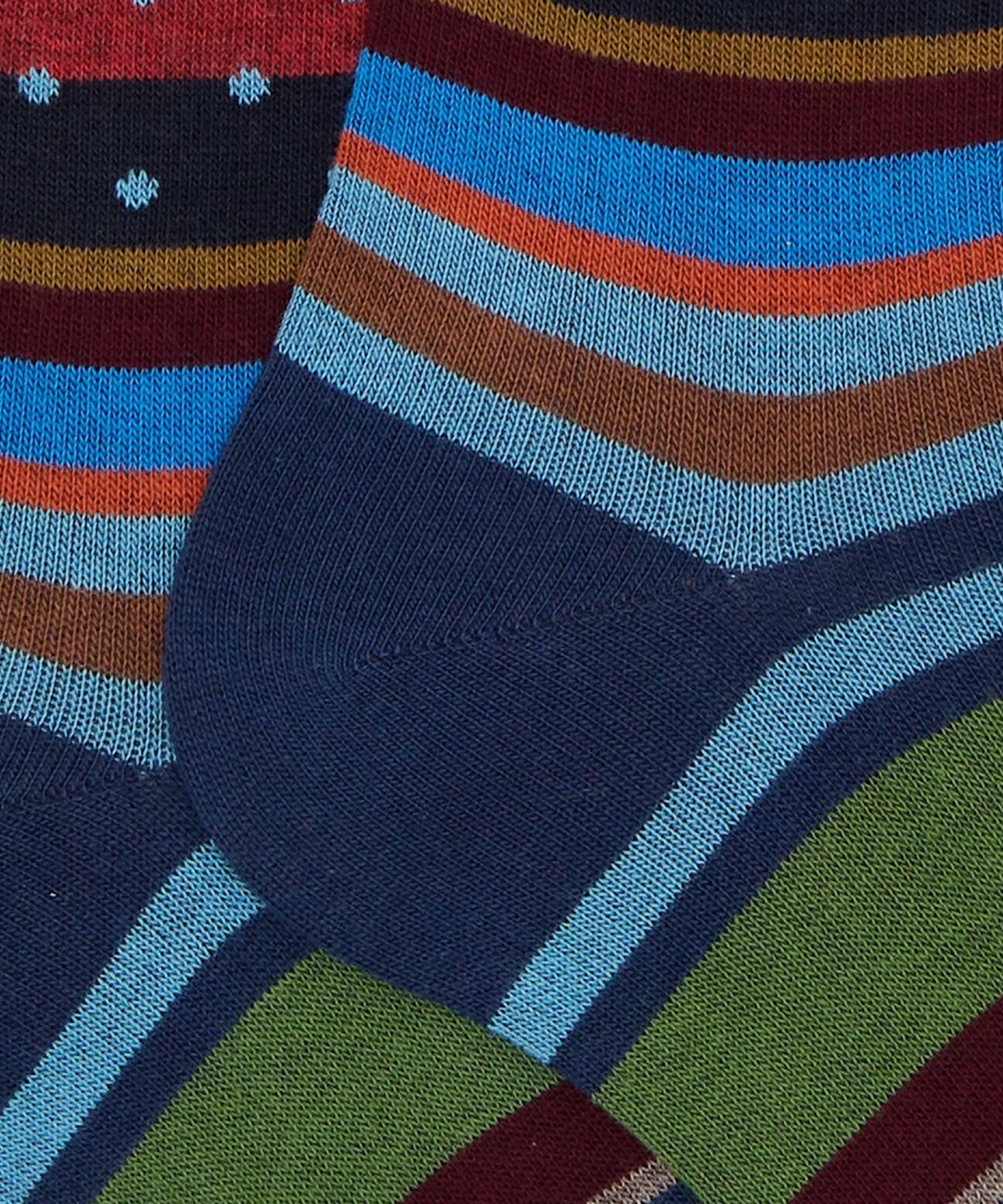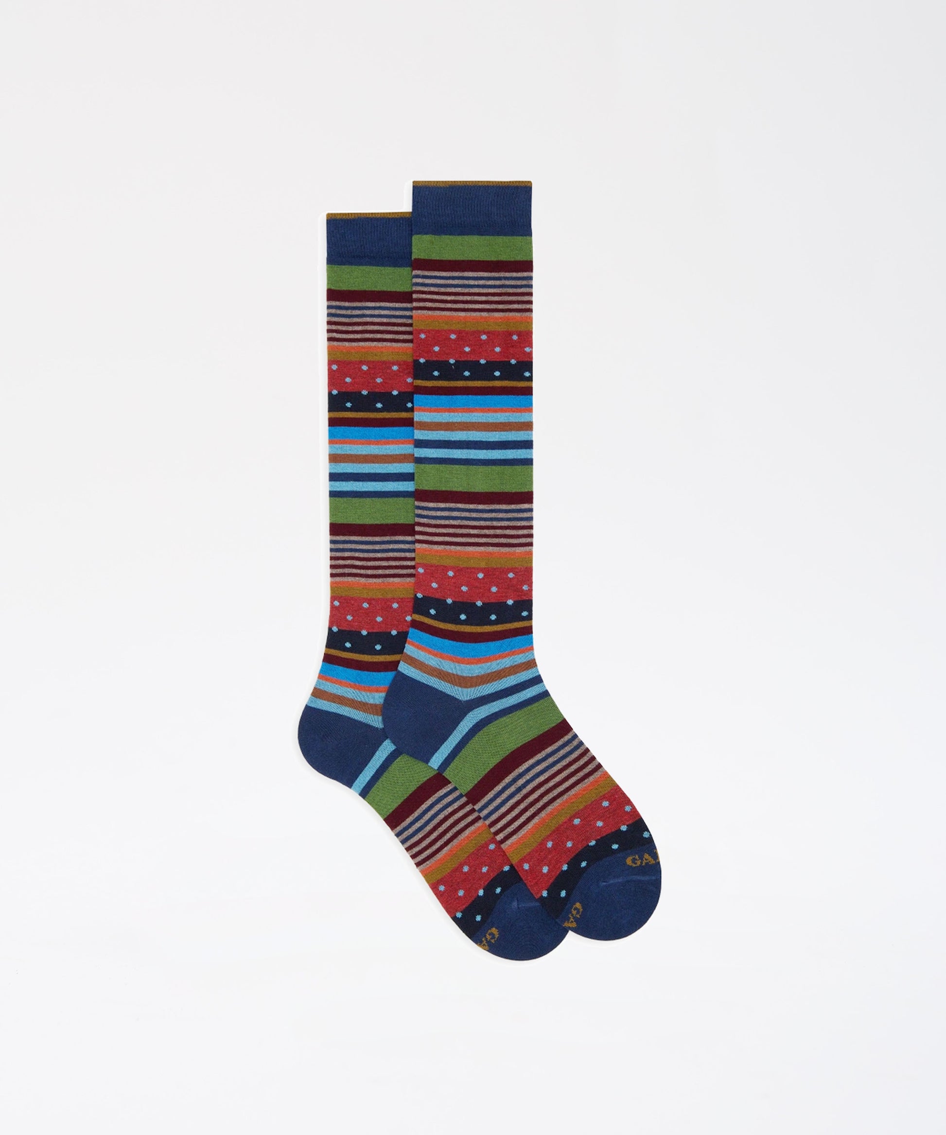 Calze lunghe da uomo realizzate in Italia in cotone. Molto morbide al tatto, create per una persona dinamica che non rinuncia ad un dettaglio di stile. La divertente fantasia che mixa righe e pois nei toni del rosso le rende originali ma riconoscibili. Si adattano ad un look casual, stravagante o anche formale.