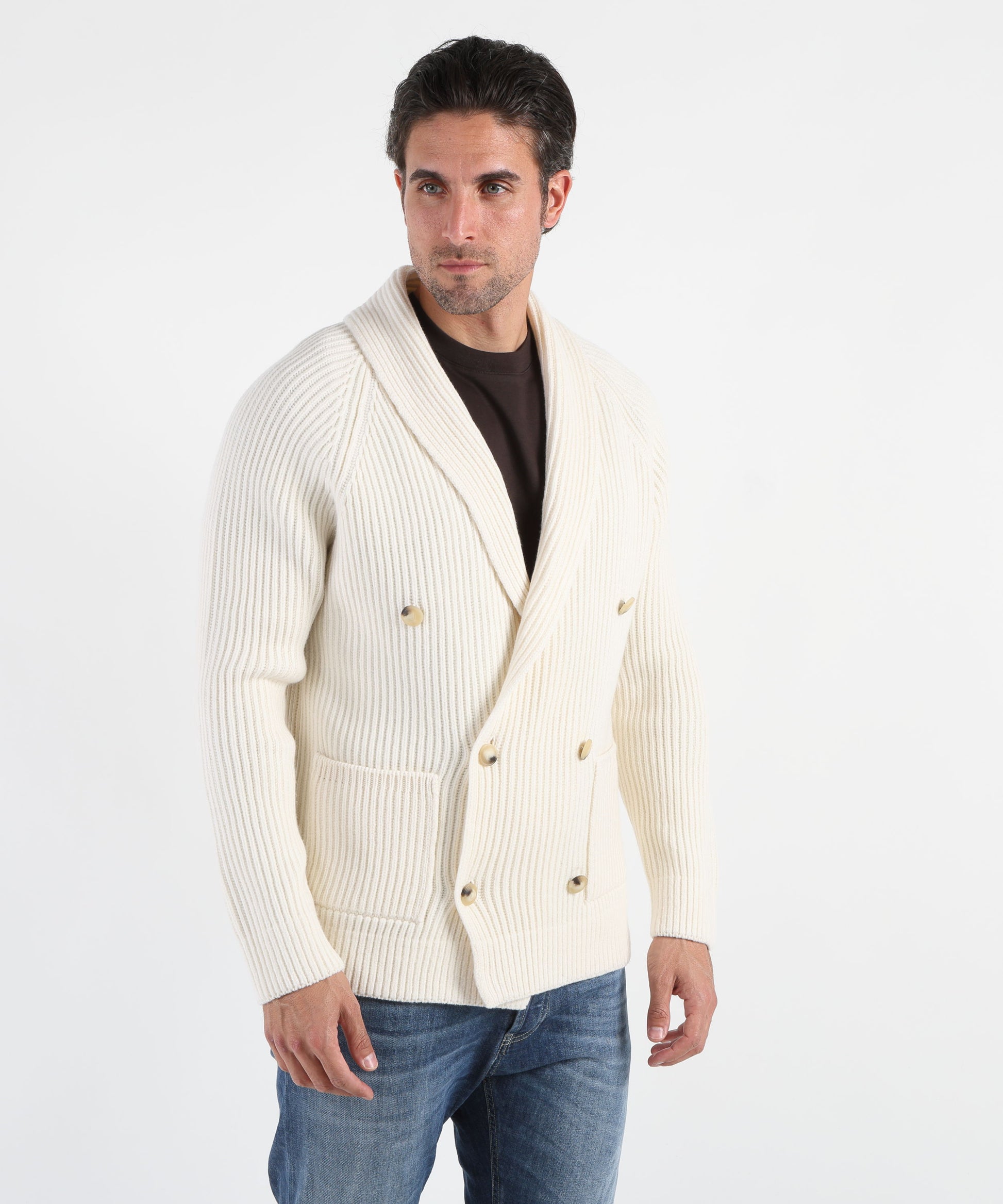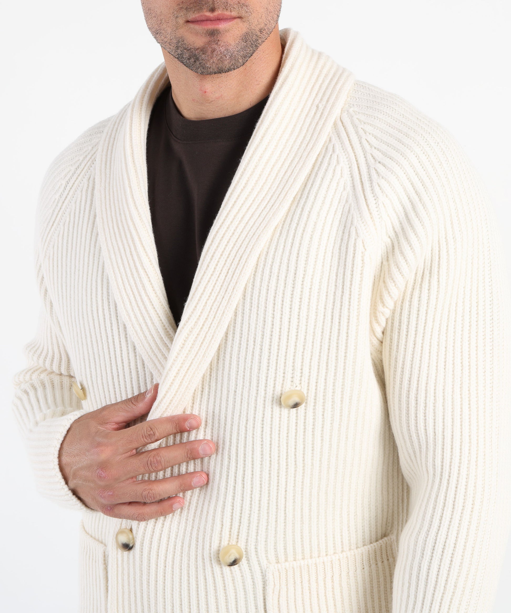 Cardigan Gran Sasso in pura lana Super Geelong, con collo sciallato e chiusura doppiopetto. Morbido, caldo e sofisticato, è un capo iconico dallo stile rilassato ma elegante.