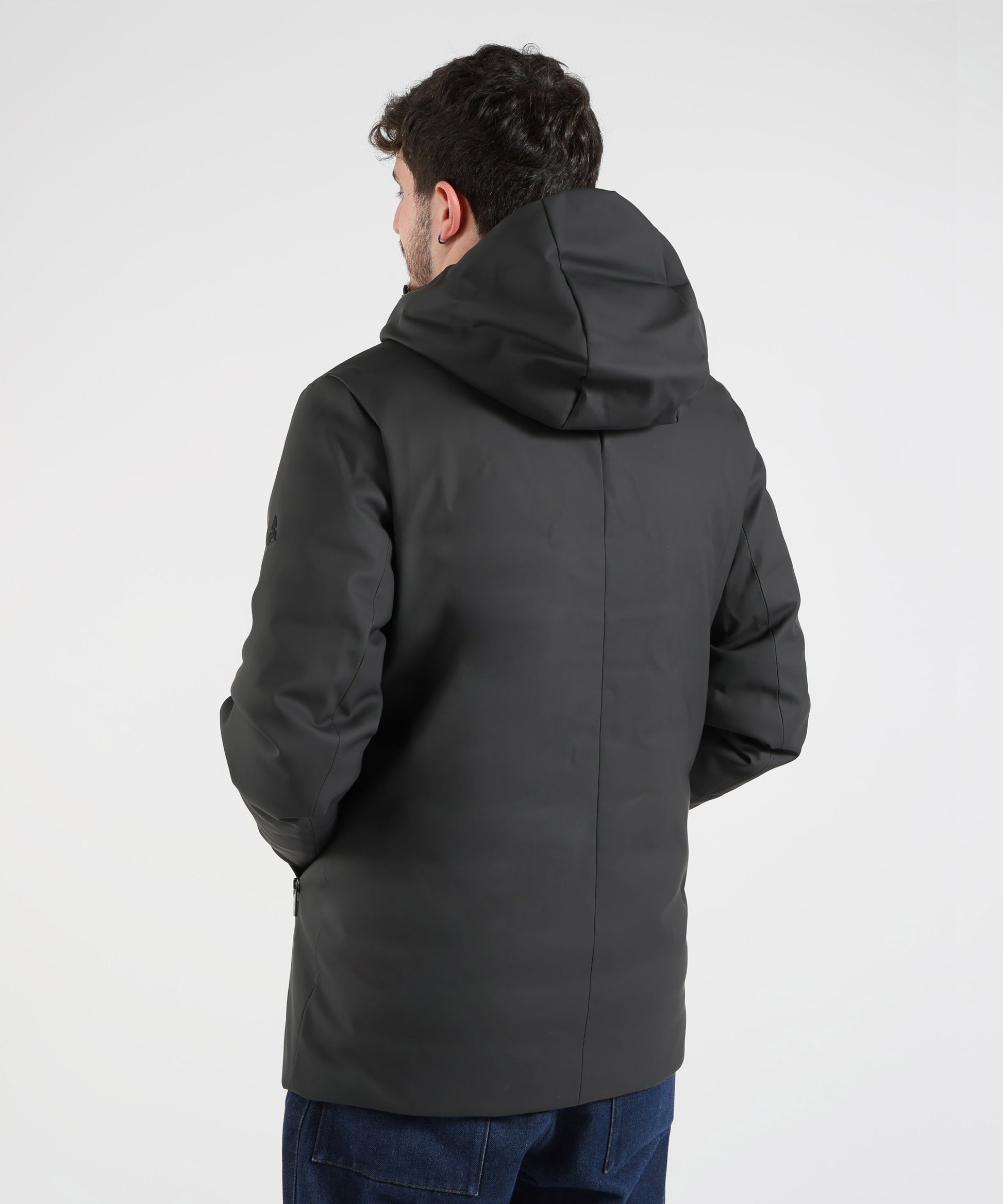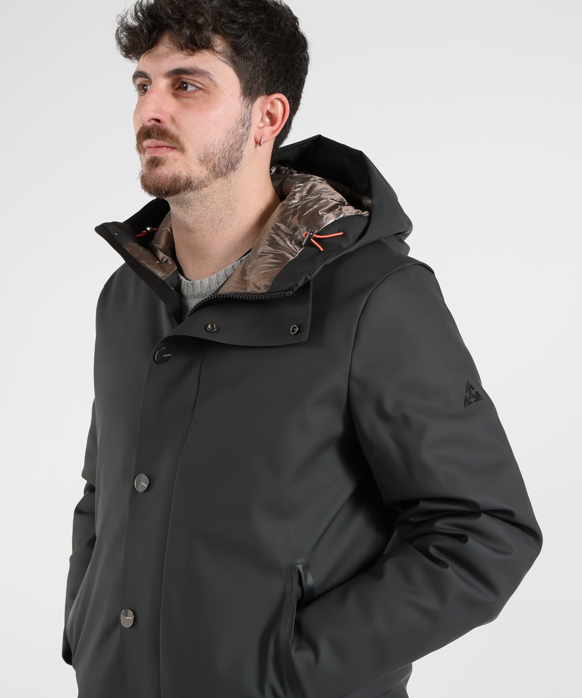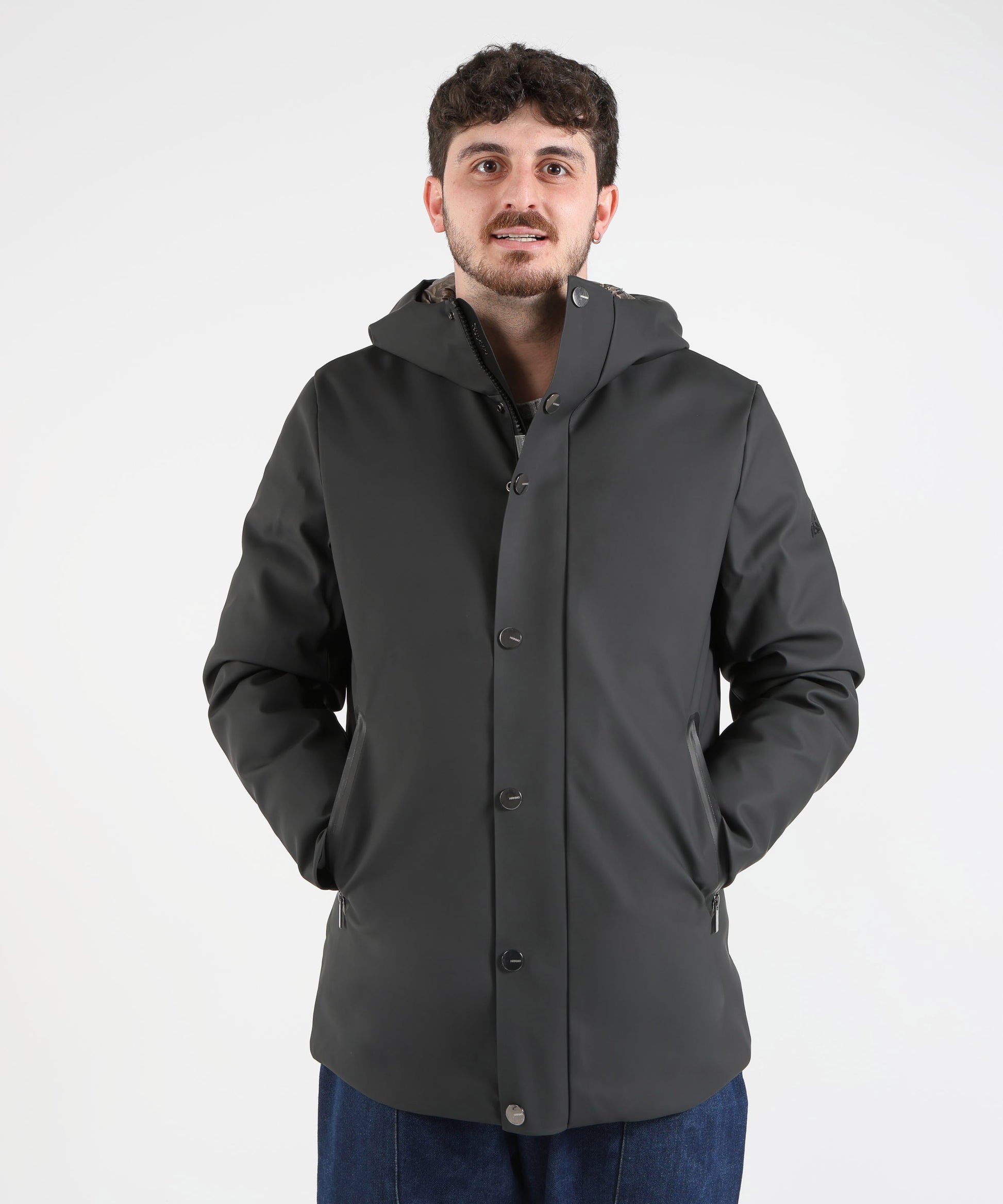 Giaccone uomo in tessuto tecnico dal design pratico e contemporaneo, ideale per affrontare le giornate più fredde con comfort e stile. Il modello è dotato di chiusura frontale con cerniera e bottoni a clip, che assicura protezione dal freddo e una vestibilità regolabile.