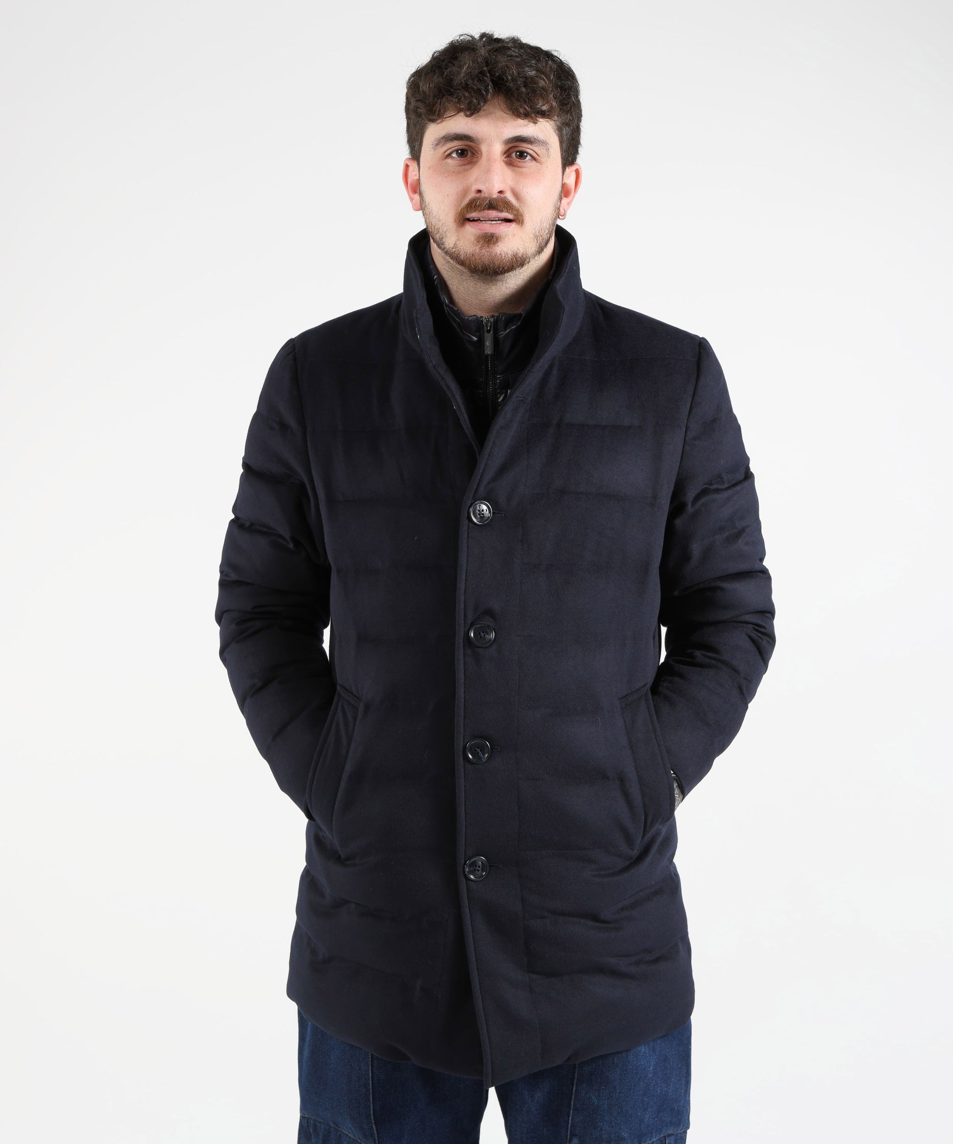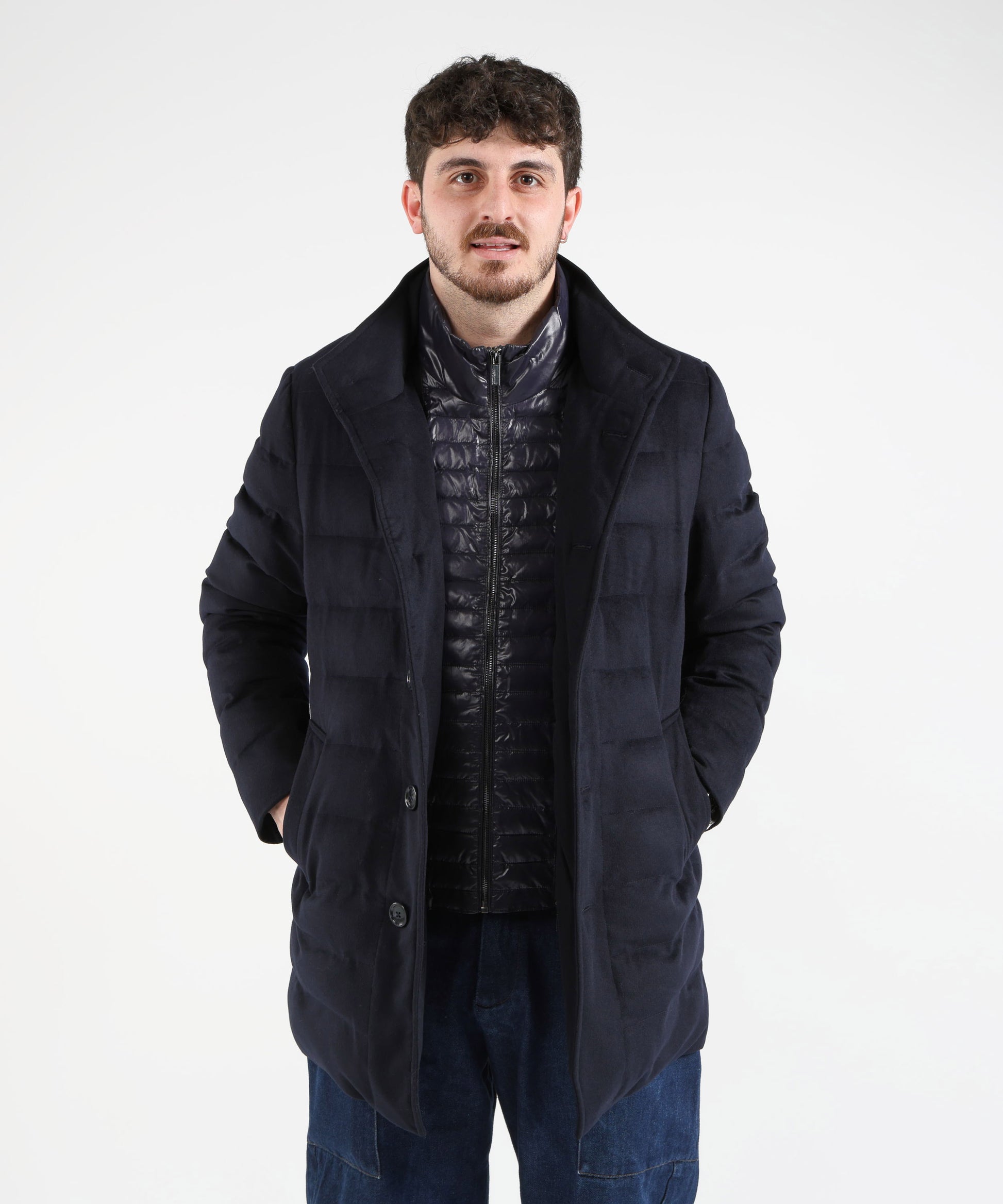 Giaccone tre quarti in tessuto trapuntato con gilet interno trapuntato removibile. Chiusura con bottoni, due tasche laterali e due tasche interne.