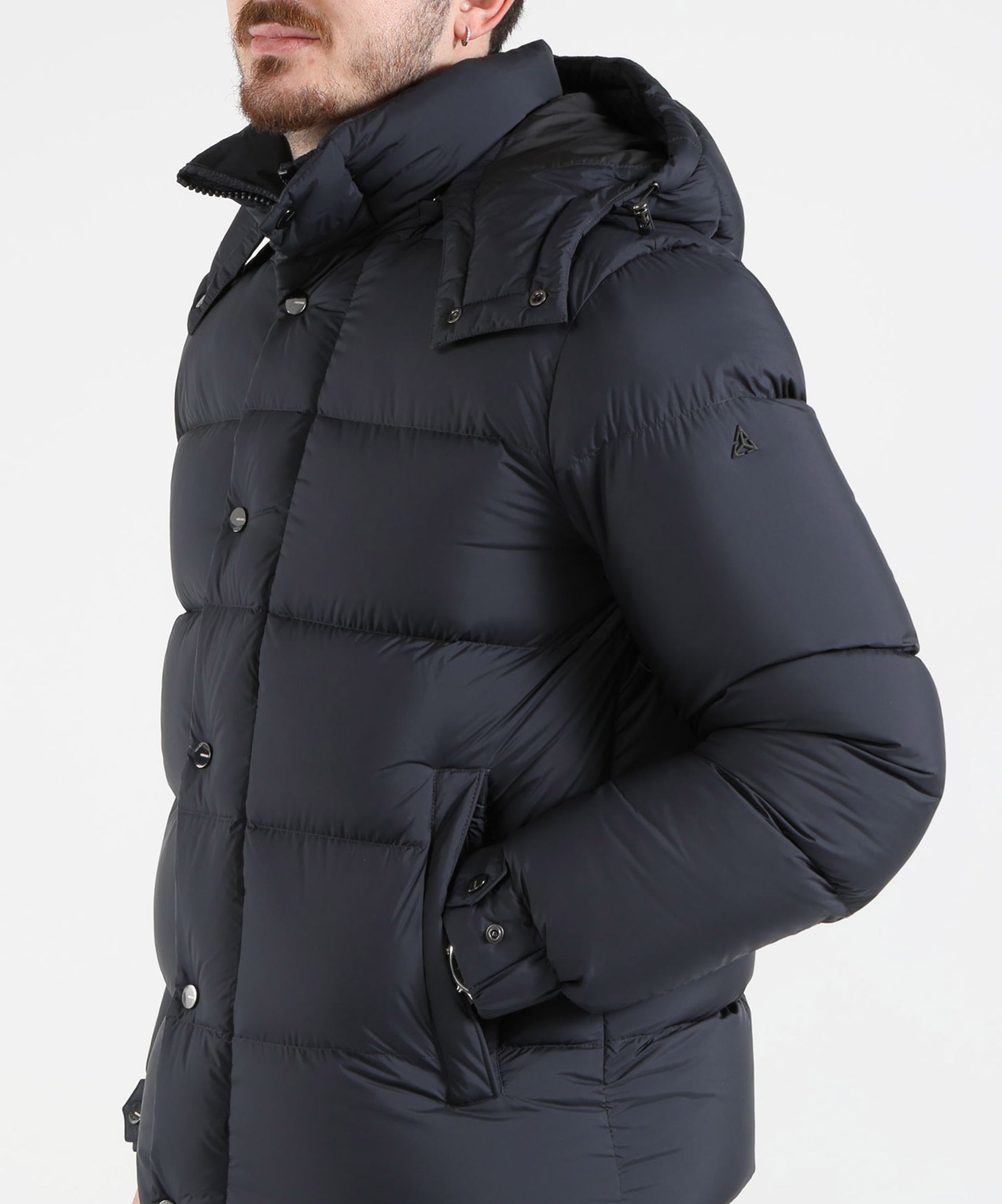 Giubbotto corto con zip e bottoni a clip, tasche laterali con cerniera, polsini regolabili, collo alto e cappuccio removibile. Dotato di due tasche interne, pratico e versatile.