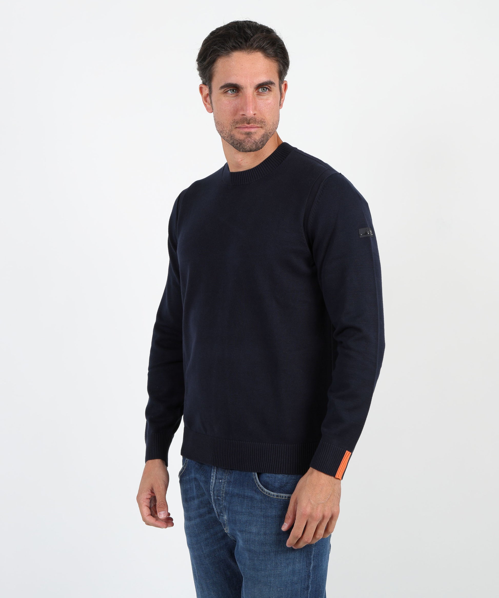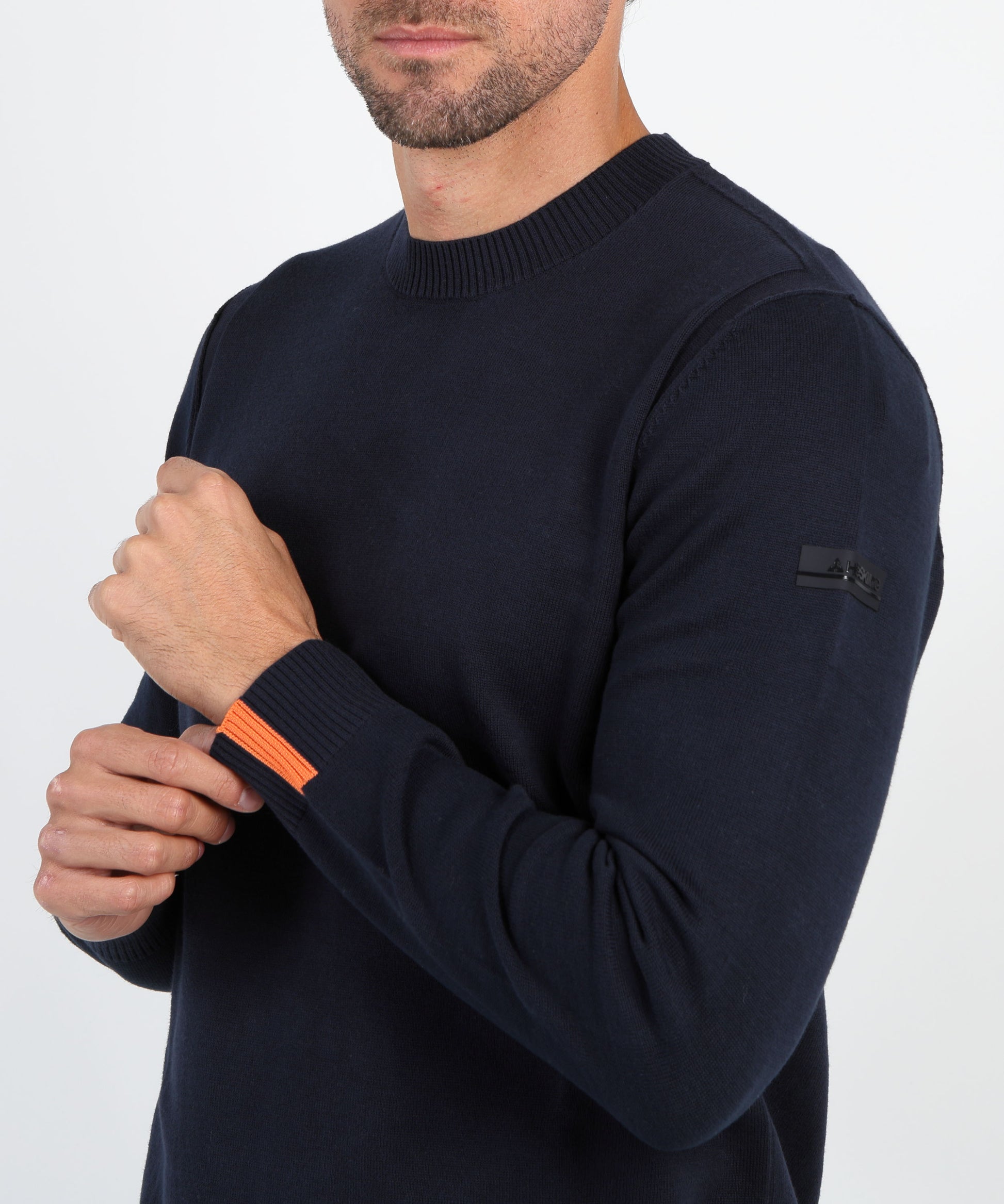 Maglia girocollo in tinta unita con vestibilità regolare, realizzata in morbido filato. Dettaglio distintivo dell’inserto arancione sul polso sinistro che aggiunge un tocco di stile contemporaneo.