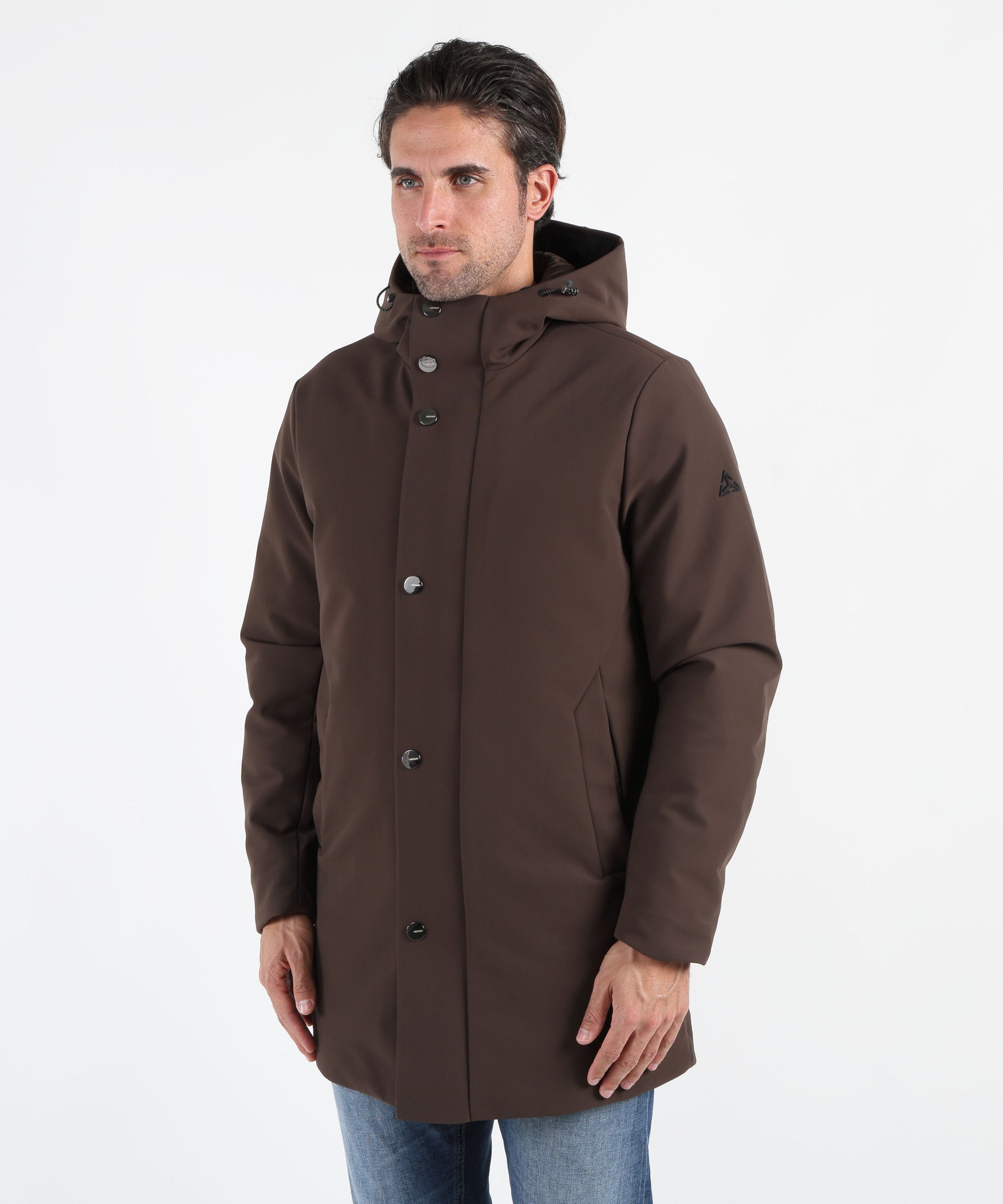 Parka da uomo con cappuccio, tasche laterali e chiusura zip/bottoni, imbottito con materiali eco-sostenibili per comfort, calore e stile responsabile.