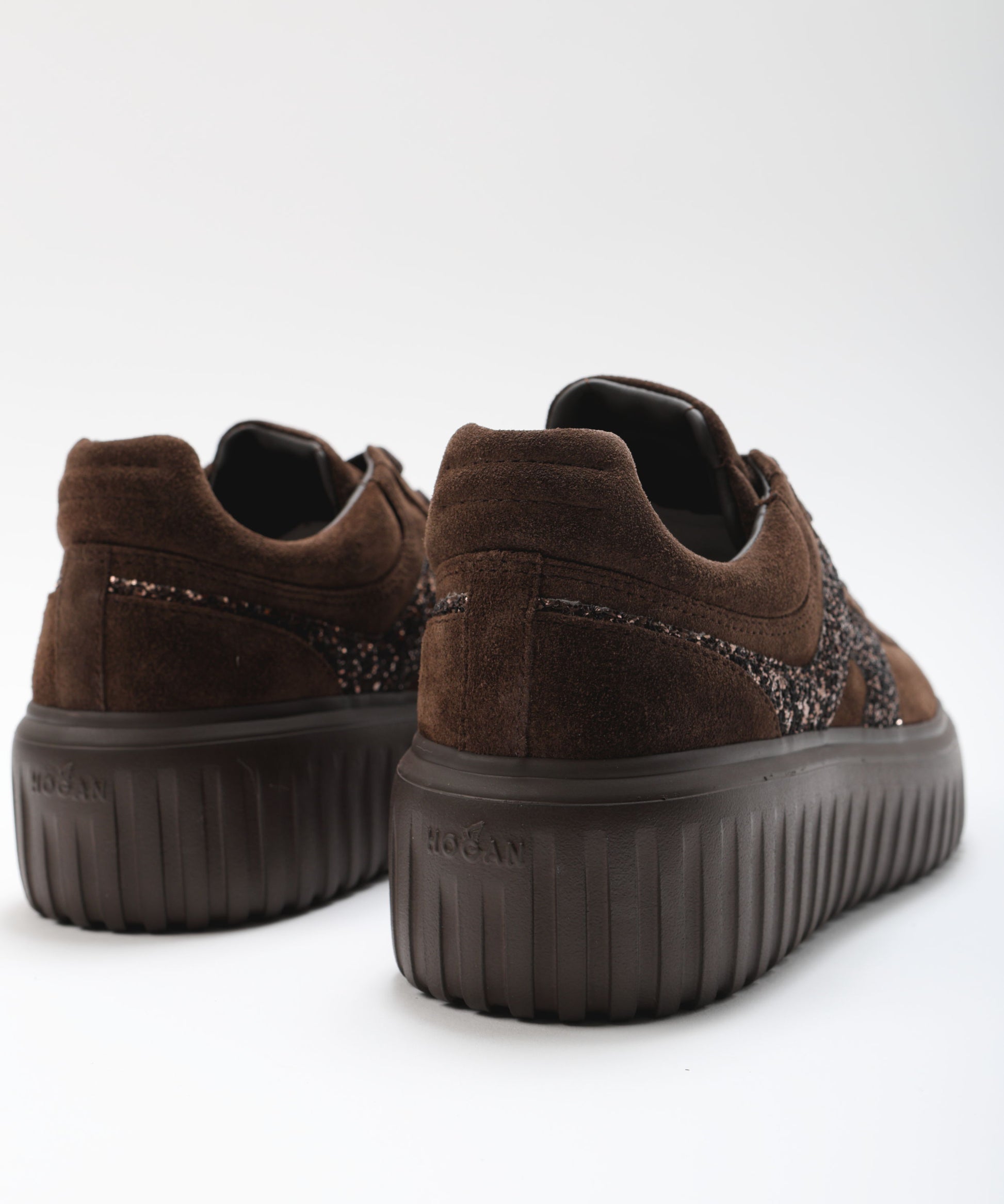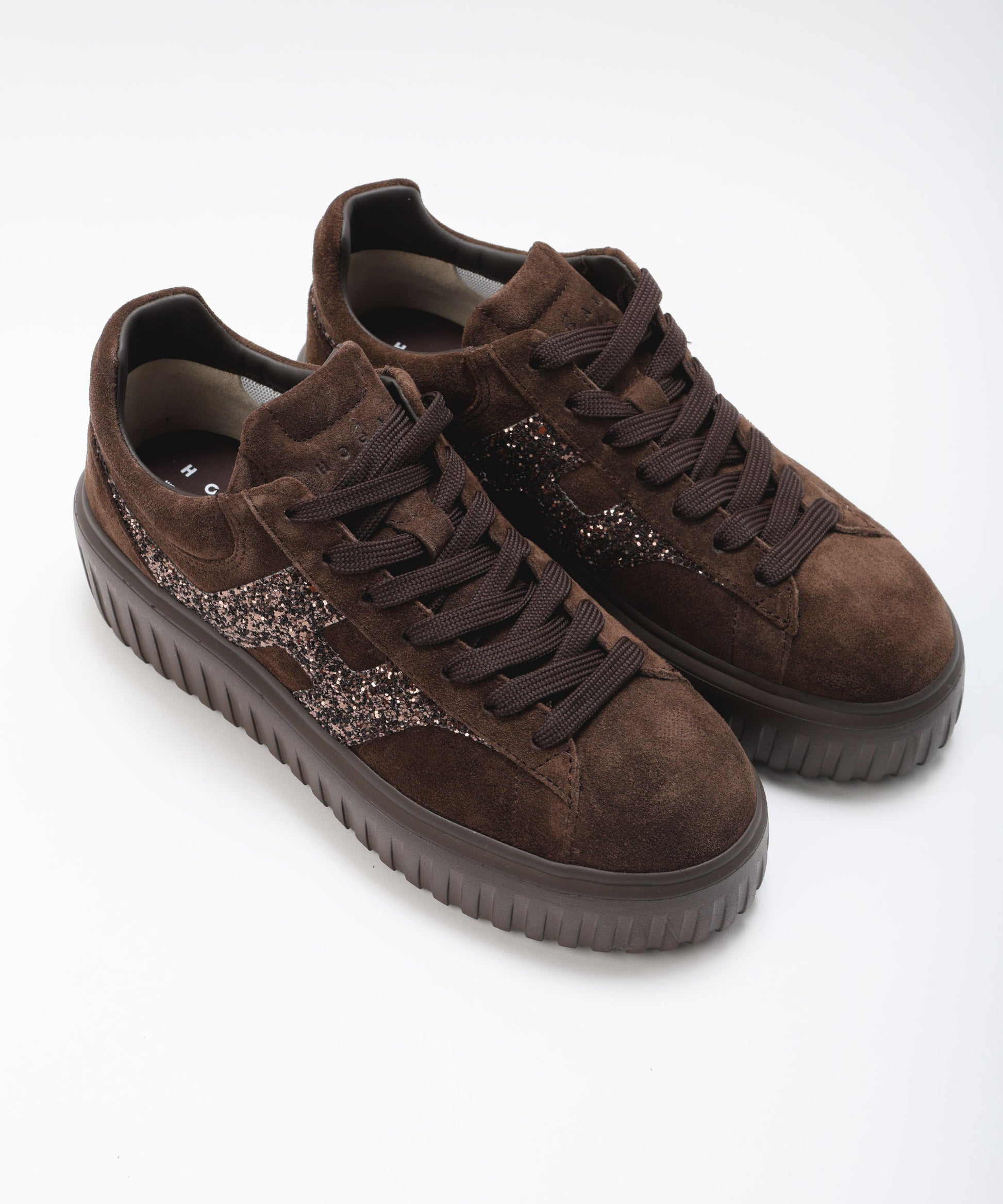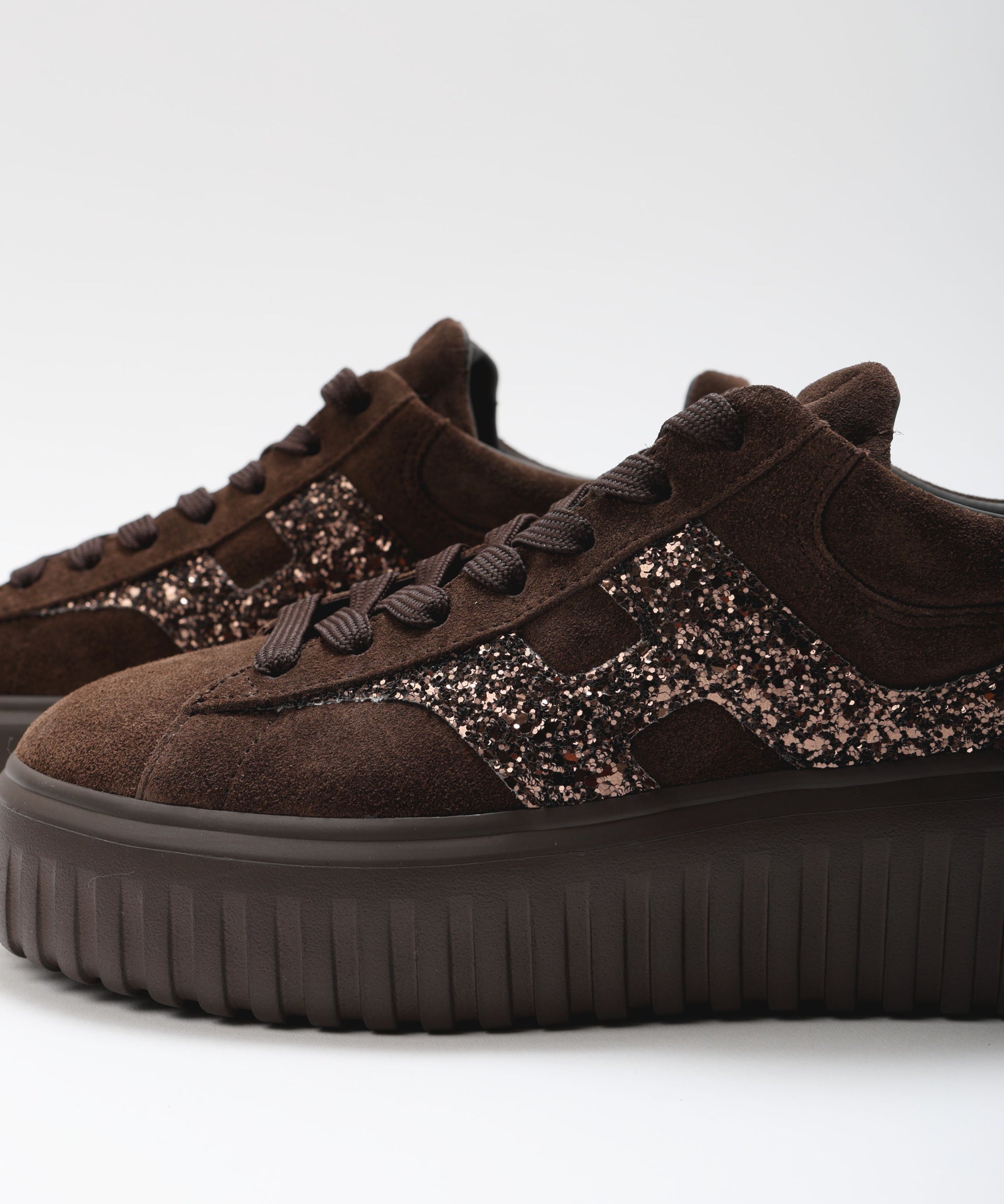 Sneakers in suede con logo Hogan decorato da paillettes su entrambi i lati e zeppa plateau a righe. Un mix perfetto tra stile brillante e comfort quotidiano.