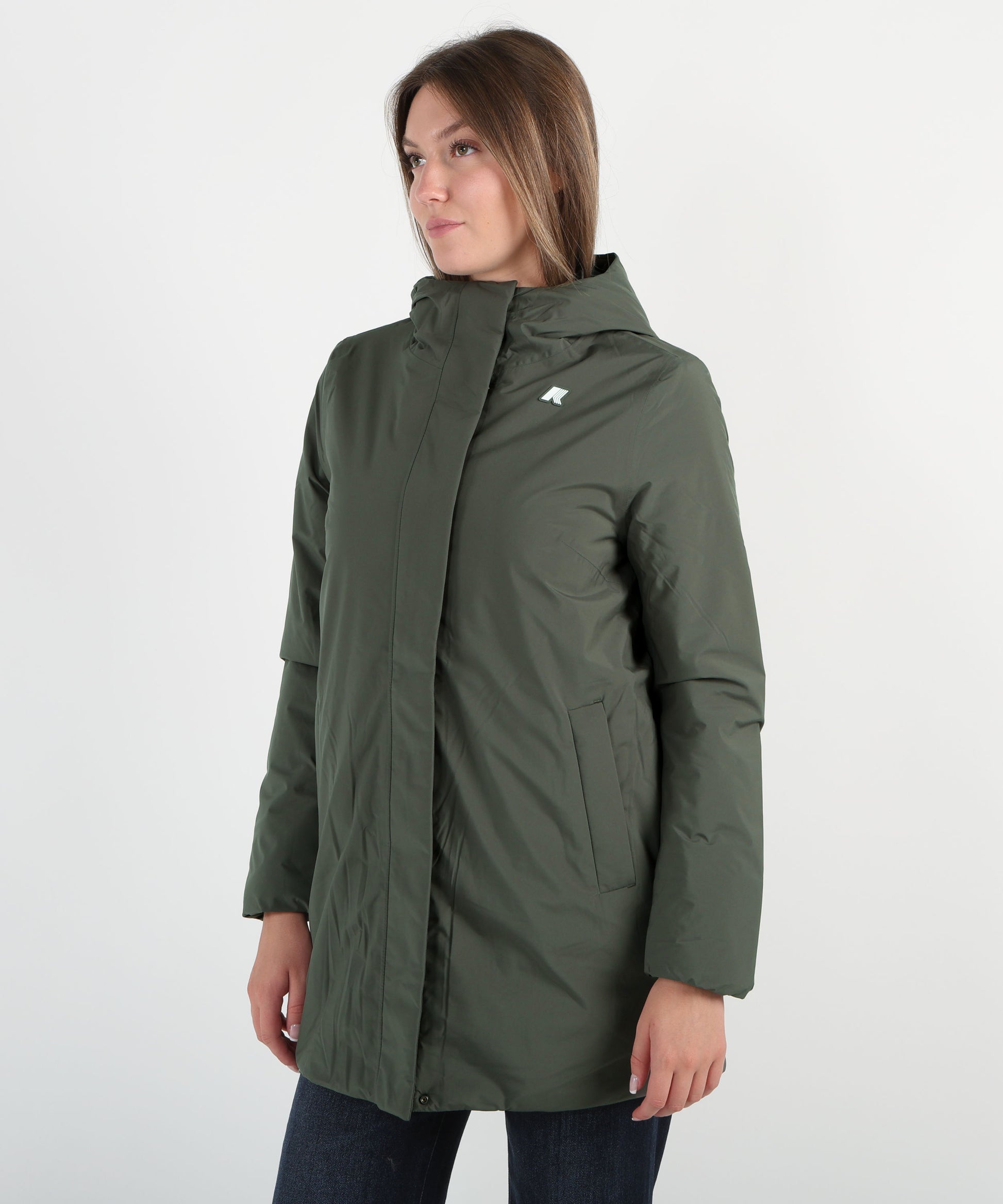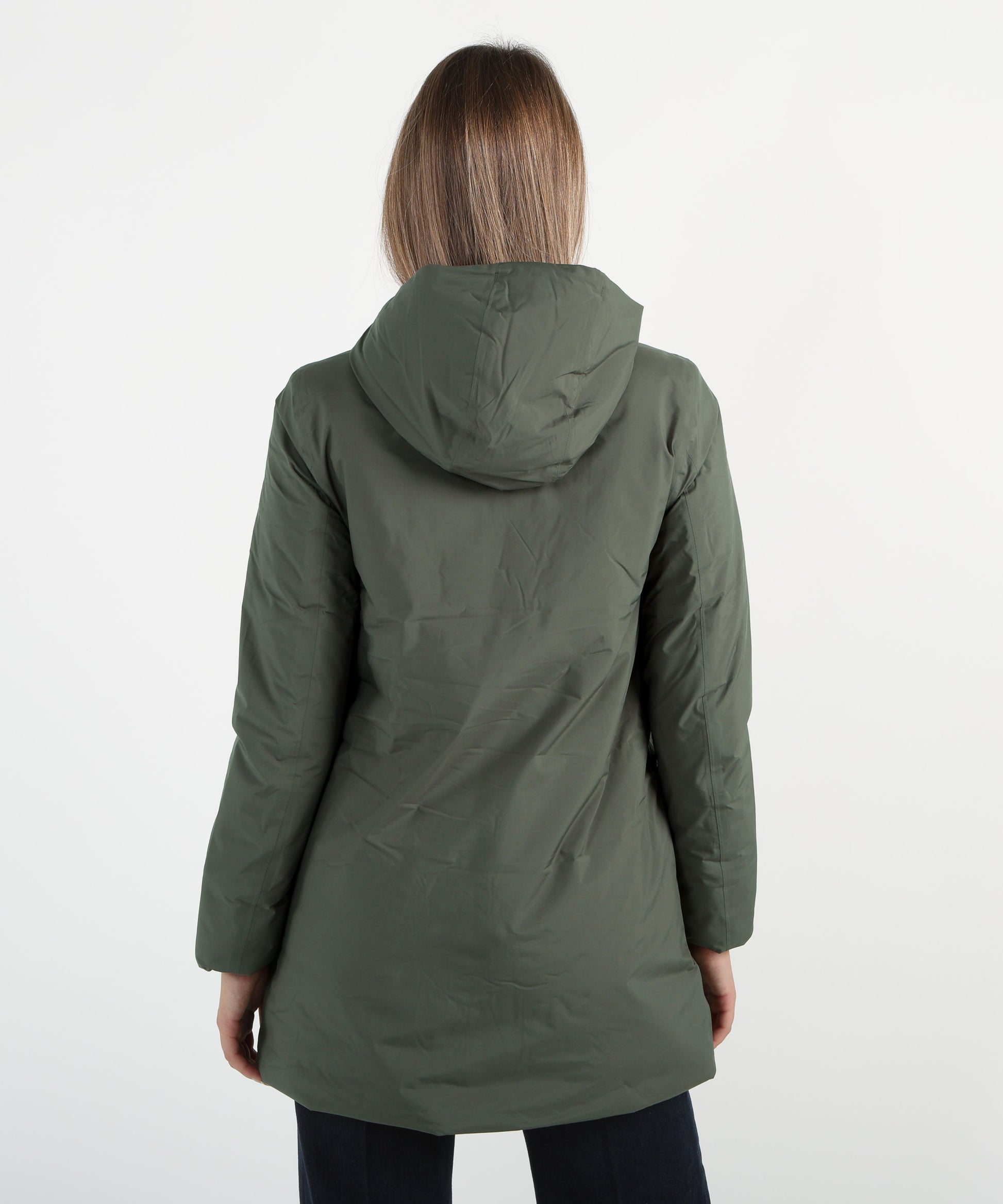 La chiusura con zip è completata dalla patta antivento, mentre l’orlo regolabile
