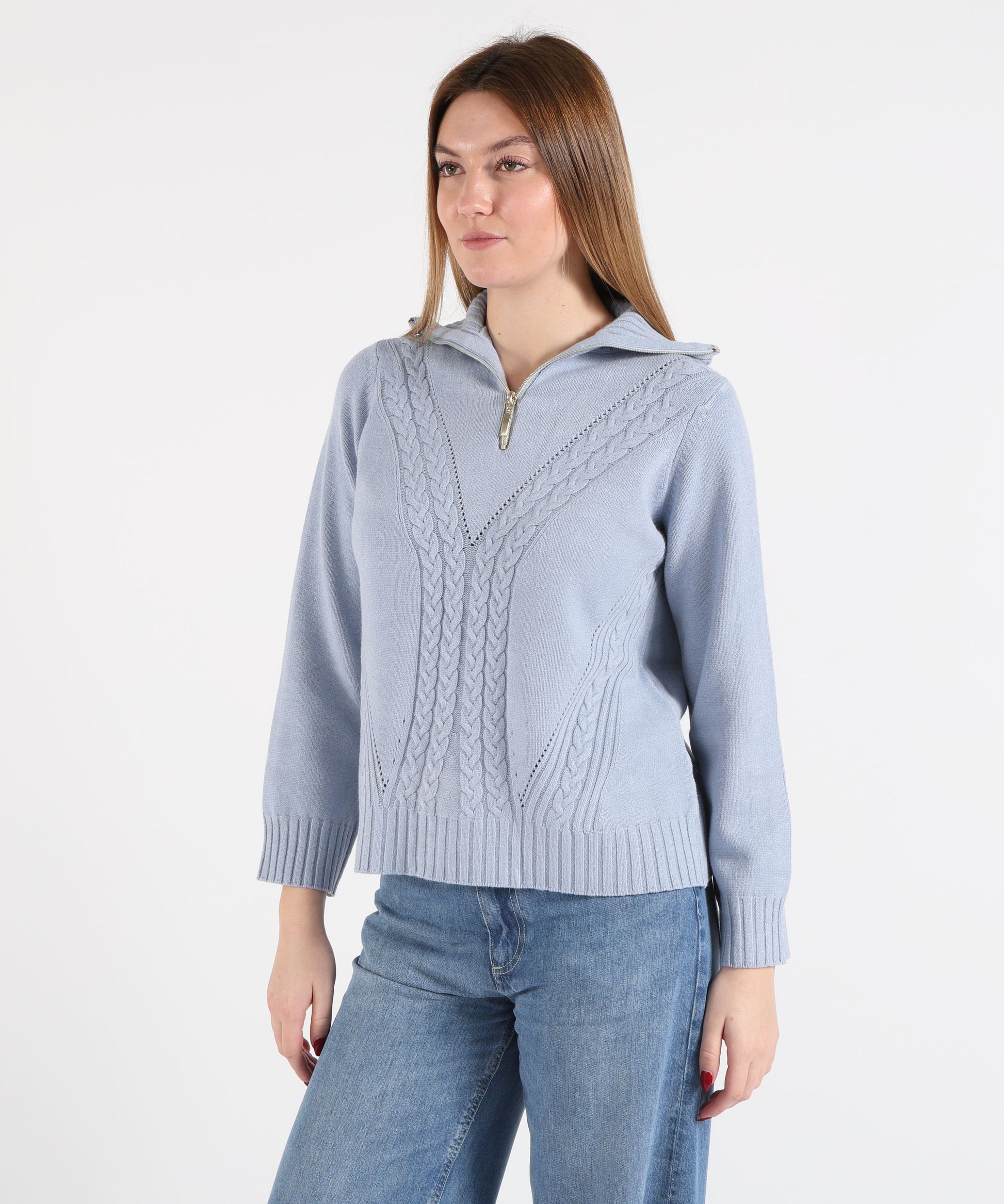 Questa maglia da donna dalla vestibilità ampia si distingue per l’elegante lavorazione a trecce sulla parte anteriore, che dona texture e carattere al capo. Il collo alto con zip aggiunge un tocco moderno e funzionale, permettendo di regolare l’apertura in base allo stile e al comfort desiderato.
