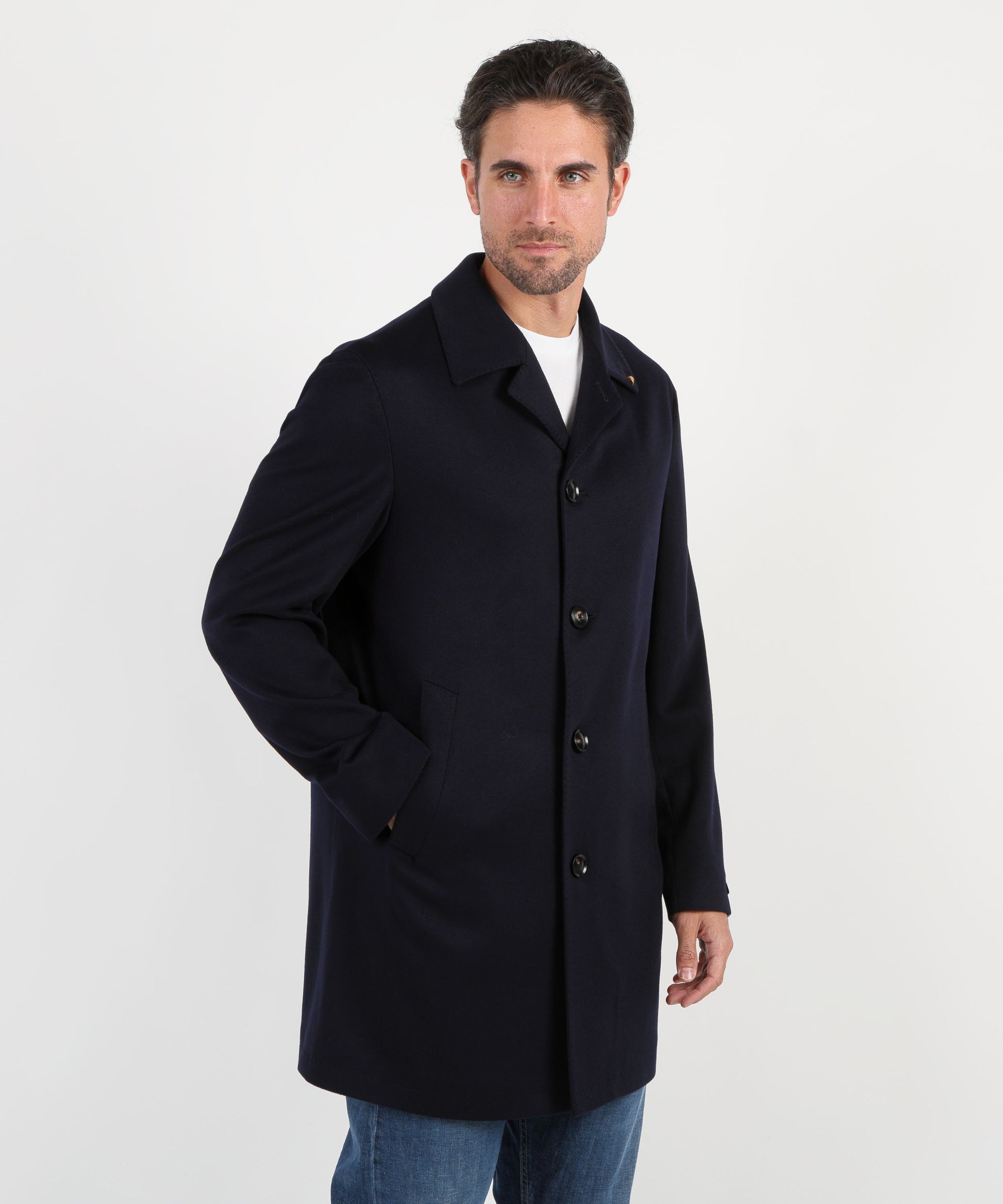 Cappotto classico dal gusto inglese, caratterizzato da chiusura frontale a cinque bottoni, collo a rever e tasche laterali a filetto. Realizzato in tessuto caldo e strutturato, con fodera interna per un comfort ottimale. Elegante e versatile, perfetto per look formali o smart-casual.