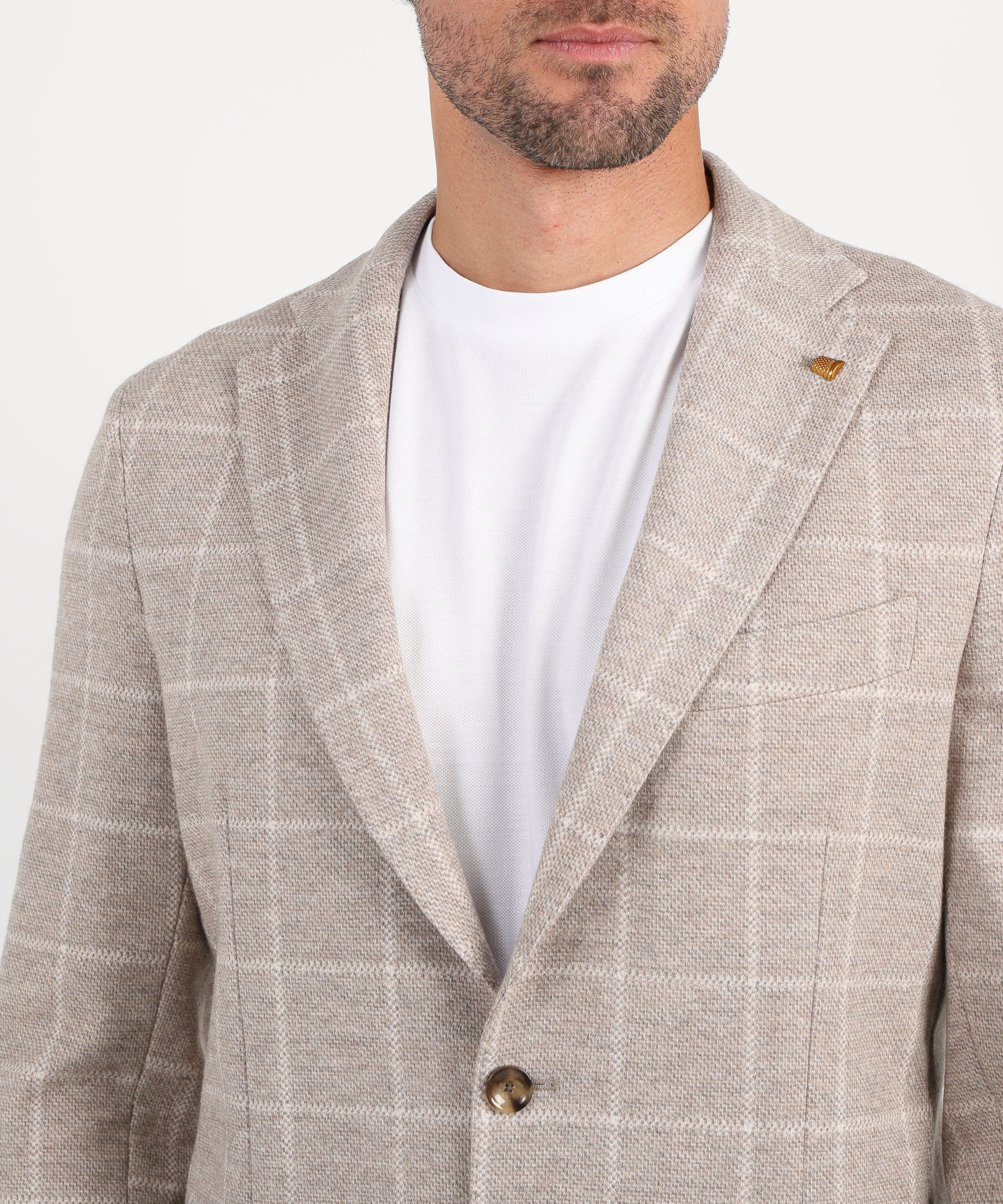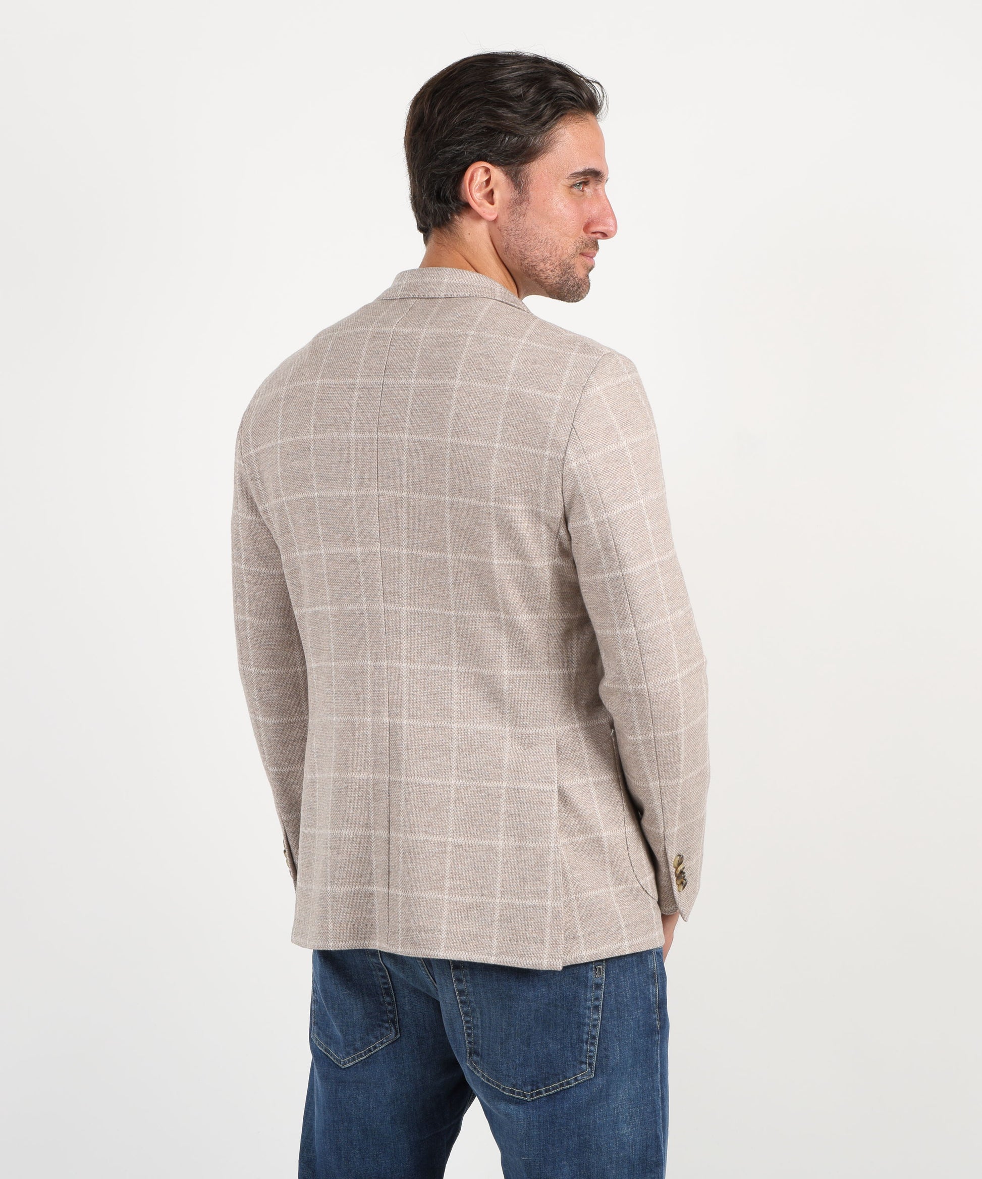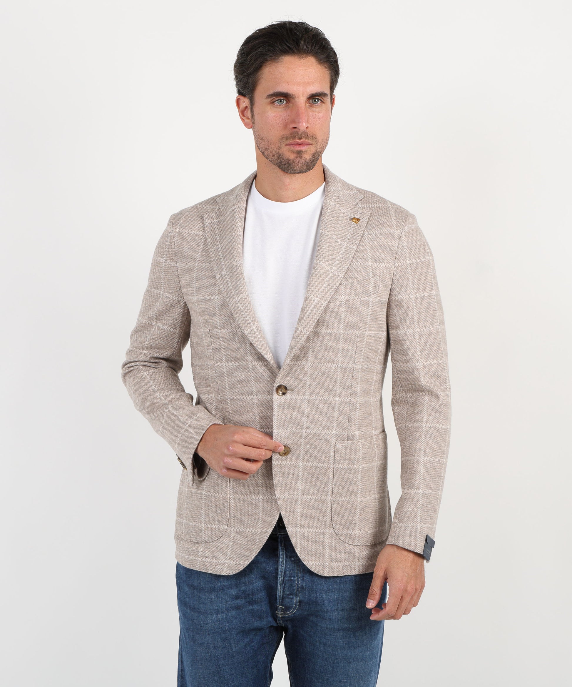 Giacca due bottoni a quadri azzurri Giacca dal taglio moderno e raffinato, realizzata in tessuto a disegno quadro azzurro che aggiunge un tocco di stile distintivo al look maschile. Il modello presenta rever classico, chiusura a due bottoni e tasche a toppa, con una costruzione leggera e confortevole che garantisce una vestibilità naturale. Perfetta per outfit formali o casual chic, da abbinare a pantaloni in tinta unita o denim per un’eleganza disinvolta.