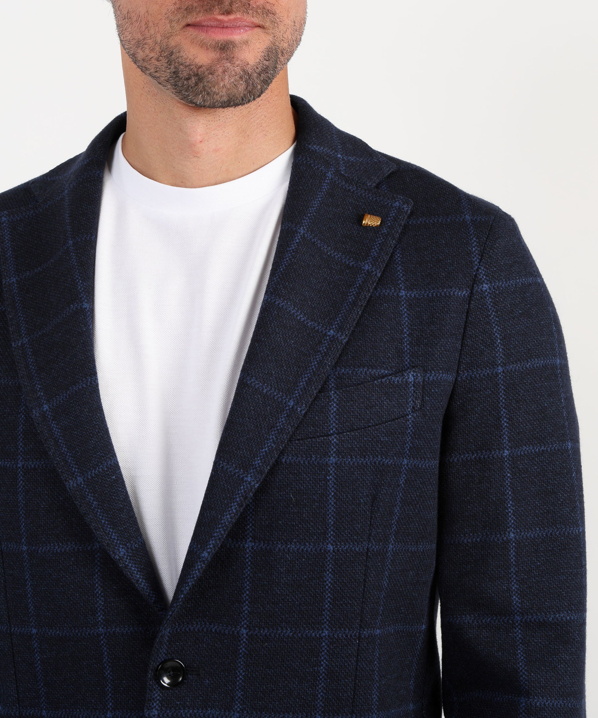 Giacca due bottoni a quadri azzurri Giacca dal taglio moderno e raffinato, realizzata in tessuto a disegno quadro azzurro che aggiunge un tocco di stile distintivo al look maschile. Il modello presenta rever classico, chiusura a due bottoni e tasche a toppa, con una costruzione leggera e confortevole che garantisce una vestibilità naturale. Perfetta per outfit formali o casual chic, da abbinare a pantaloni in tinta unita o denim per un’eleganza disinvolta.