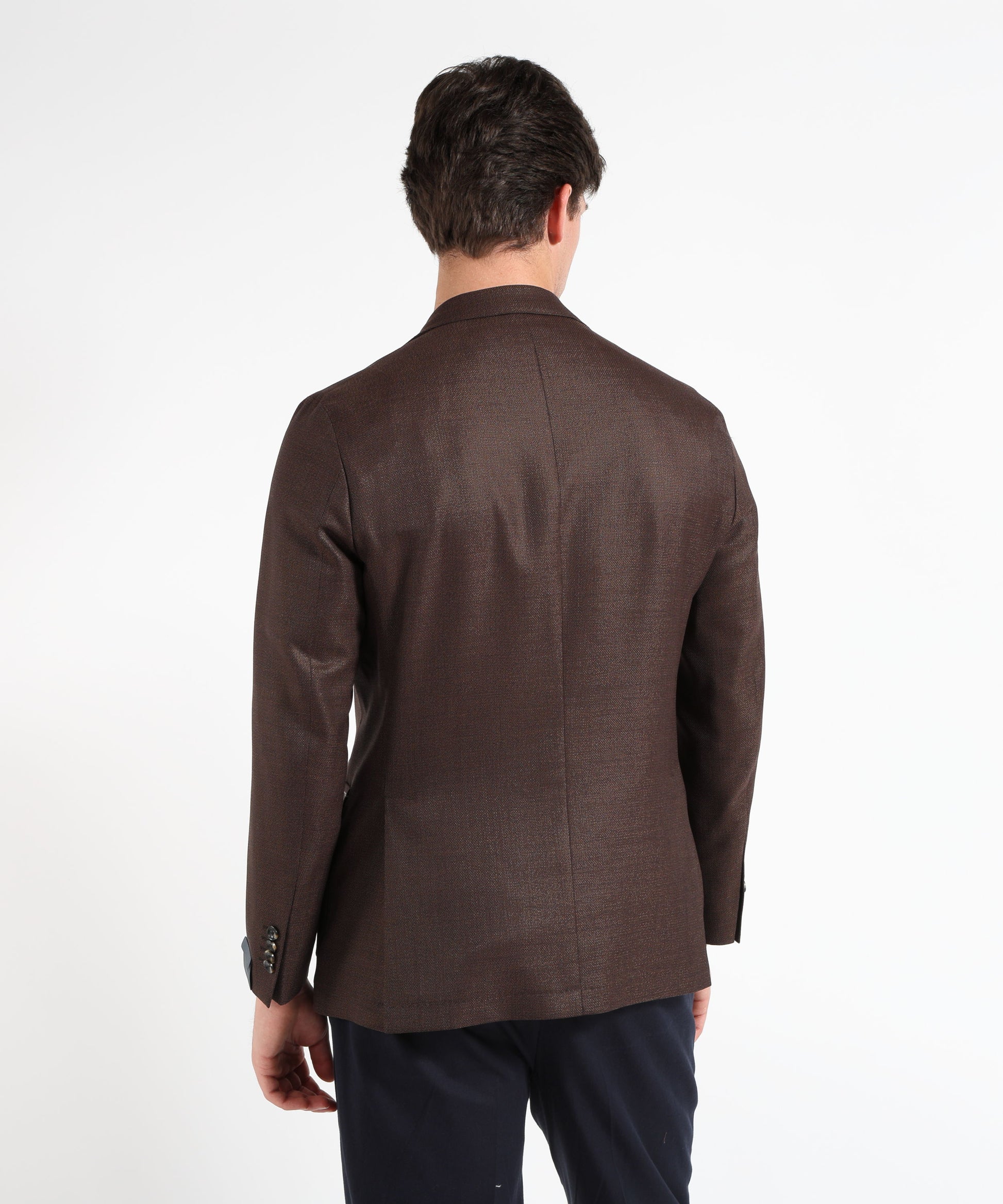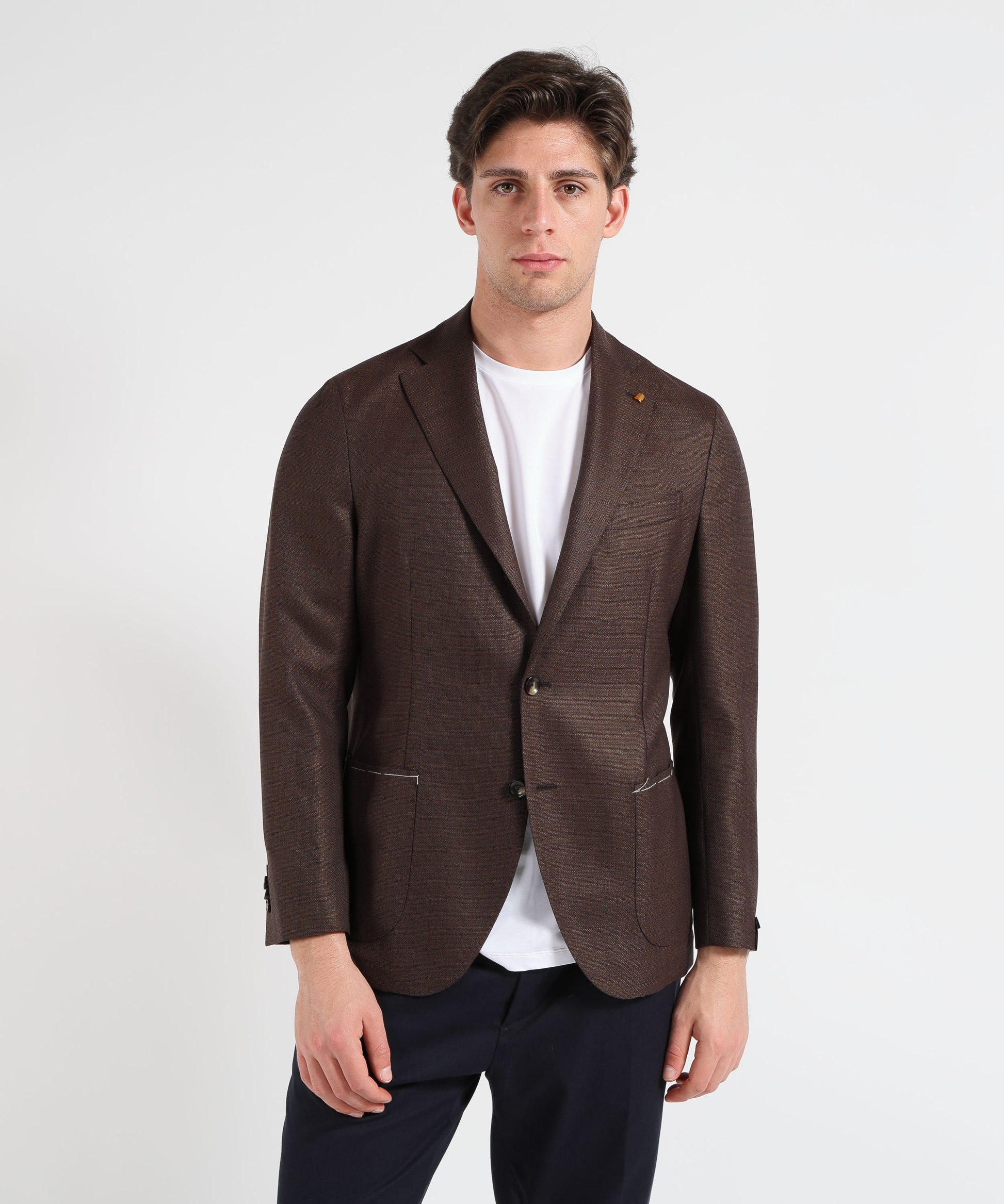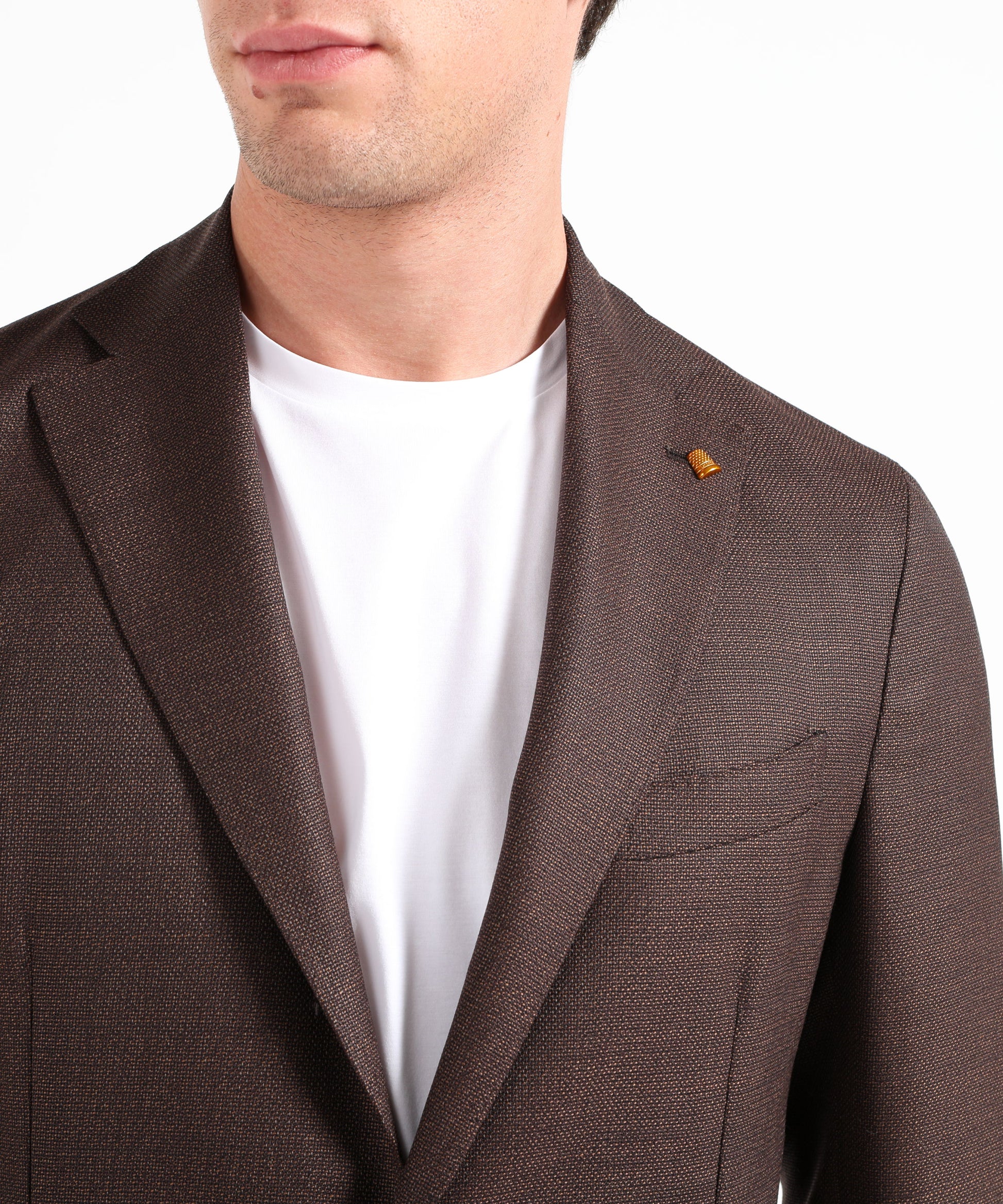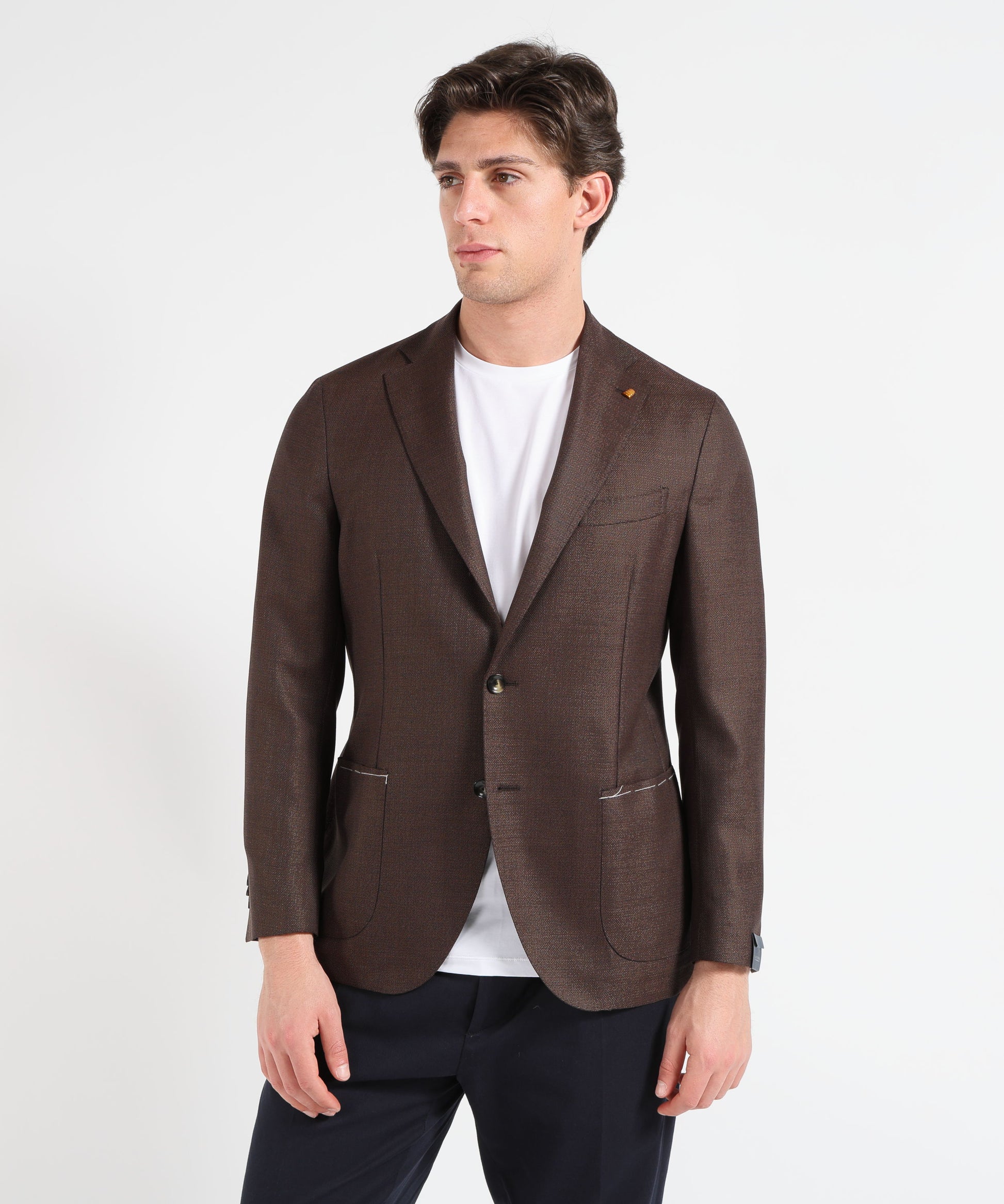Giacca sfoderata a due bottoni in tessuto Travel effetto armaturato, con tasche a toppa e spacchi laterali per vestibilità comoda e look elegante e versatile, ideale anche per chi viaggia.