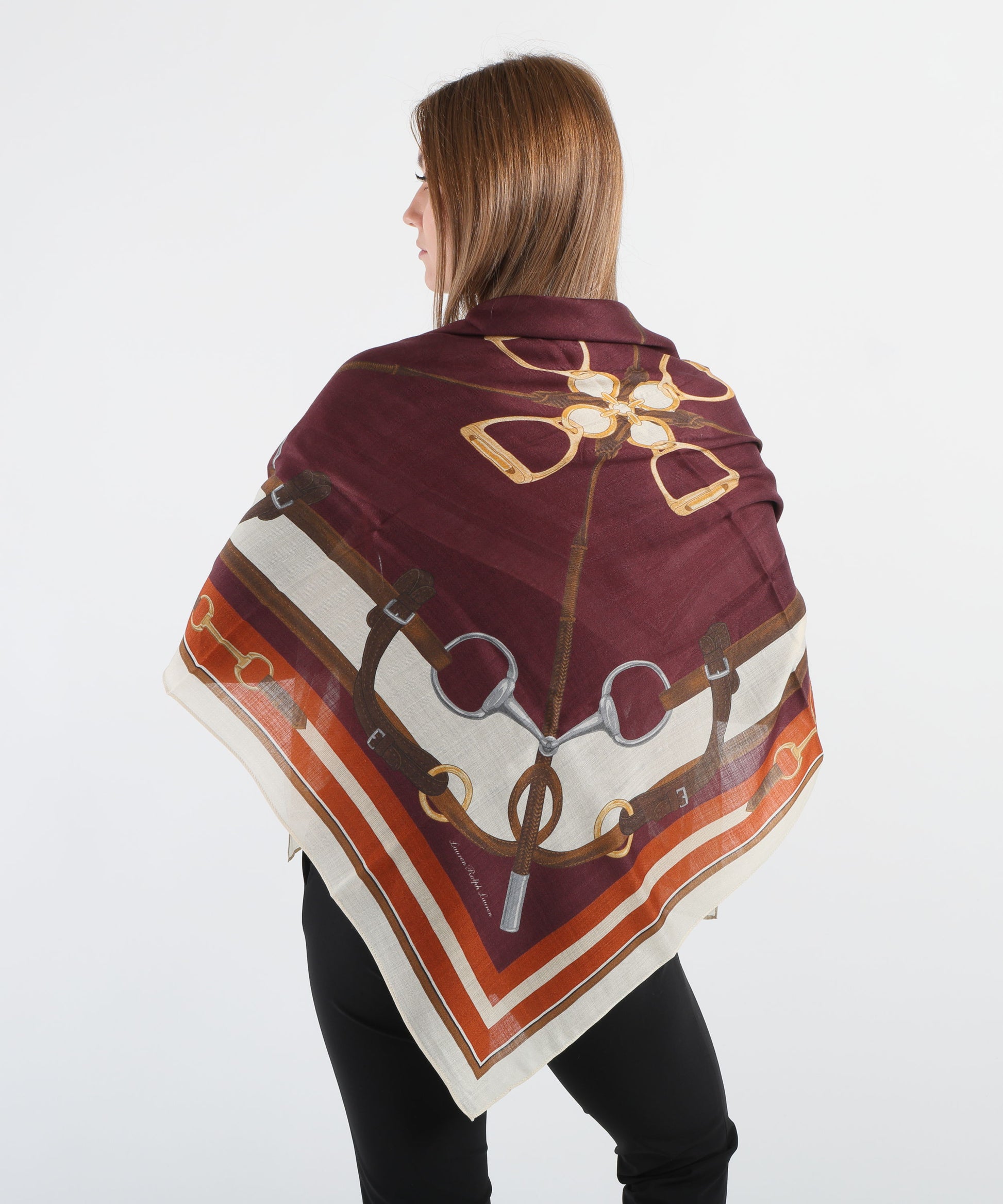 Sciarpa squadrata con fantasia cavallerizza, elegante e versatile. Tessuto morbido e leggero, perfetta da indossare al collo o come accessorio distintivo per ogni outfit.