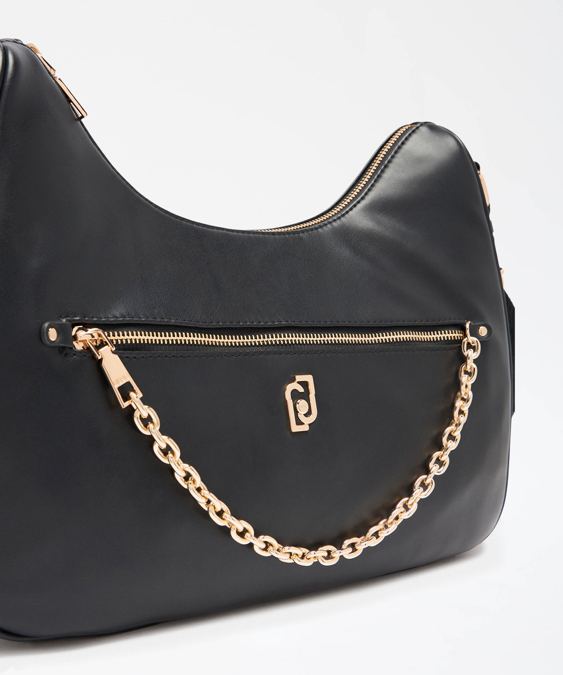 Borsa a spalla in ecopelle dal design morbido con tracolla larga logata e tasca frontale con zip e catena. Include mini borsellino coordinato con logo stampato, elegante e versatile.