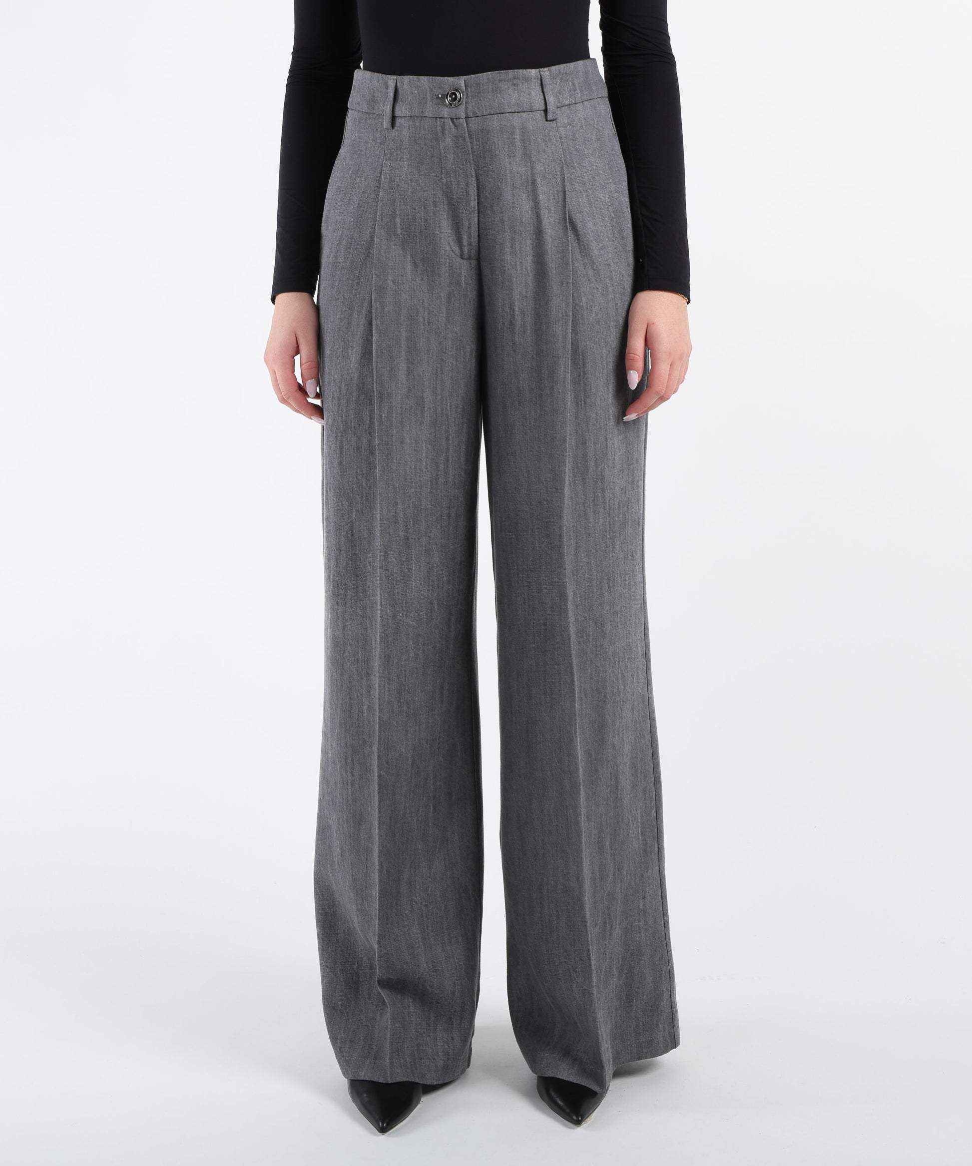Pantaloni in denim di lyocell a vita alta con pinces e piega stirata, gamba flare. Tasche sui fianchi e tasca a filetto sul retro, chiusura con bottone e zip nascosta per un look elegante e moderno.