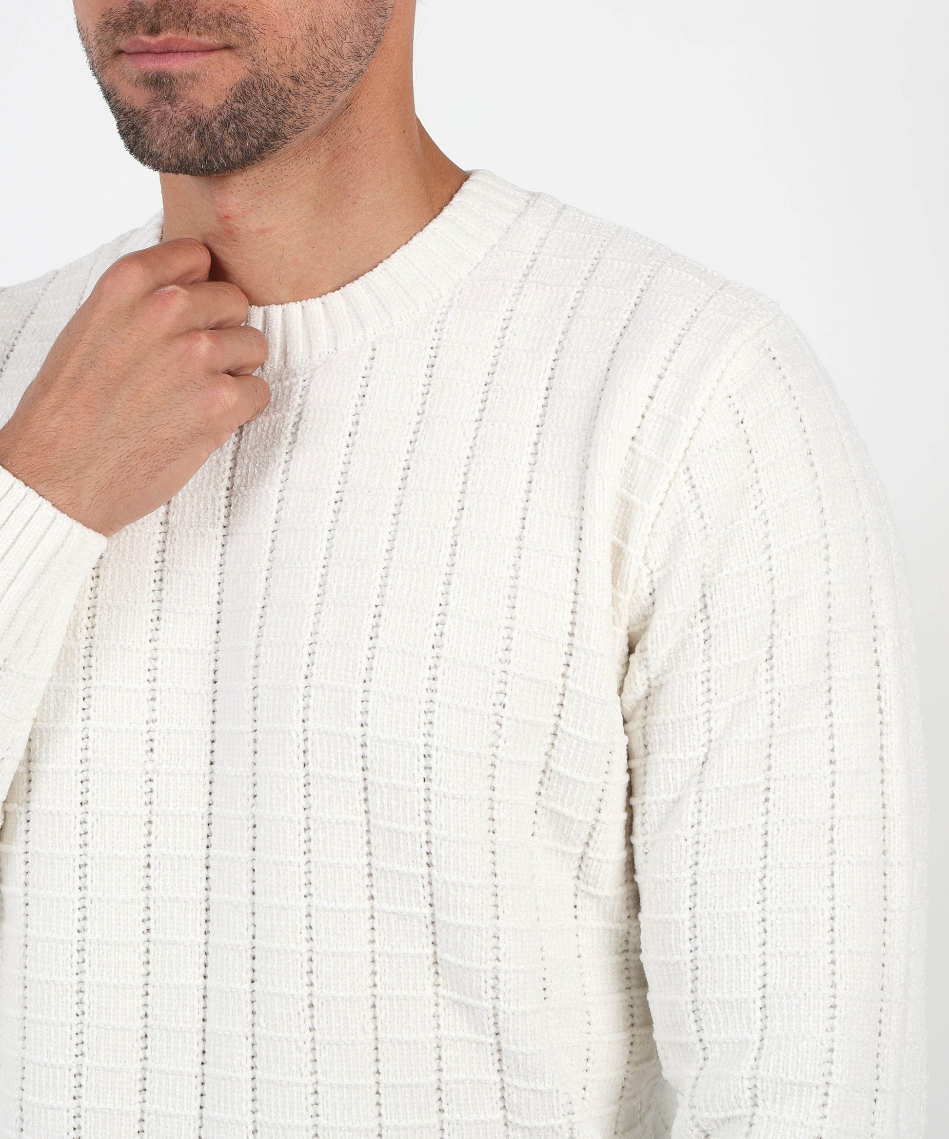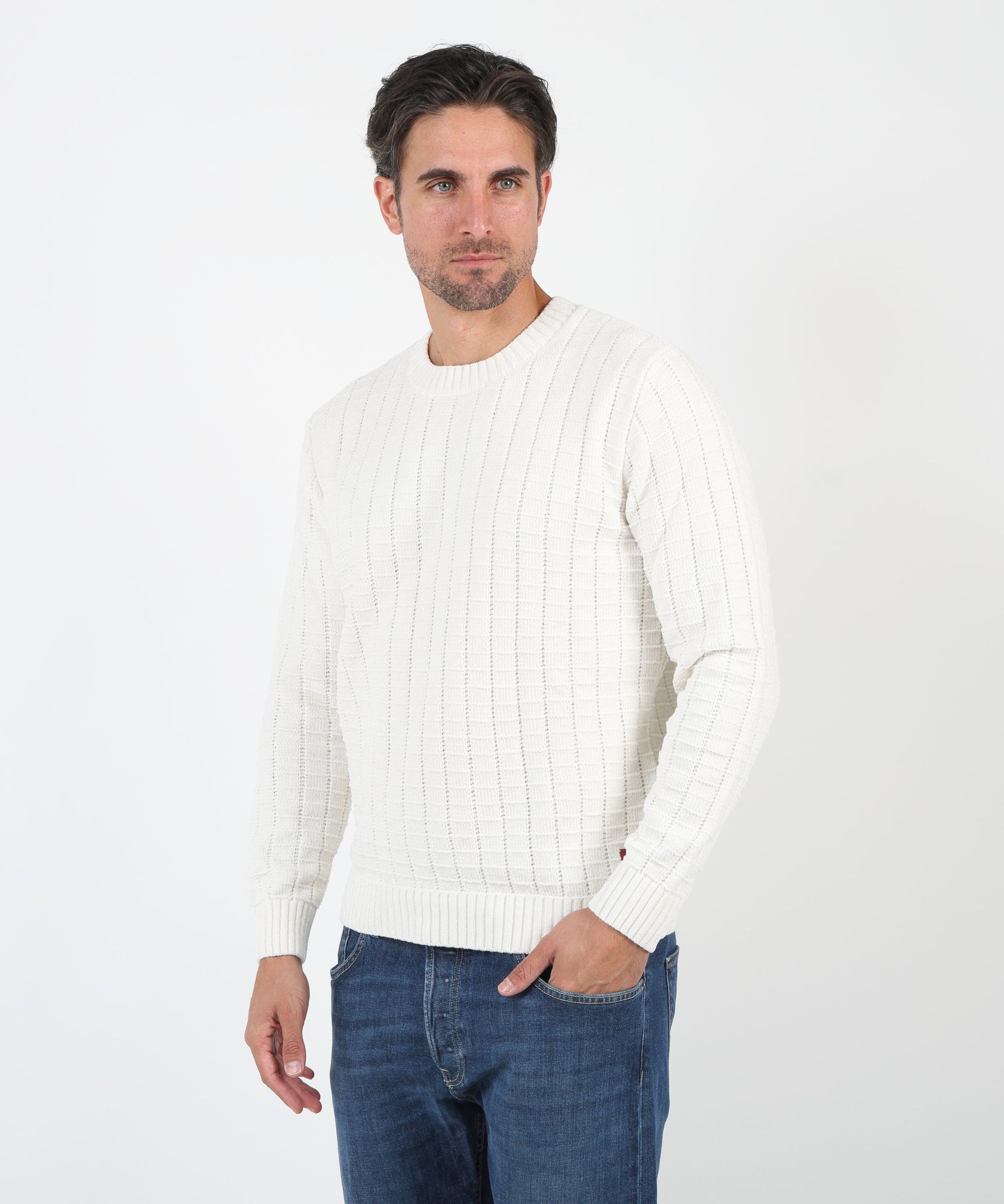 Maglia girocollo realizzata in morbido filato lavorato a intarsi, che dona al capo un effetto grafico raffinato e contemporaneo. Il design essenziale è arricchito dalla lavorazione a contrasto, espressione di artigianalità e cura del dettaglio. Le maniche lunghe e le finiture a coste su collo, polsi e fondo assicurano comfort e una vestibilità regolare.