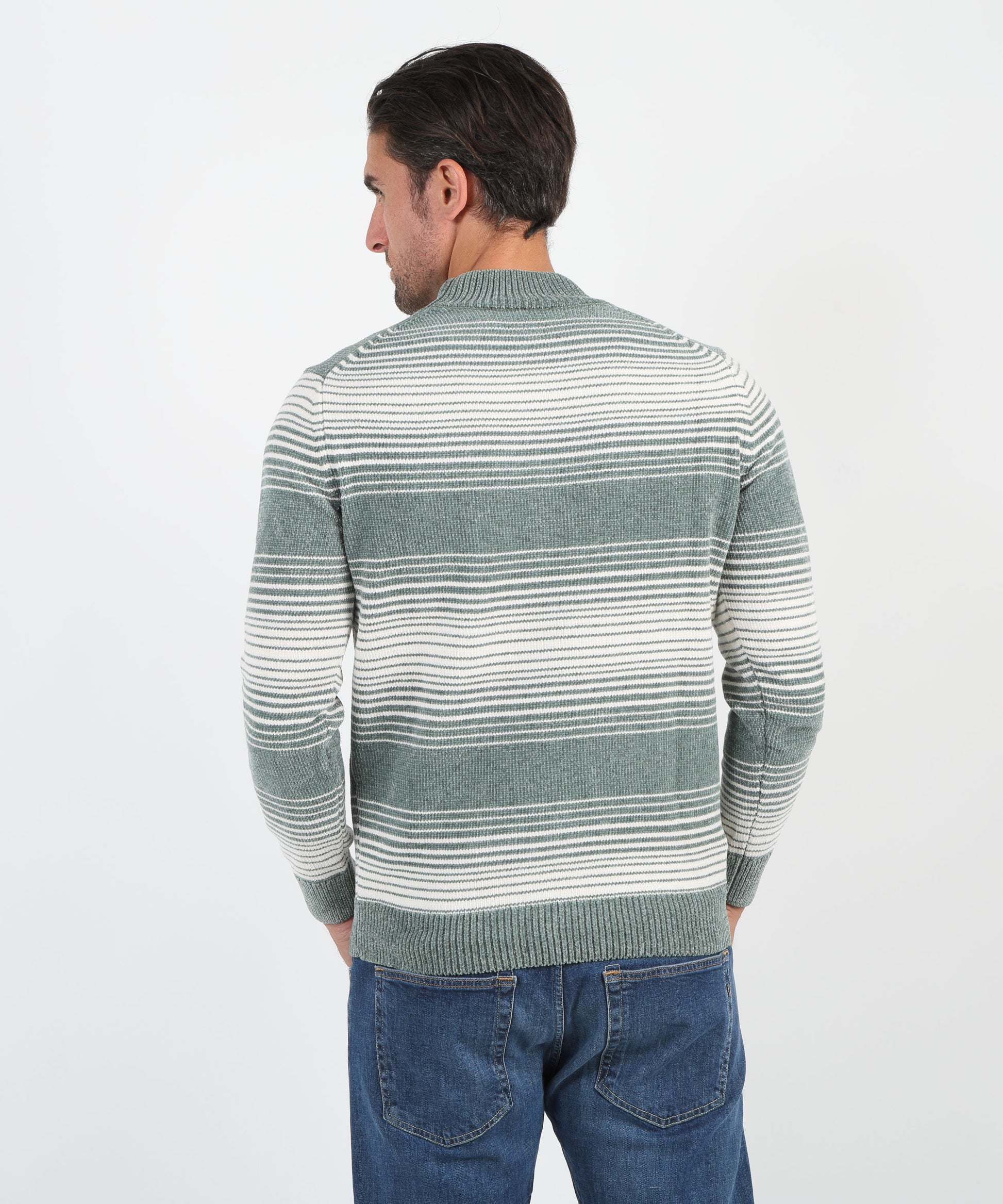 Maglione Bianco e Verde in Ciniglia con Motivo Jacquard a Righe