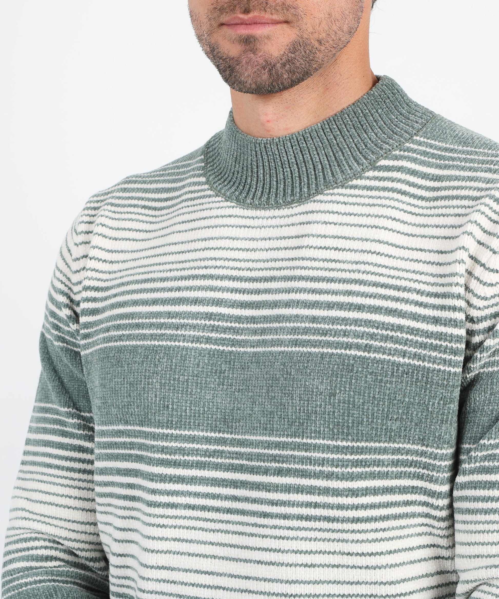 Un capo sofisticato e confortevole, questo maglione in ciniglia combina morbidezza e stile intramontabile. Il motivo jacquard a righe bianche e verdi dona profondità e carattere, rendendolo perfetto per look casual chic e contemporanei.