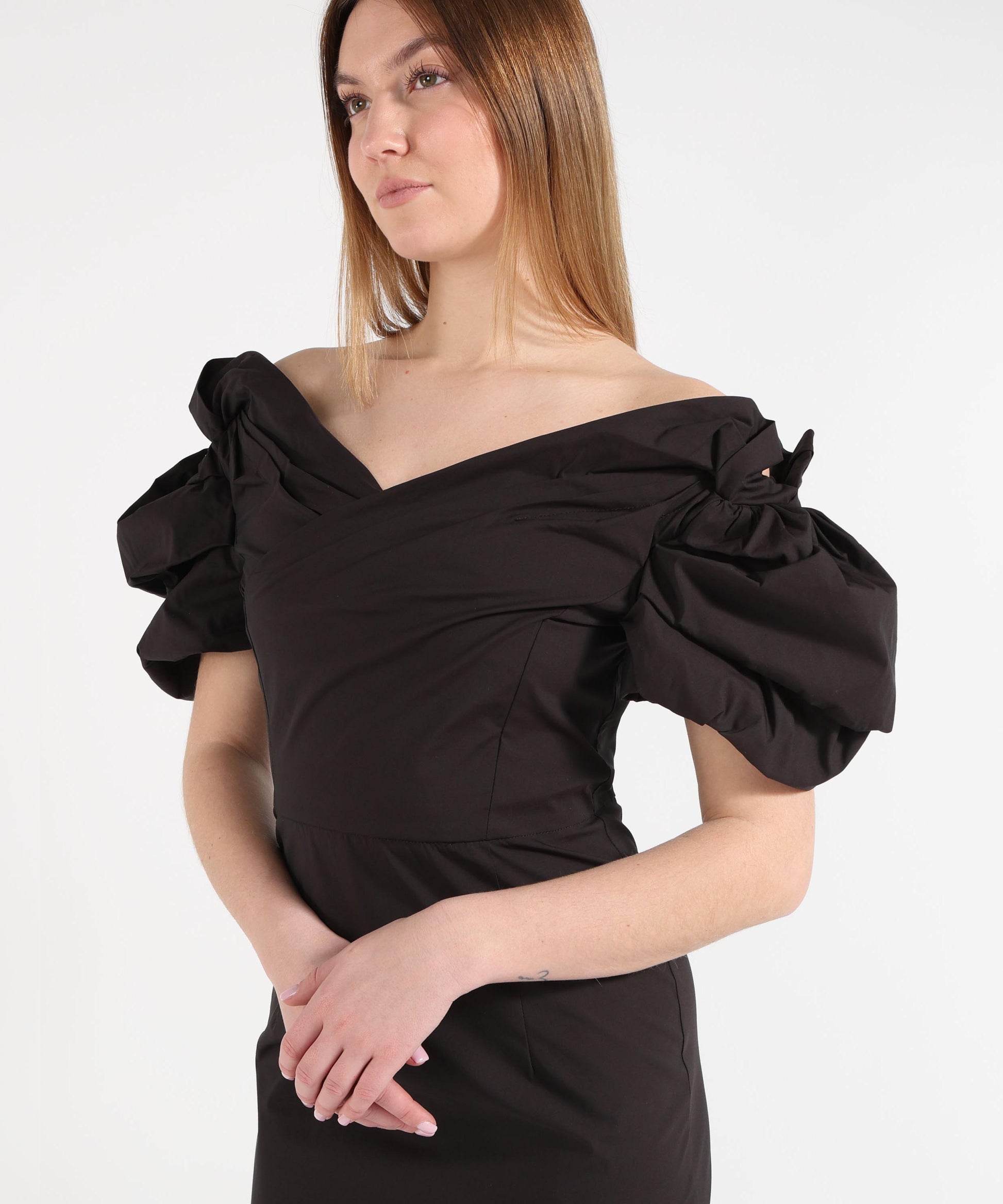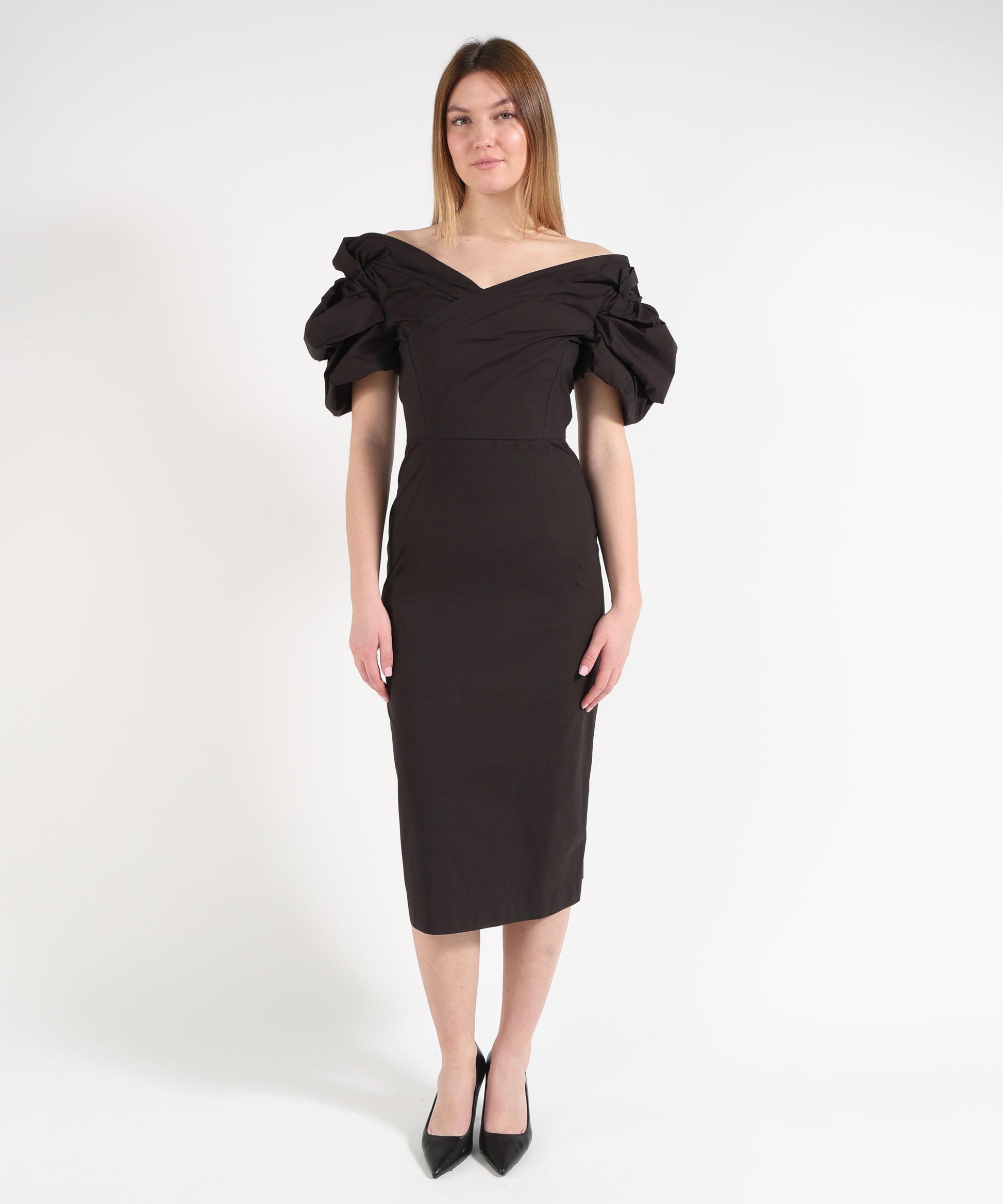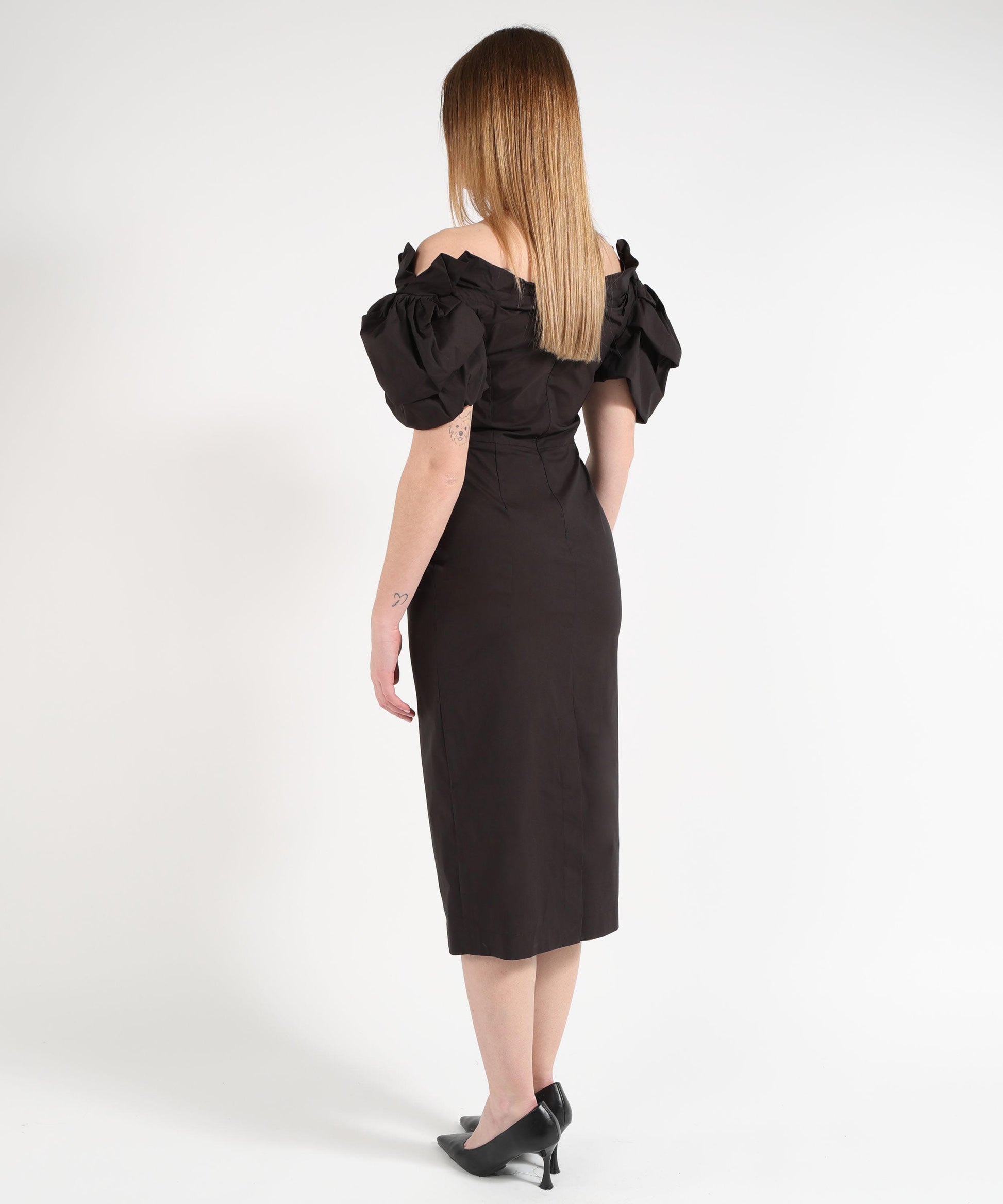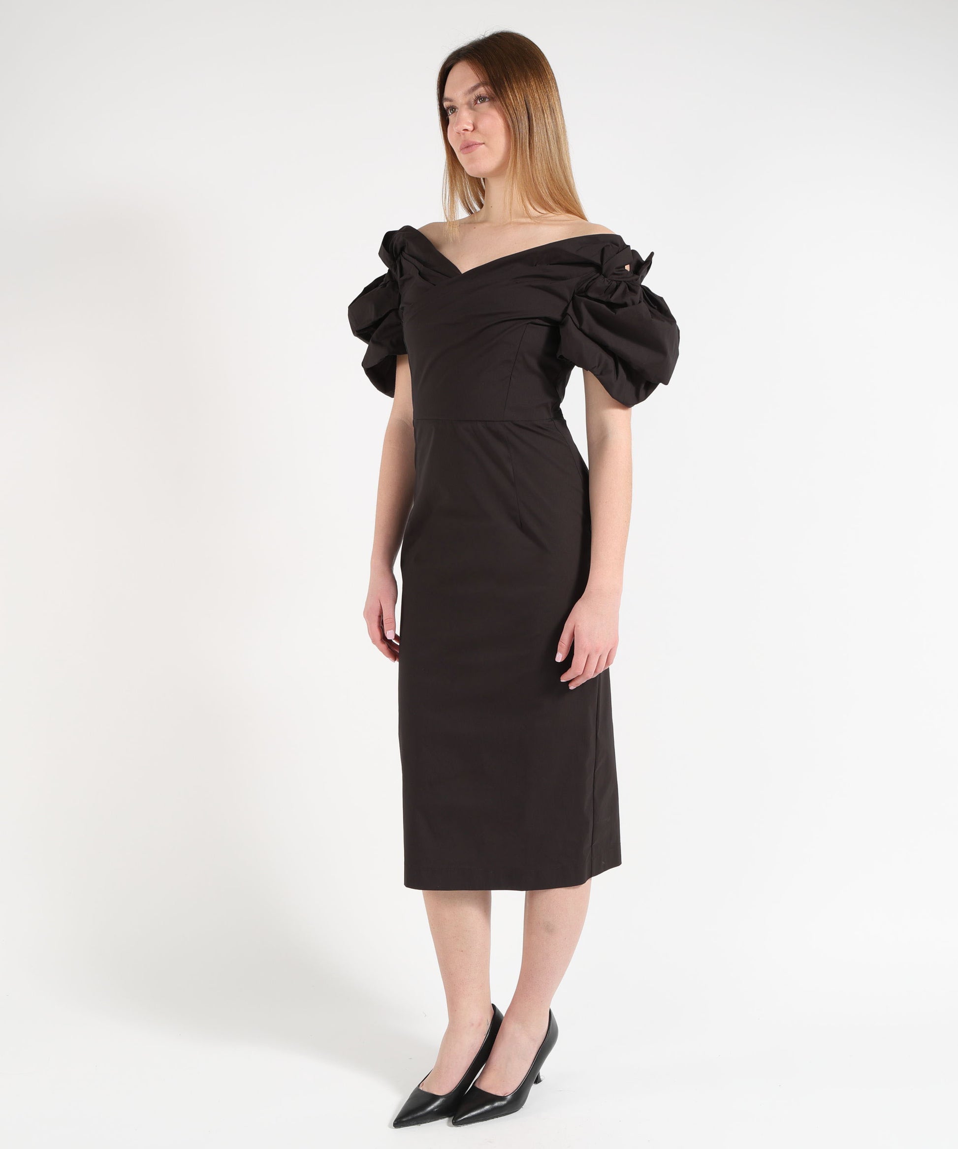 Abito midi a tubino in popeline primaverile con spalle scese e maniche balloon. Tasche laterali nascoste, chiusura con zip e spacco posteriore per uno stile elegante e contemporaneo.