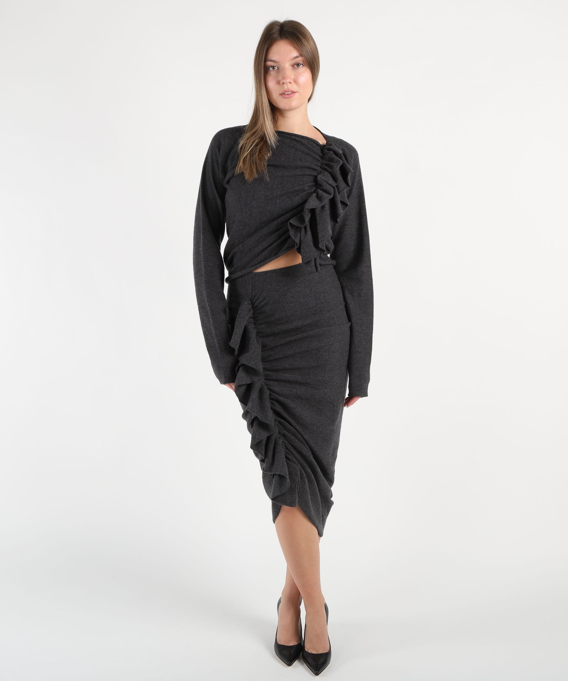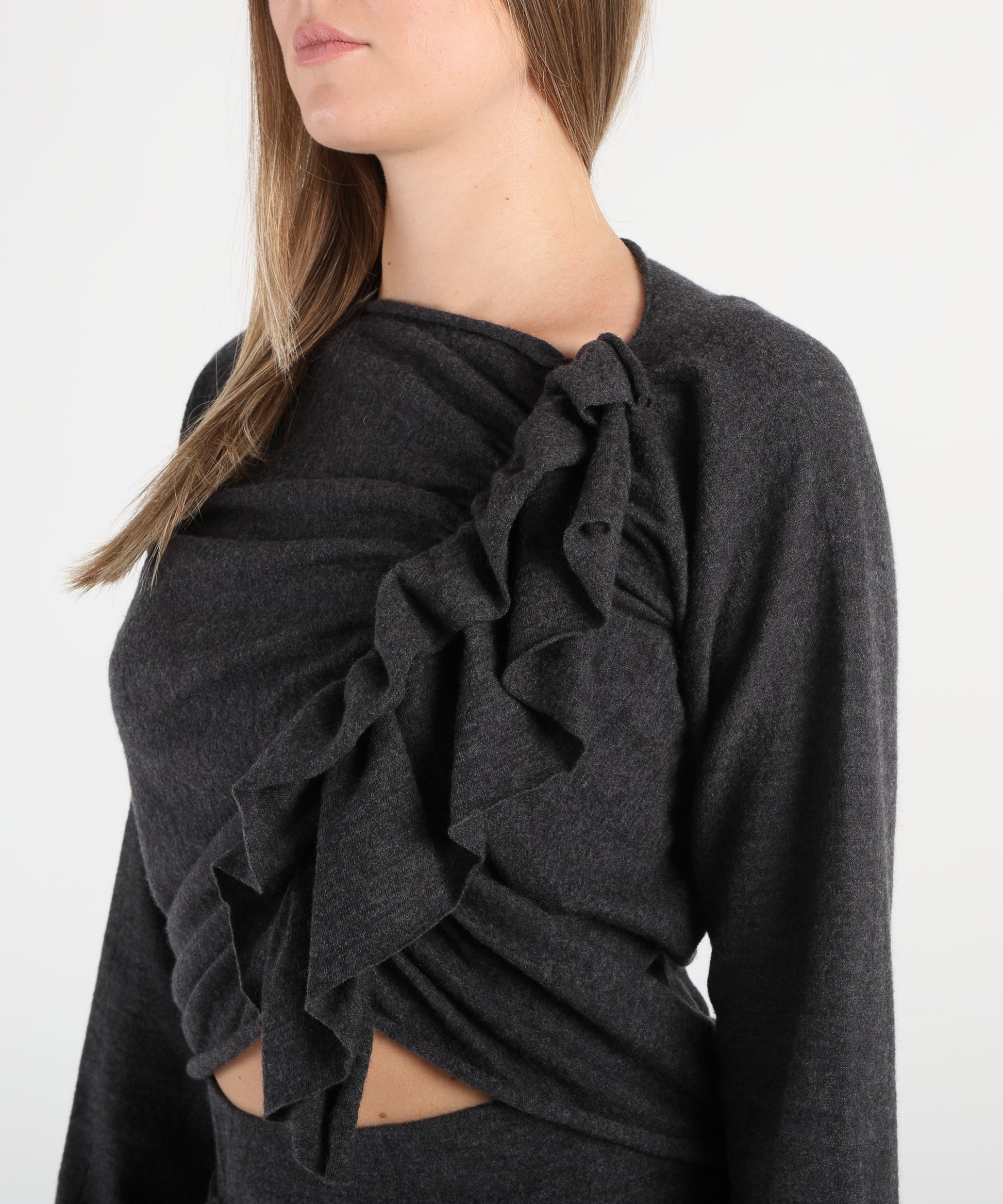 Maglia a maniche lunghe in lana infeltrita, dalla linea aderente e lunghezza in vita. Caratterizzata da un elegante drappeggio diagonale con volant architettonici che donano movimento e raffinatezza.
