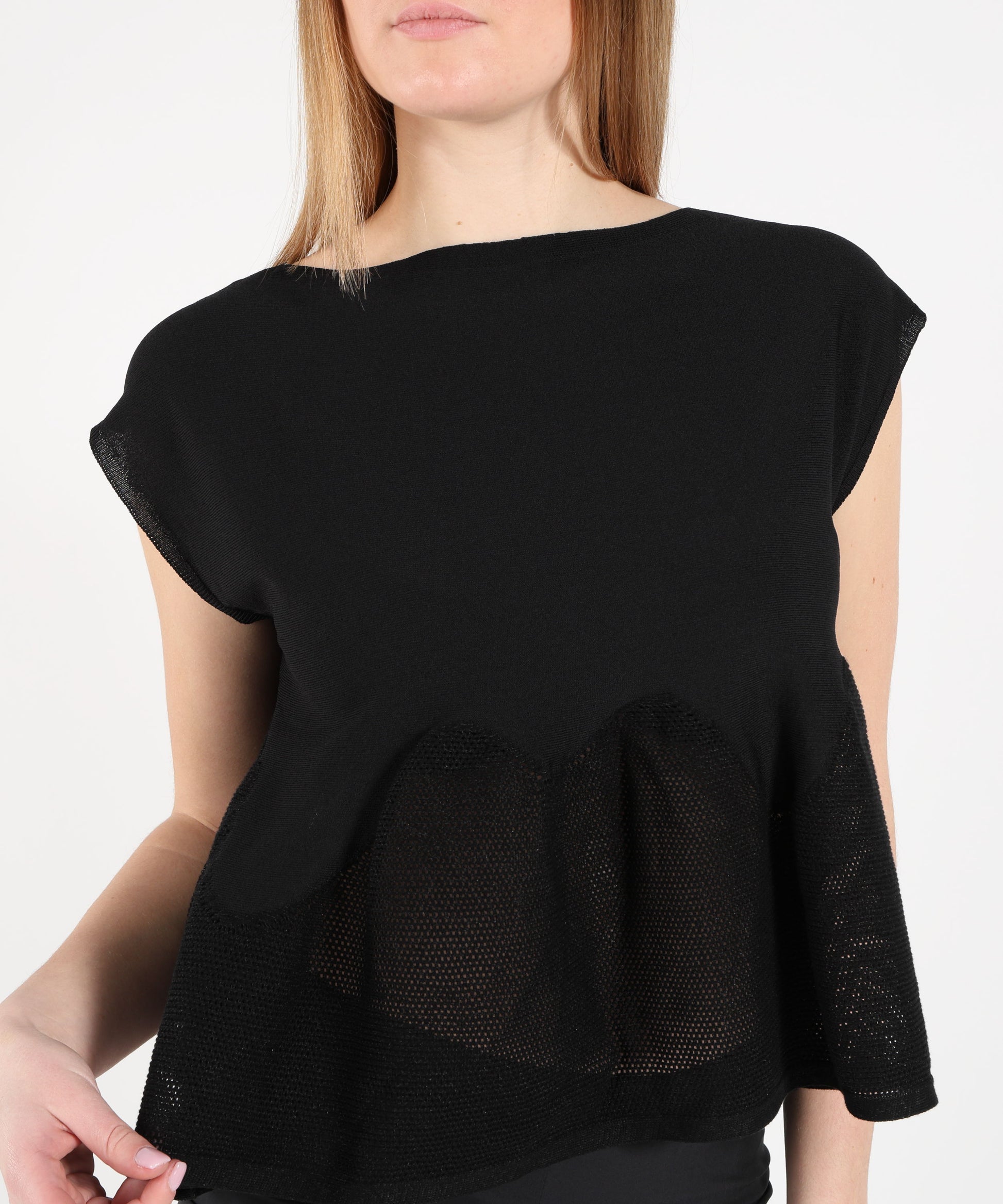 Top in viscosa stretch con scollo a barchetta e maniche ad aletta. Intarsi effetto pizzo e motivo a onda sul fondo per un dettaglio femminile e sofisticato.
