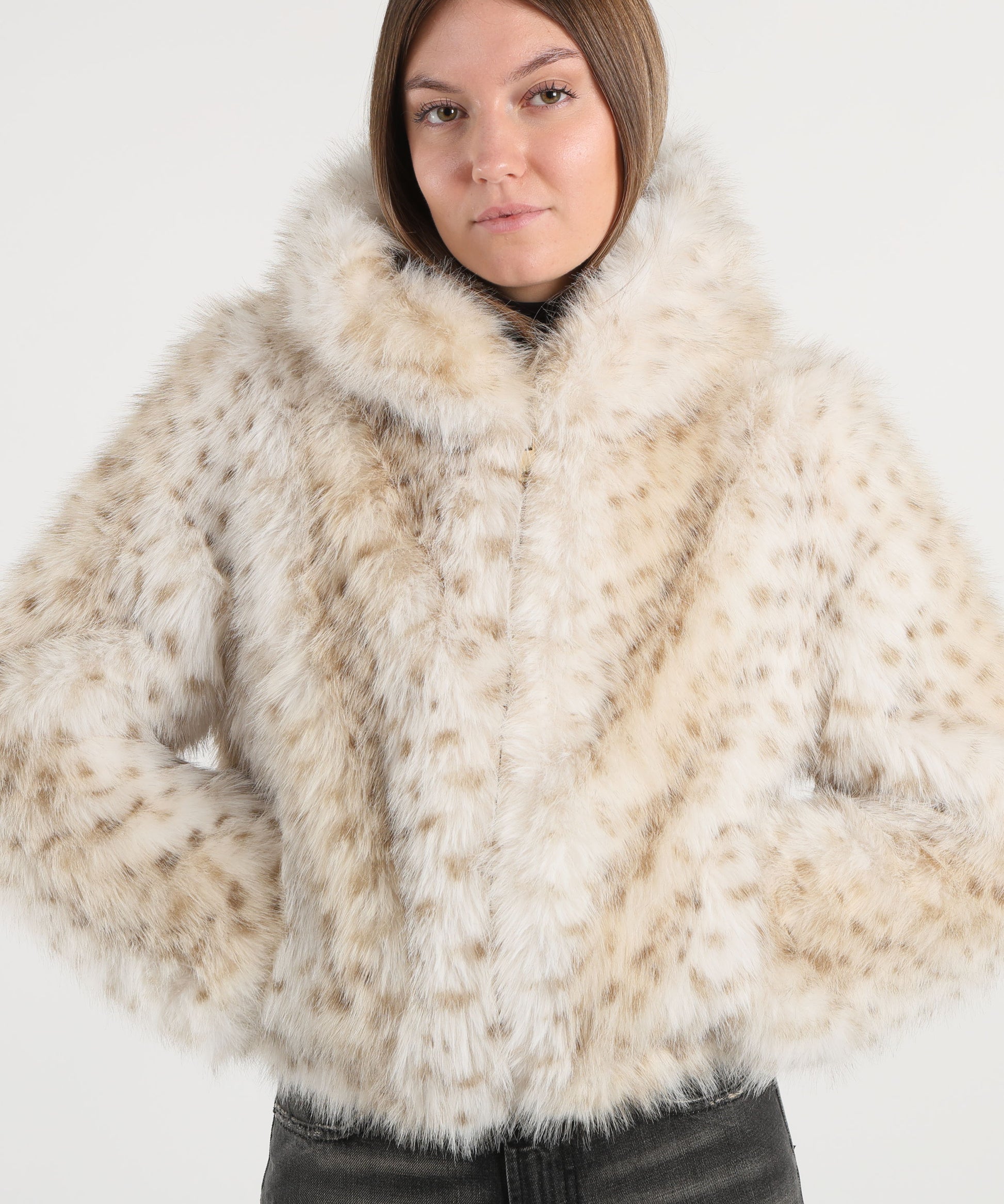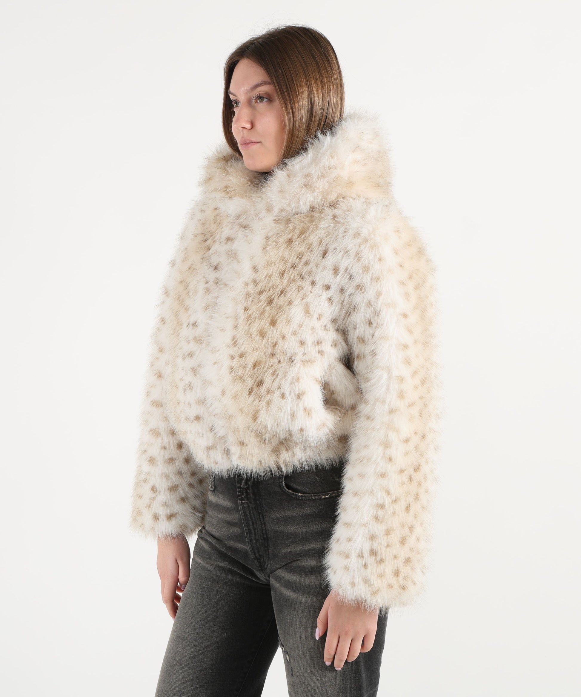 Pelliccia corta caratterizzata da chiusura frontale con zip, cappuccio integrato, tasche laterali funzionali ed elastico sul fondo che assicura una vestibilità aderente e confortevole. Un capo versatile e moderno, perfetto per completare look casual e urbani con un tocco di calore e stile.