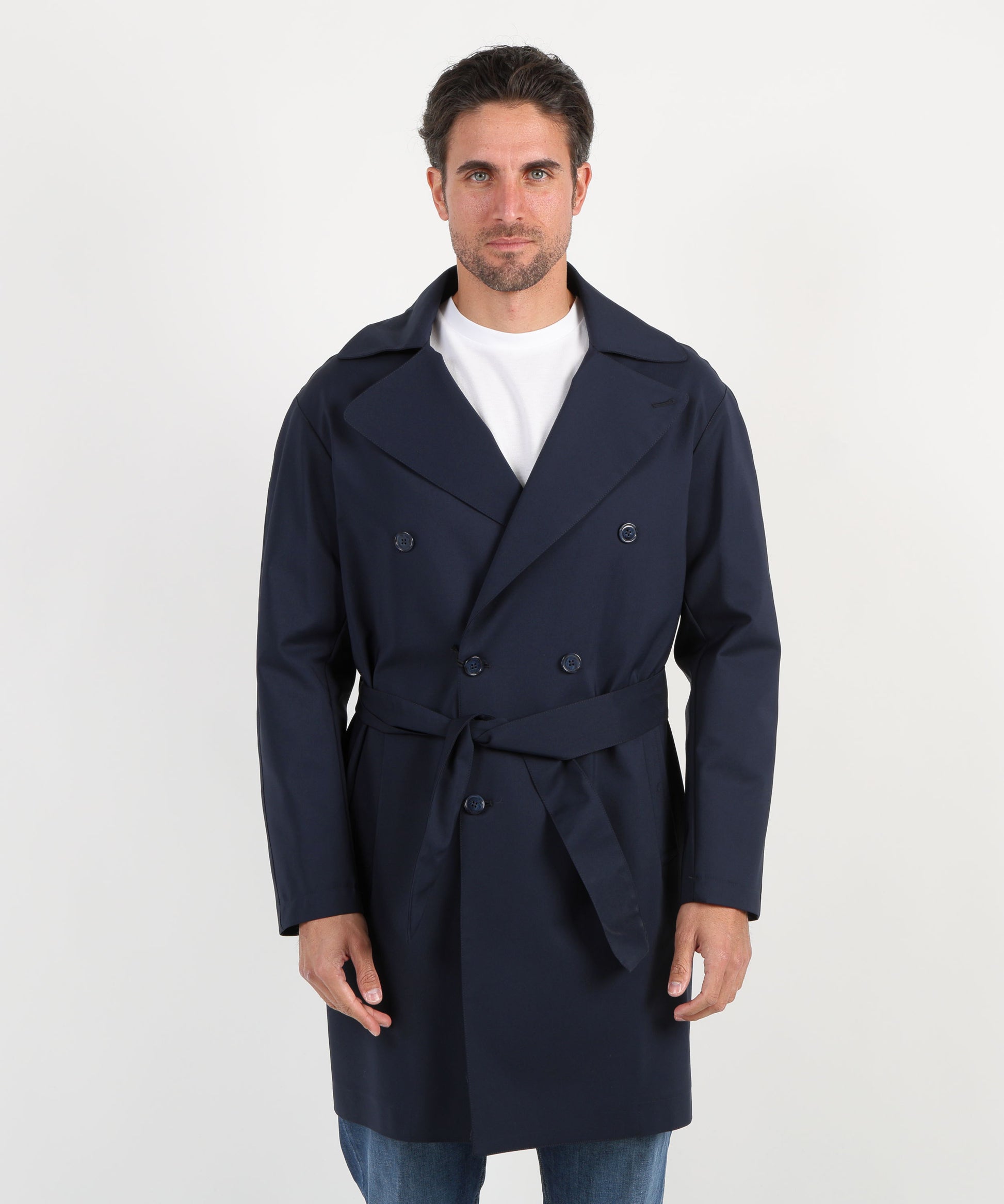 Classico e senza tempo, questo trench doppiopetto è realizzato in tessuto tecnico blu dal taglio impeccabile. Dotato di cintura in vita per valorizzare la silhouette, presenta rever ampio, abbottonatura doppia e tasche laterali a filetto. La chiusura con cintura e bottoni permette di regolare la vestibilità, garantendo eleganza e protezione nelle giornate più fresche. Un capo iconico, perfetto per completare look formali o casual-chic con un tocco di stile urbano.