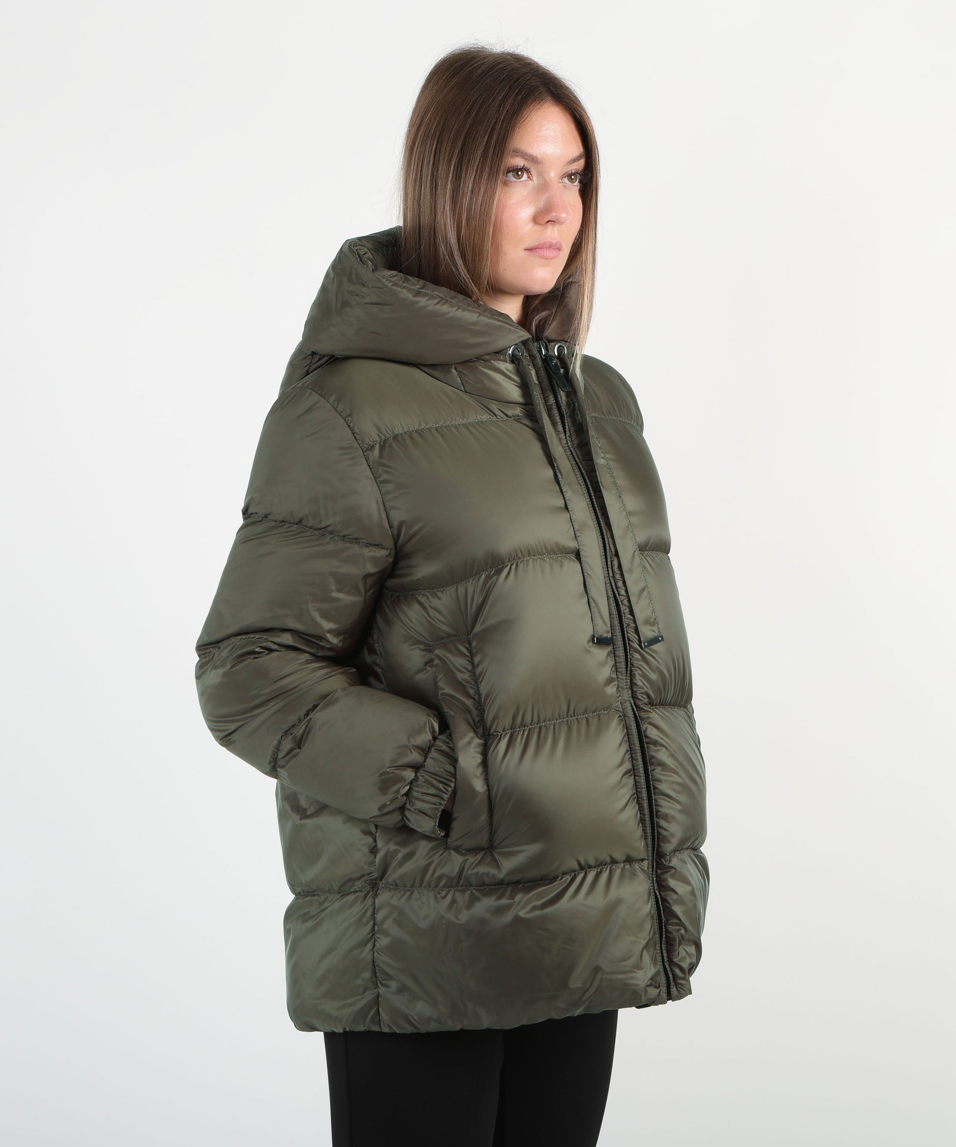 Realizzata in tessuto 100% poliestere, con imbottitura in 100% piumino d’oca per massimo calore e leggerezza. Chiusura frontale con zip, cappuccio e interno parzialmente foderato per un comfort ottimale.