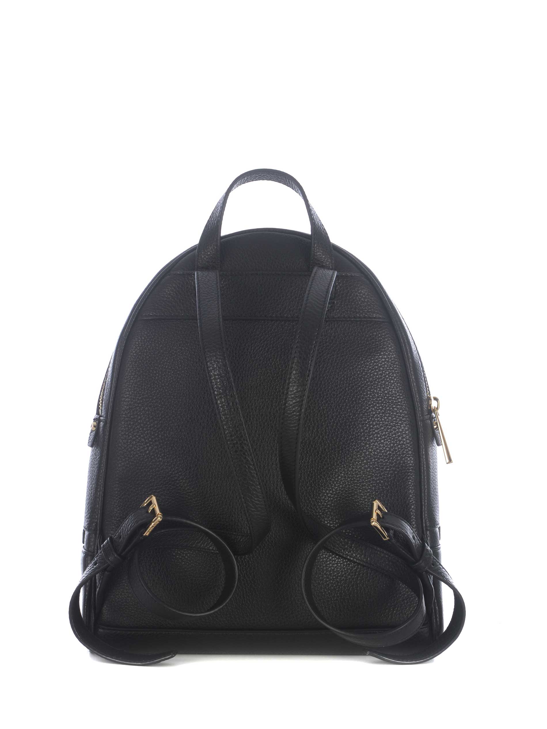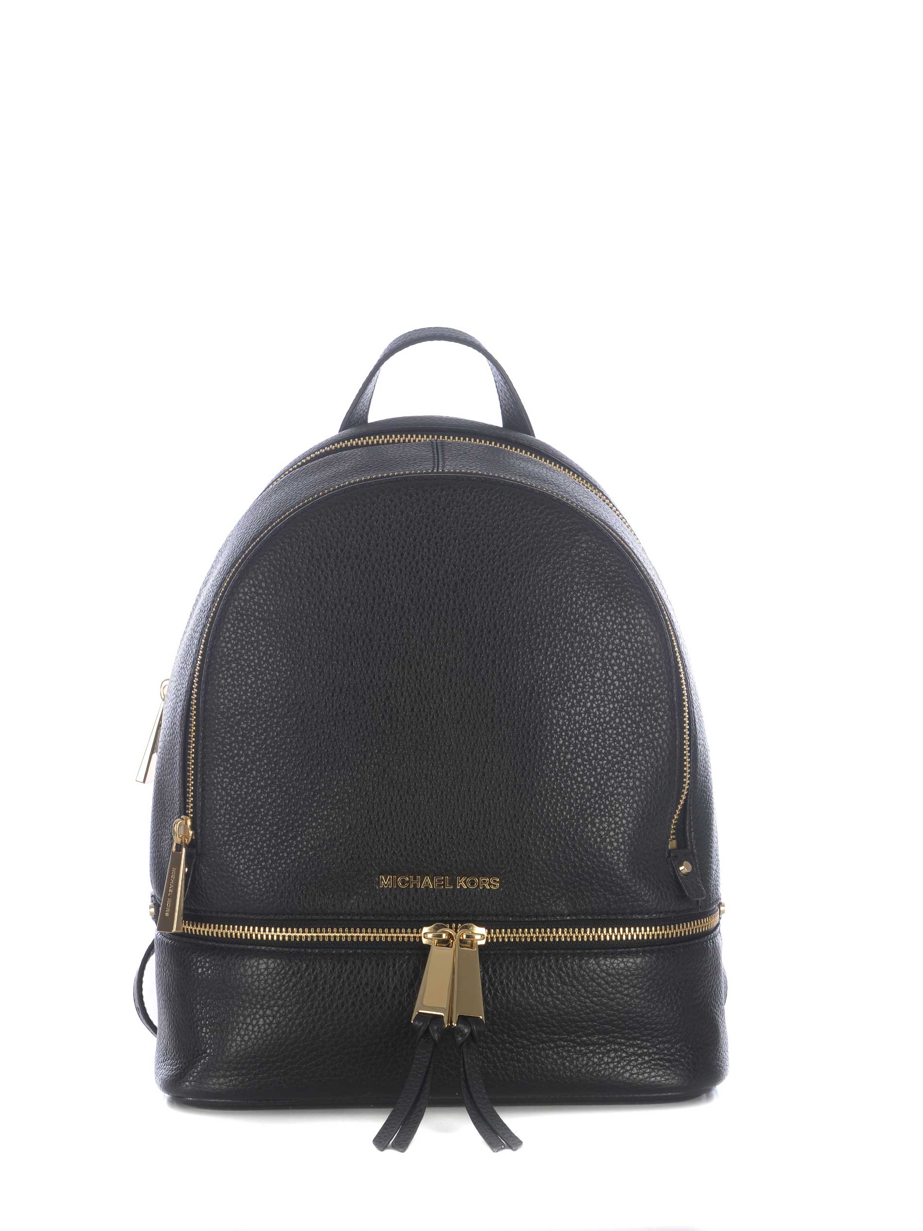 Zaino Michael Kors in pelle martellata Nero. Manico superiore. Spallacci in pelle regolabili. Dettagli in metallo Dorato. Chiusura con zip superiore. Doppia apertura con zip davanti. Tasca interna con zip. Tasca con doppia zip sul fondo. Lettering "Michael Kors". Fodera interna logata.