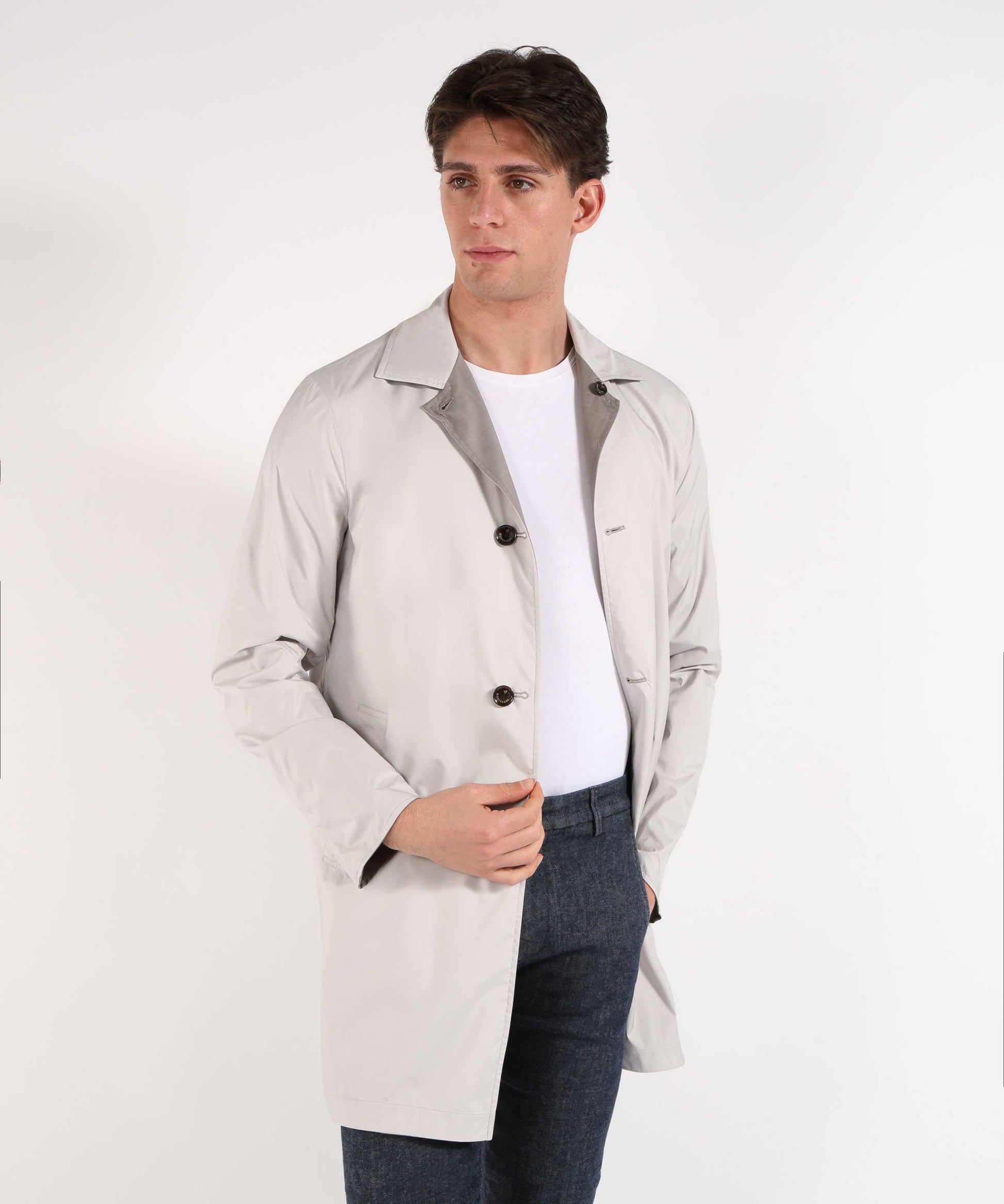 Spolverino dal fascino classico British Style, caratterizzato da un collo inglese e da una lunghezza fino al ginocchio (circa 90?cm) che lo rende elegante e versatile. Il capo è reversibile, offrendo due look in uno, e dispone di tasche laterali funzionali per praticità quotidiana.