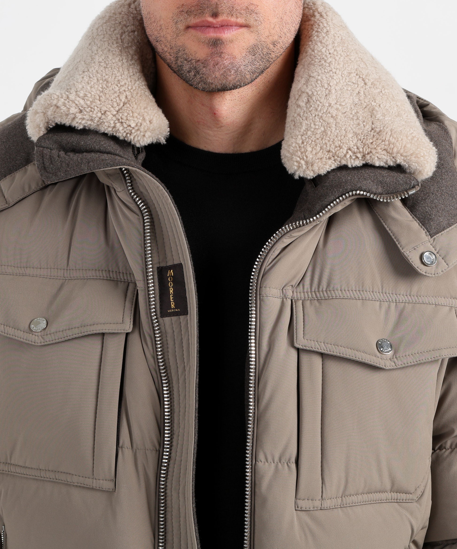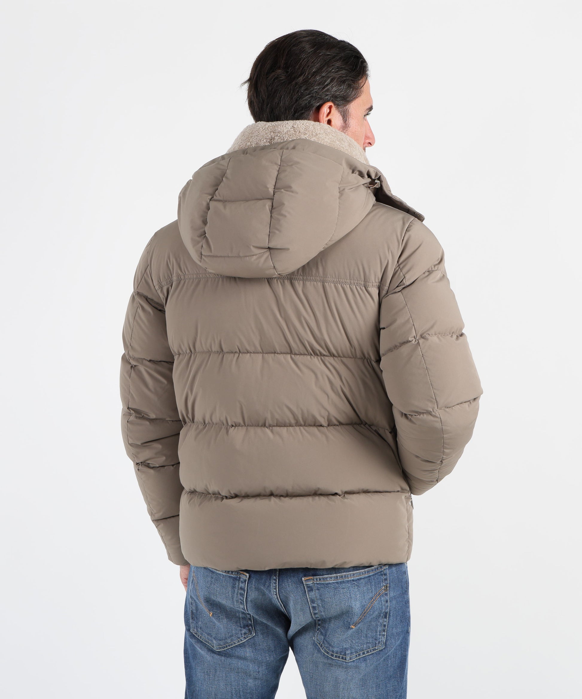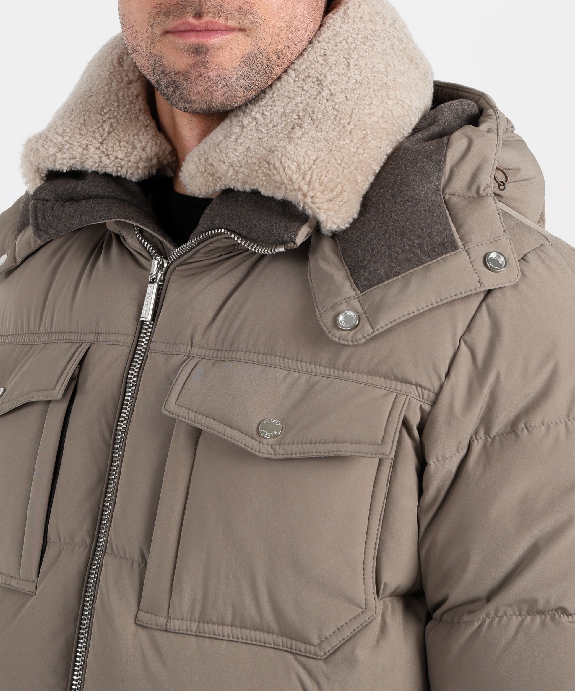 Piumino da uomo in nylon con collo alto, cappuccio rimovibile e dettaglio in pelliccia di montone, pratico e raffinato per affrontare il freddo con stile.