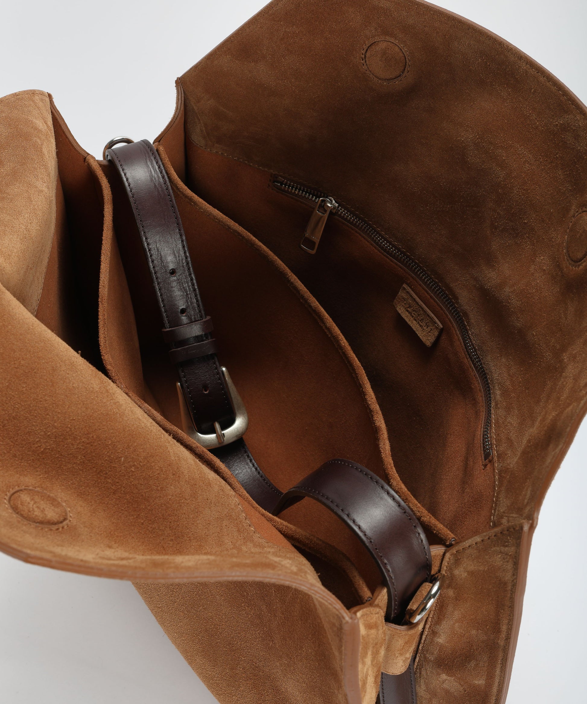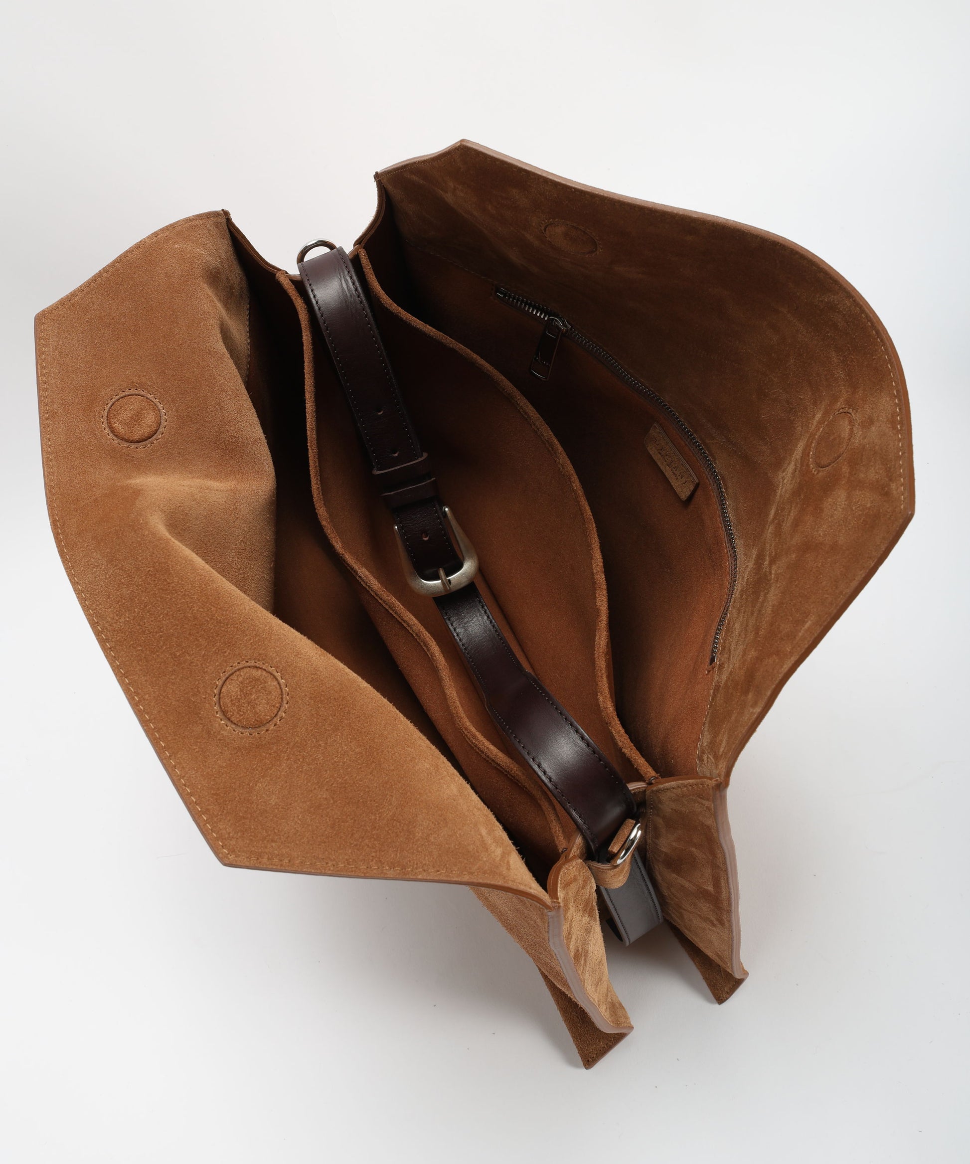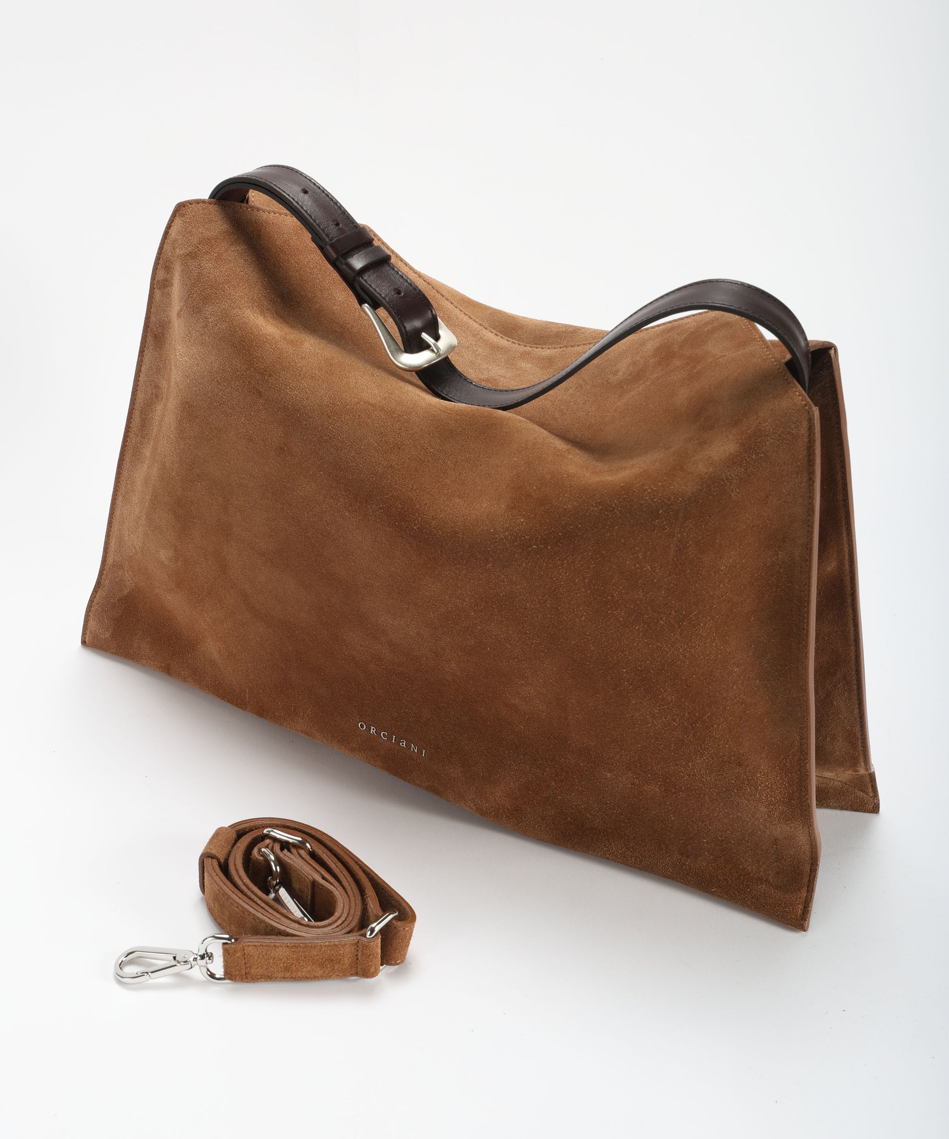 Realizzata in morbido suede abbinato al cuoio, presenta curve ampie e avvolgenti che conferiscono un’eleganza naturale, perfetta per accompagnarti dal mattino alla sera. Il tratto distintivo resta il manico in cuoio, completamente regolabile e rimovibile, studiato per trasformarsi in una vera e propria cintura da indossare come accessorio indipendente: un dettaglio iconico che celebra il DNA del modello.