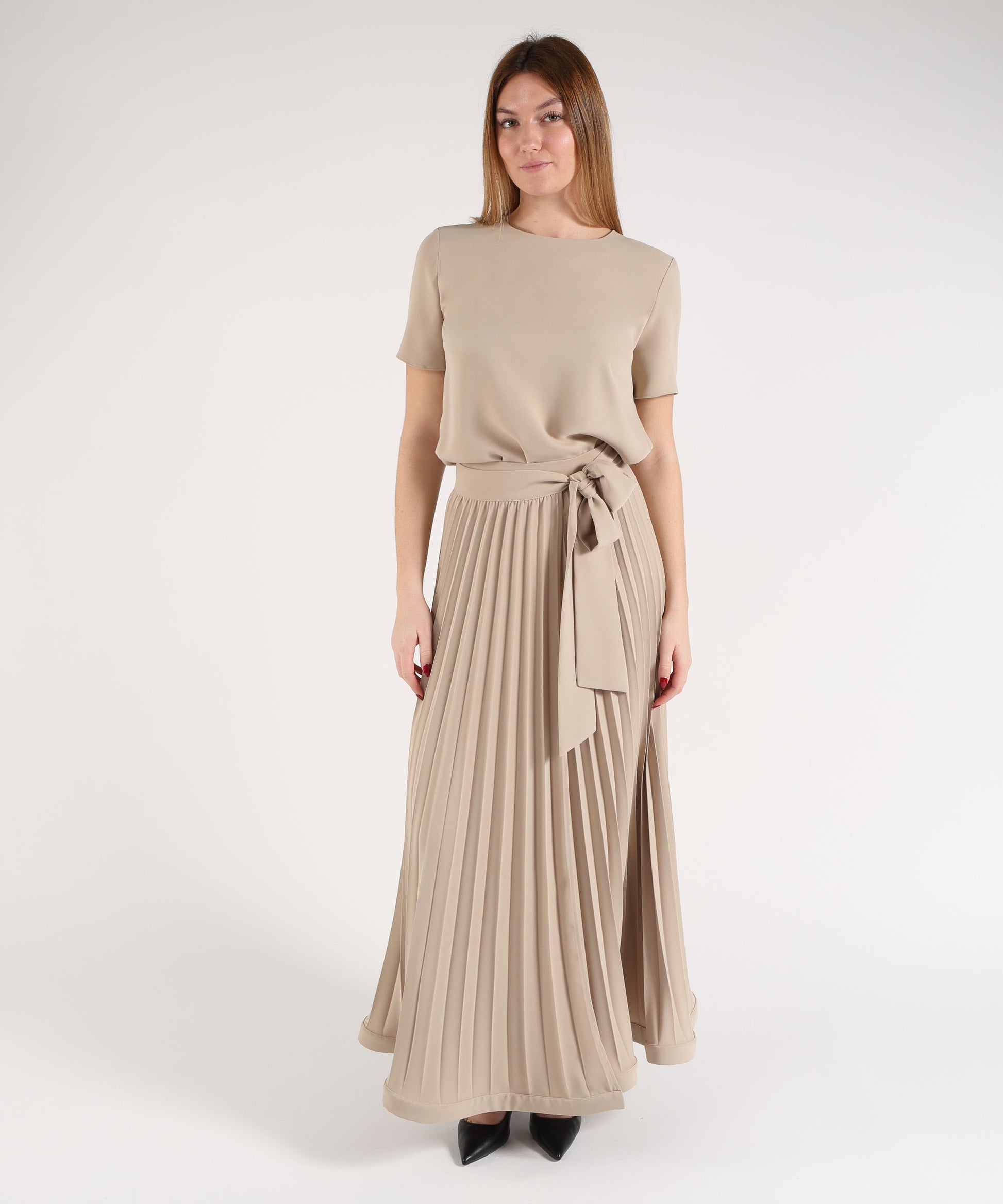 Il fondo stondato con spacco, caratterizzato da una lunghezza maggiore sul davanti, crea movimento e valorizza la silhouette con un effetto fluido. Ideale da abbinare a pantaloni o gonne, questa blusa è perfetta per realizzare look casual-chic, da ufficio o per occasioni più eleganti, con stile e leggerezza.