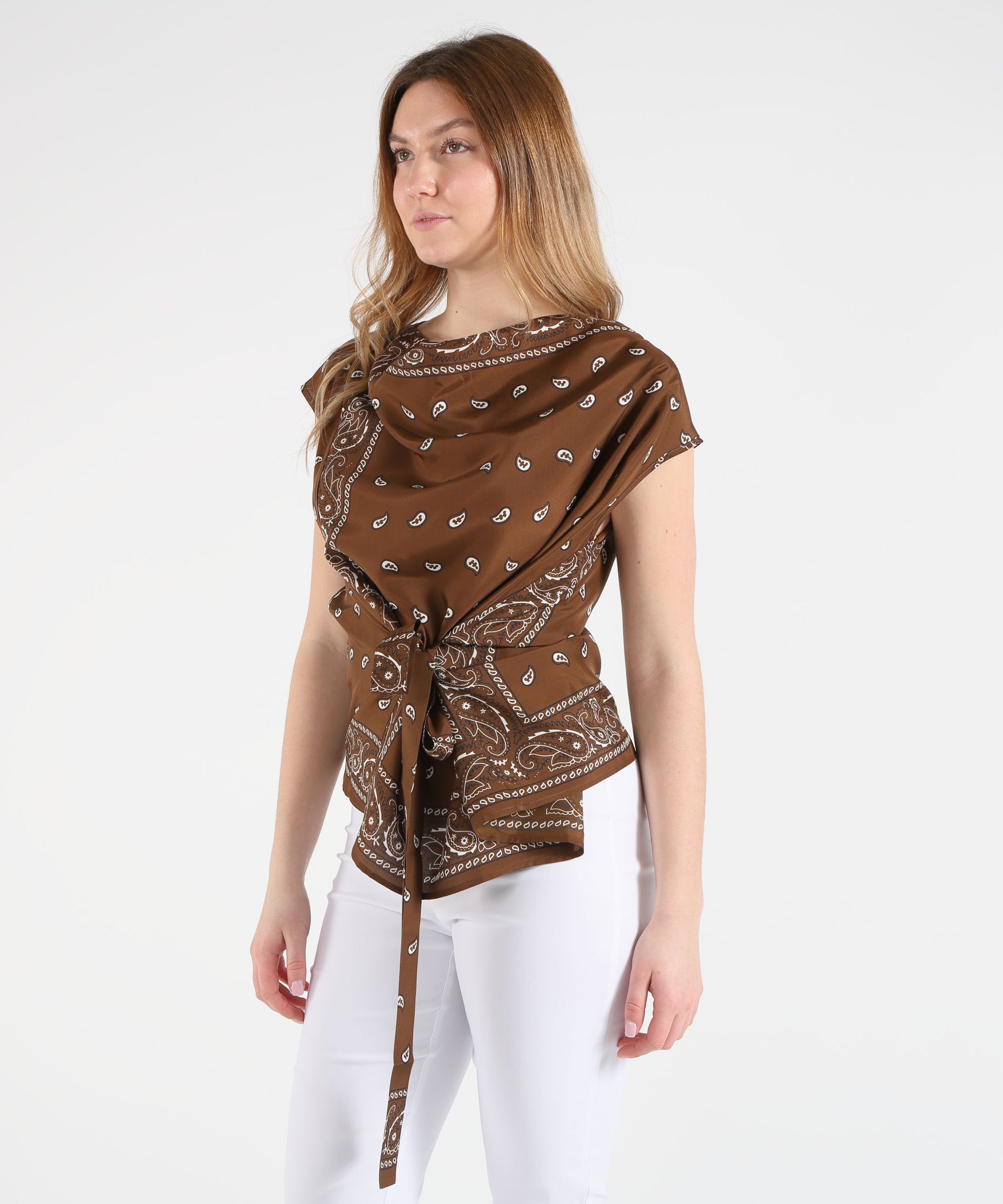 Il tessuto è decorato con una fantasia a bandana, che aggiunge un tocco originale e contemporaneo, rendendo il capo distintivo ma facile da abbinare a pantaloni, gonne o shorts. Leggero e confortevole, questo top è perfetto per il giorno e le occasioni informali, combinando stile e praticità.
