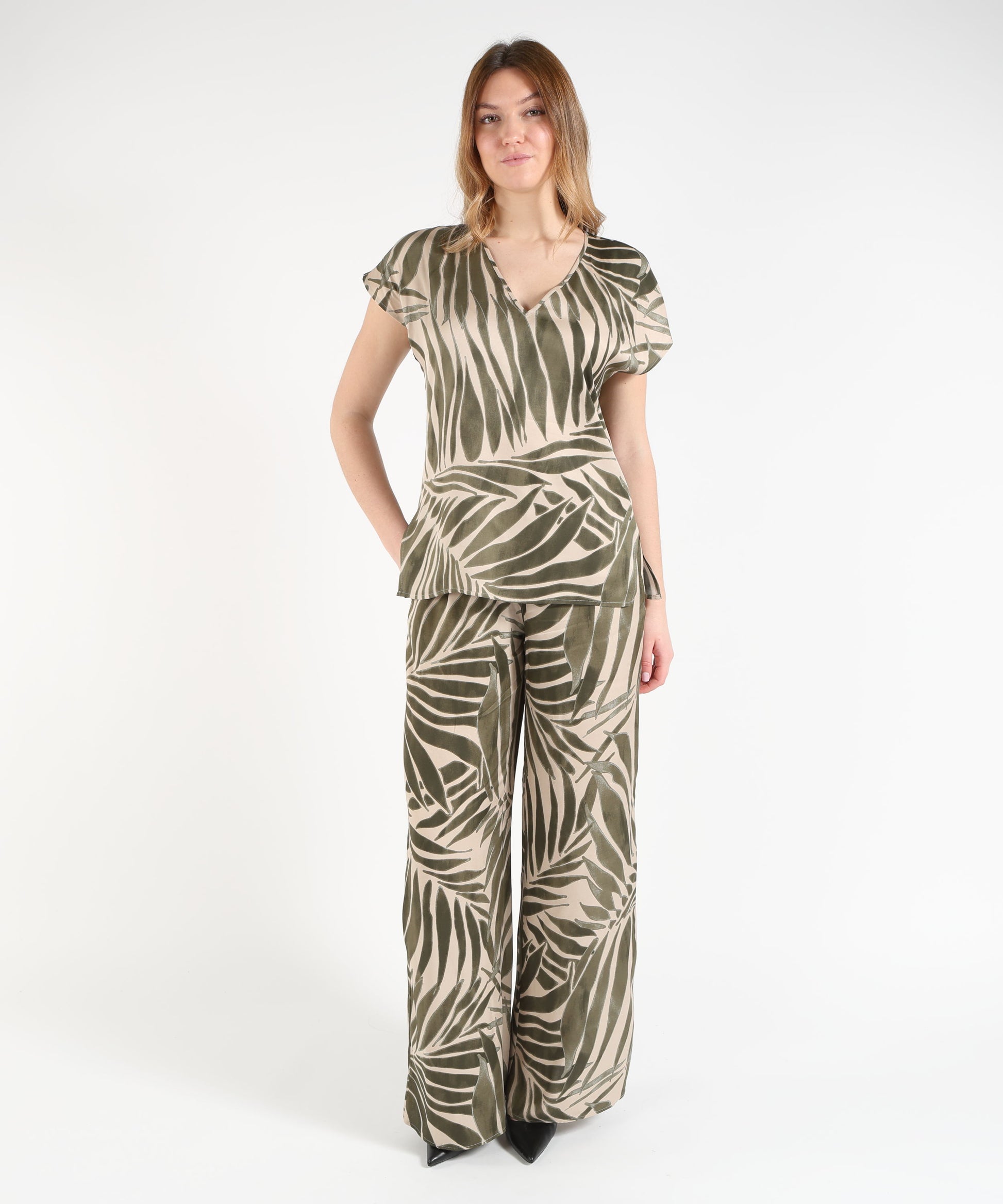 Il modello presenta scollo a V, maniche corte a kimono, spacchi laterali al fondo e fit regolare, garantendo comfort e vestibilità fluida.