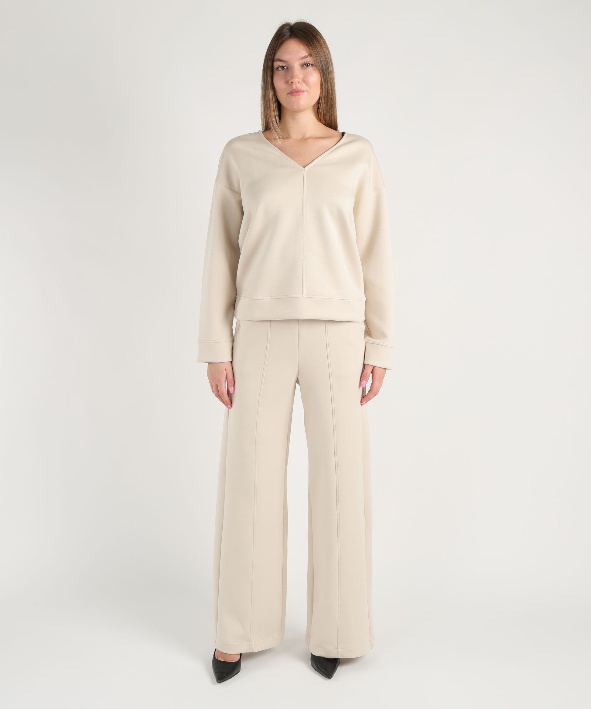 Felpa athleisure in viscosa stretch con scollo a V, spalle scese e linee ampie. Un capo versatile da abbinare sia con joggers che con pantaloni classici.