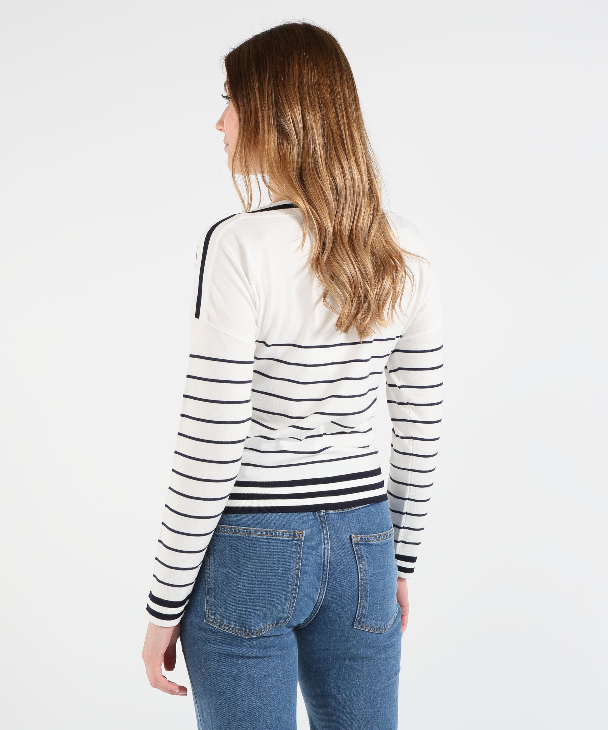 Maglia marinière in viscosa stretch con filato sottile e lavorazione rasata. Scollo a barchetta, spalle scese e fit regolare per uno stile sporty-chic elegante e senza tempo.