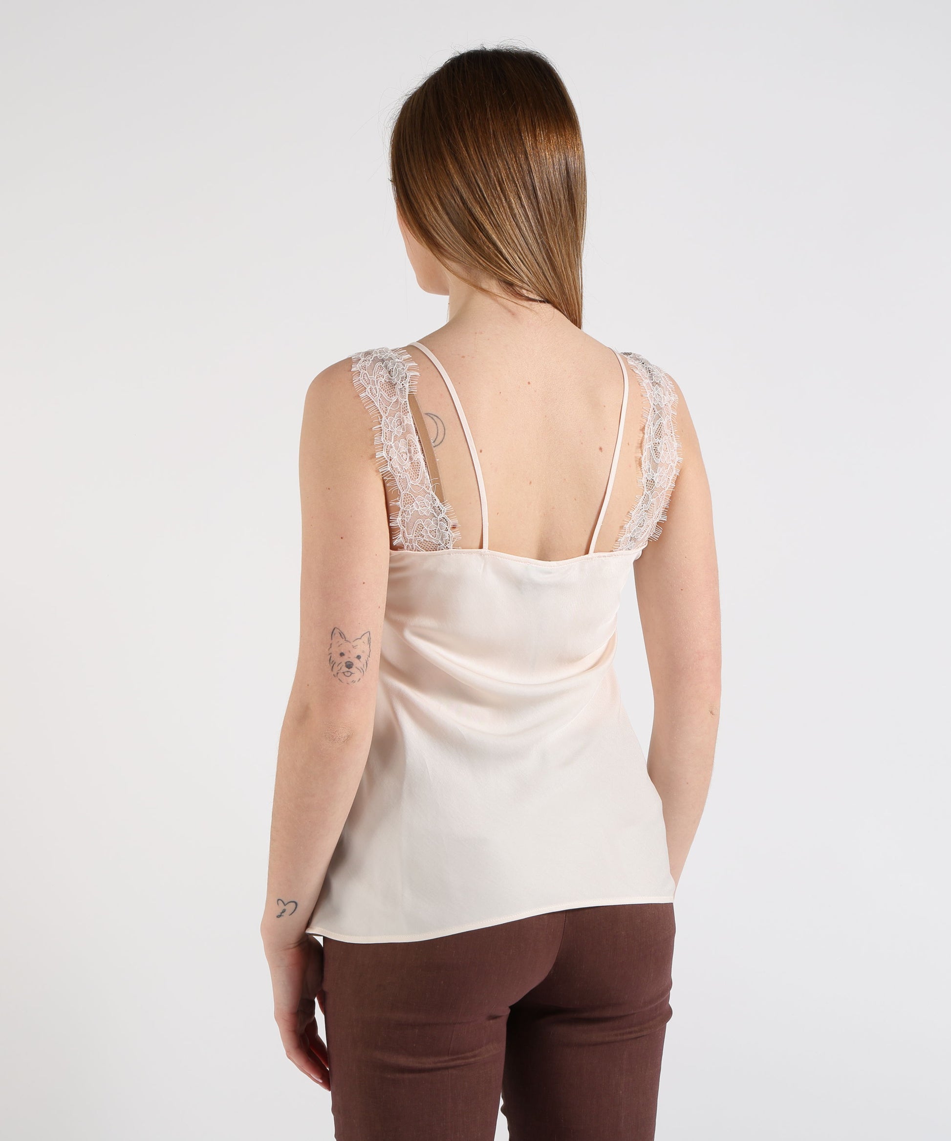 Top smanicato in stile lingerie, realizzato in tessuto twill fluido, leggero e morbido sulla pelle. Il modello è caratterizzato da sottili spalline nello stesso materiale e impreziosito da bande in pizzo intarsiato sul davanti, lungo lo scollo a V e sulle spalline più spesse, per un dettaglio raffinato e femminile.