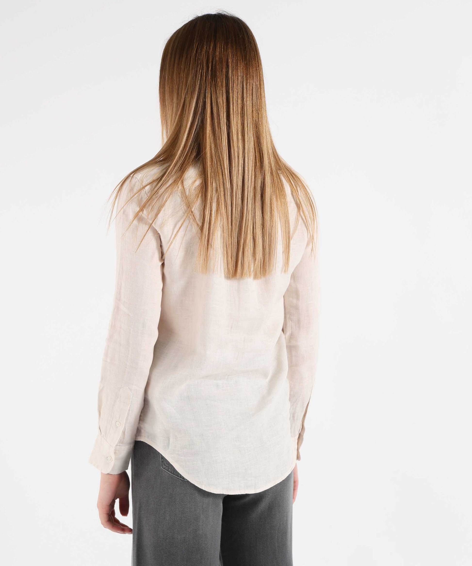 Camicia in lino leggero dal taglio dritto, con bottoni in madreperla, colletto a punta e polsini regolabili. Rifinita con orlo arrotondato e pony ricamato sul petto.