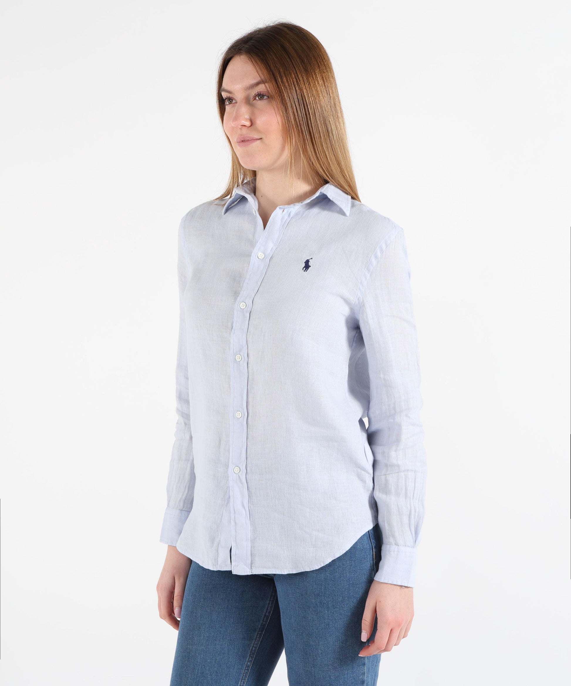 Camicia in lino leggero dal taglio dritto, con bottoni in madreperla, colletto a punta e polsini regolabili. Rifinita con orlo arrotondato e pony ricamato sul petto.