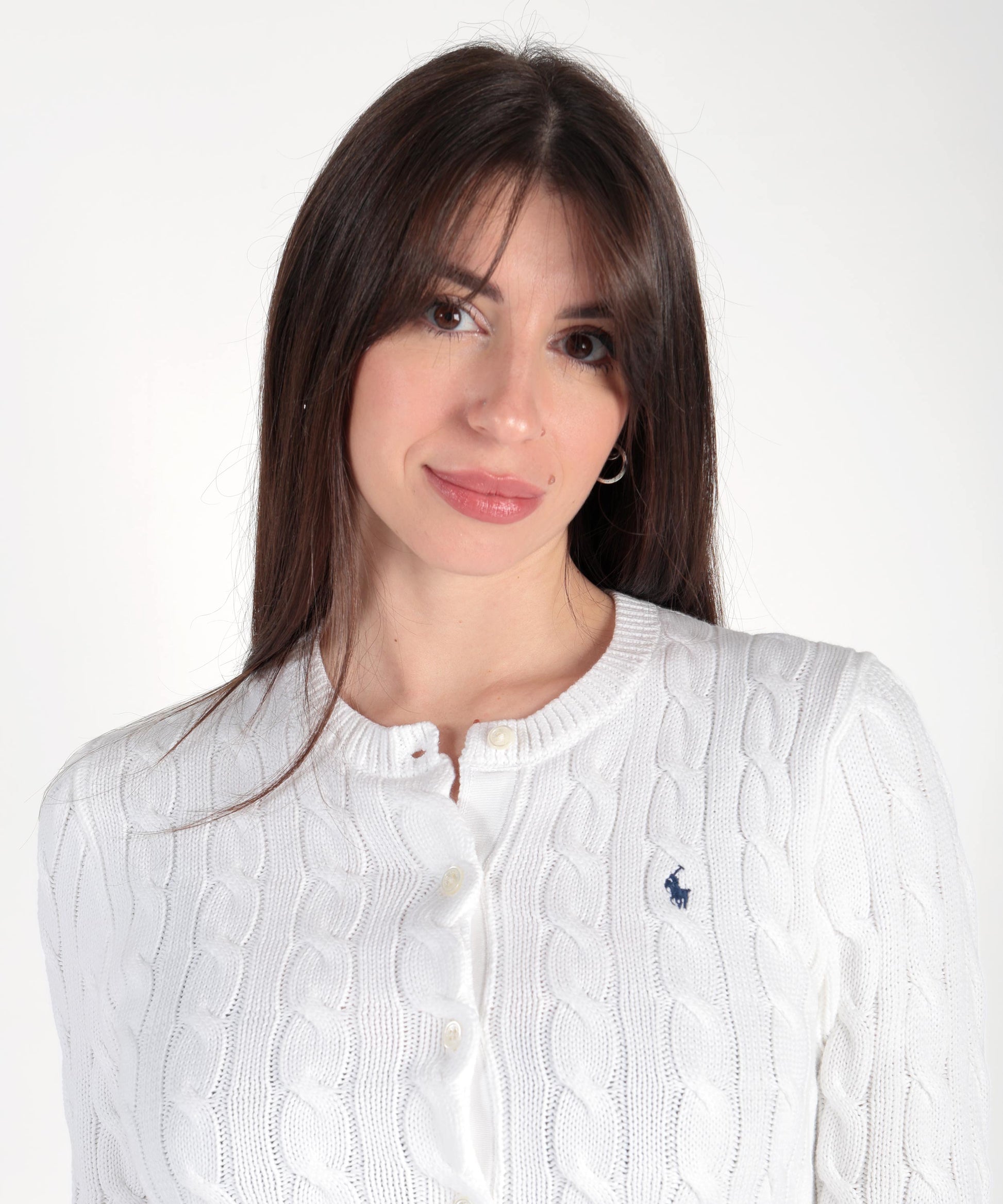 Cardigan Polo in cotone a trecce, collo giro a costine, maniche lunghe e chiusura a bottoni con rifiniture in grosgrain, ricamo Pony sul petto. Elegante, sottile e versatile per look casual o smart casual.