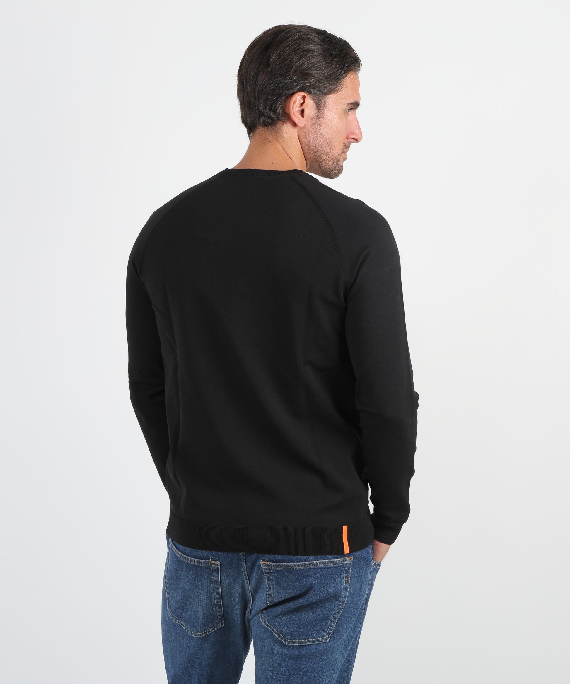 Maglia girocollo Amos Cotton Round Knit in filato tecnico stretch con interno in cotone. Maniche raglan, inserti arancioni sul retro e logo microiniezione nero. Comfort e stile urbano.