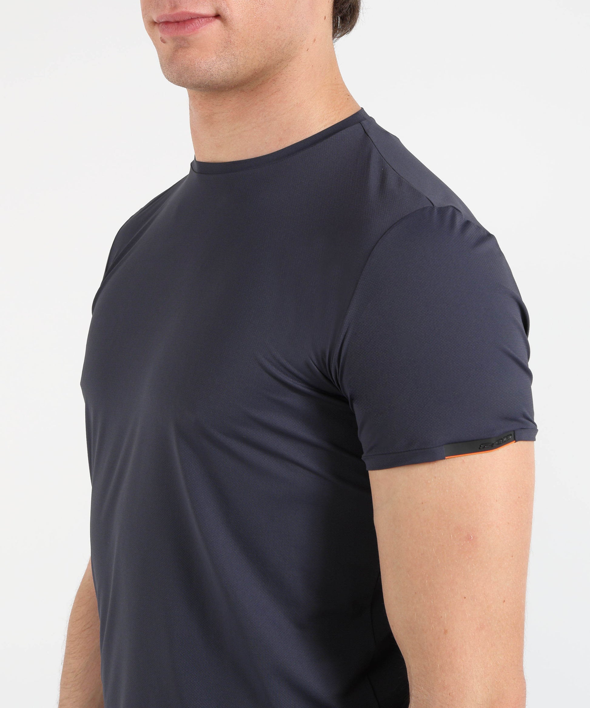 T-shirt monocroma in tessuto Oxford leggero ed elasticizzato, traspirante e a rapida asciugatura. Vestibilità regolare con micro spacchi laterali, logo sulla manica e dettaglio fluo sul fondo per uno stile casual versatile, adatto anche sotto il blazer.