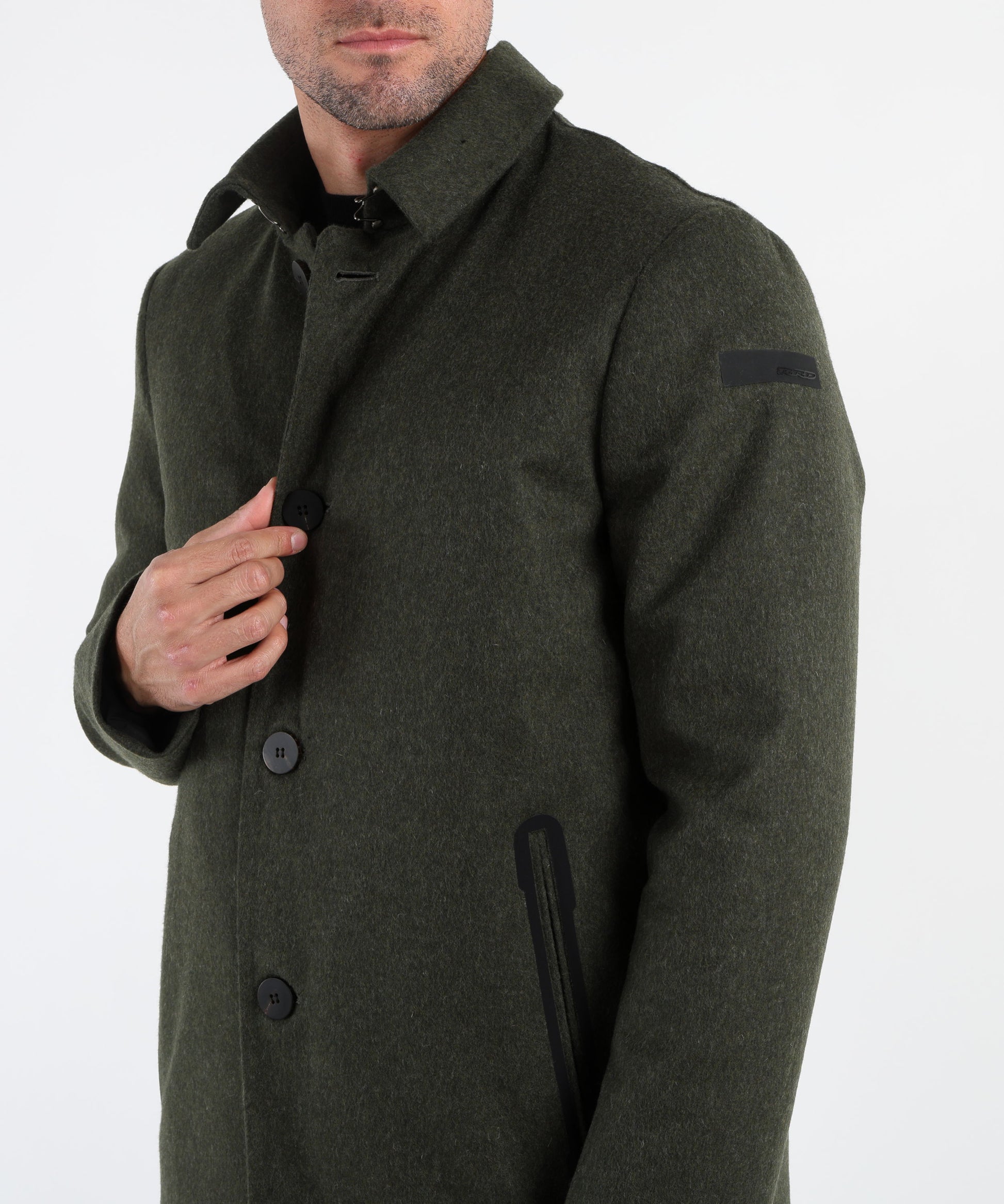 Giacca verde in panno di lana Moessmer, imbottita in piuma d’anatra, con bottoni in corno, tasche laterali, taschino interno e dettagli arancione fluo e logo microiniezione per uno stile contemporaneo e funzionale.