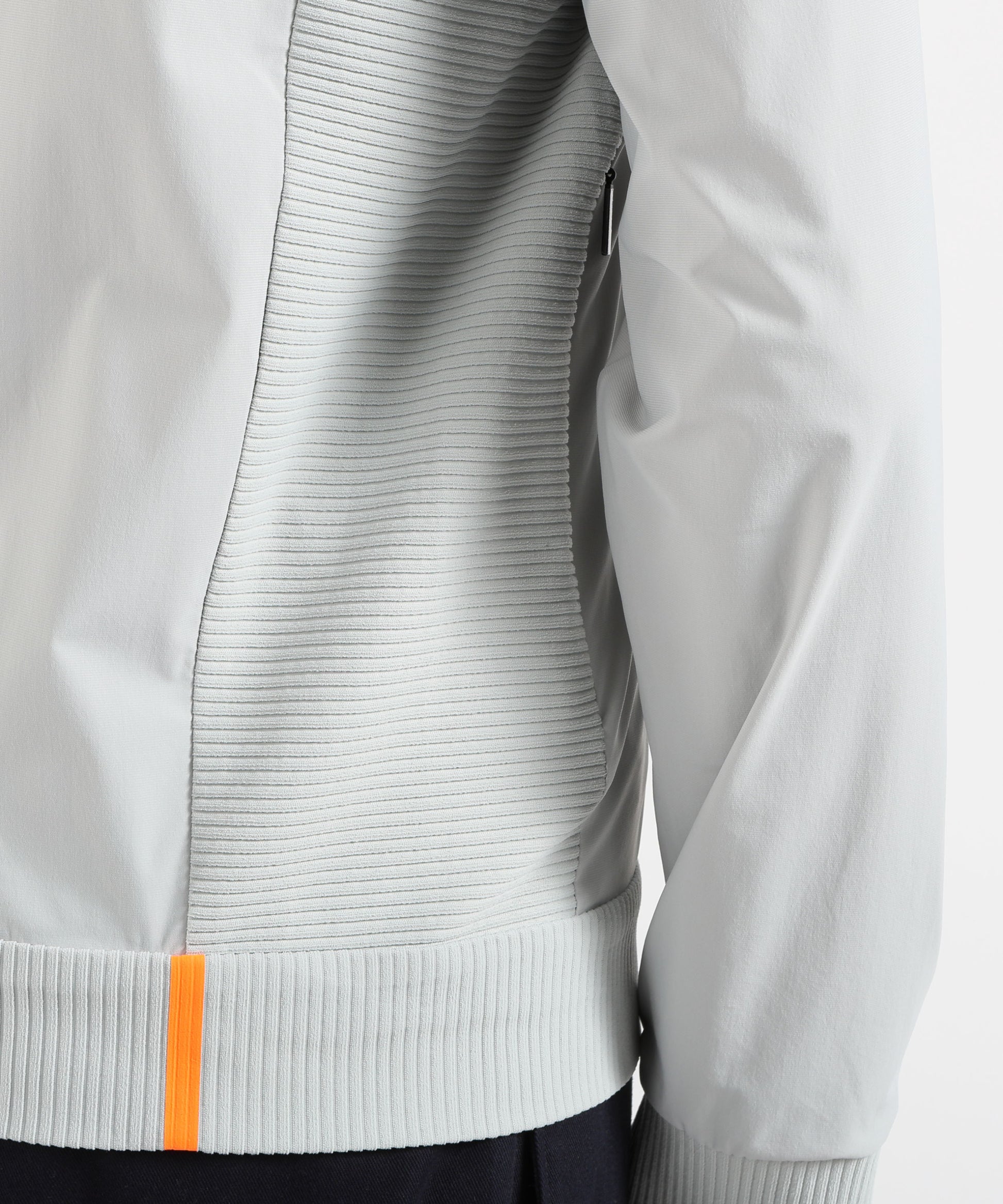 Il colletto verticale con bordura arancione fluo introduce un accento grafico distintivo, richiamato anche dalla nastratura arancione fluo sul fondo posteriore, per un look moderno e dinamico. La zip integrale frontale e le tasche laterali con zip invisibili definiscono un design lineare e funzionale.