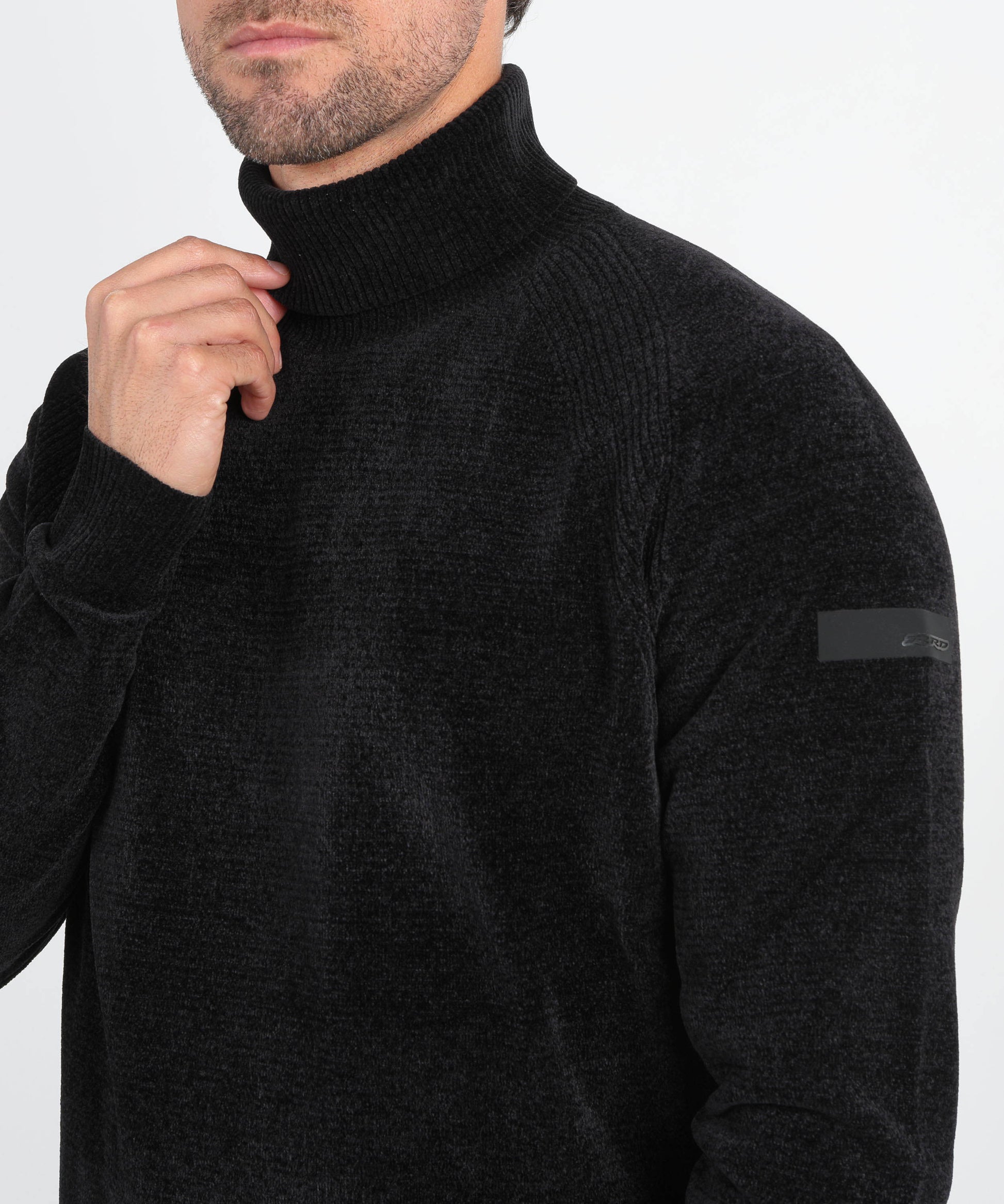 Dolcevita in ciniglia stretch, morbido e vellutato, con maniche raglan e lavorazione a coste. Filetto arancione sul retro e logo a microiniezione nero sulla manica. Stile versatile e comfort assicurato.