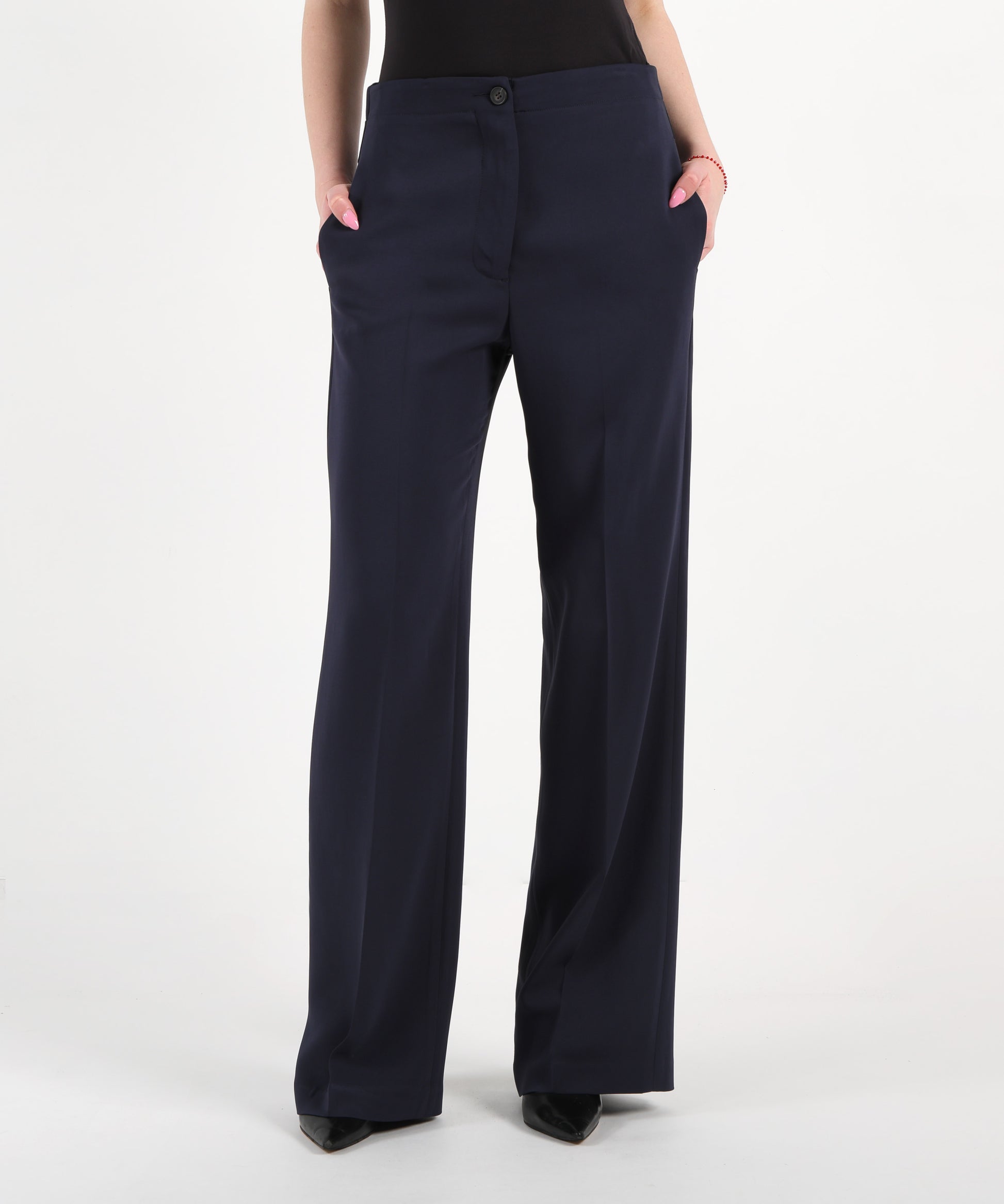 La vita piatta davanti e elasticizzata dietro assicurano una vestibilità perfetta e un comfort ottimale, adattandosi alle forme del corpo. Il cinturino invisibile impunturato aggiunge un tocco di classe e perfezione sartoriale, mentre la chiusura con zip e bottone garantisce praticità e sicurezza. Le tasche laterali aggiungono funzionalità, rendendo il pantalone perfetto per essere indossato in molteplici occasioni, dal lavoro alle uscite informali.