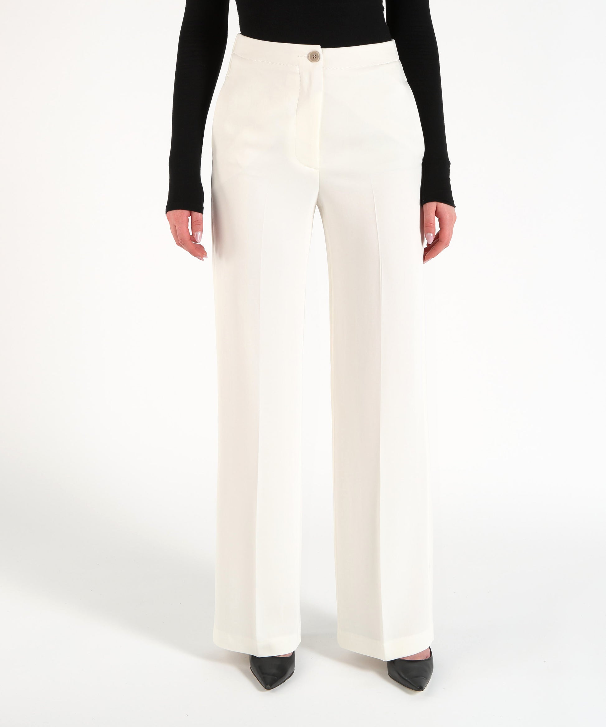 La vita piatta davanti e elasticizzata dietro assicurano una vestibilità perfetta e un comfort ottimale, adattandosi alle forme del corpo. Il cinturino invisibile impunturato aggiunge un tocco di classe e perfezione sartoriale, mentre la chiusura con zip e bottone garantisce praticità e sicurezza. Le tasche laterali aggiungono funzionalità, rendendo il pantalone perfetto per essere indossato in molteplici occasioni, dal lavoro alle uscite informali.