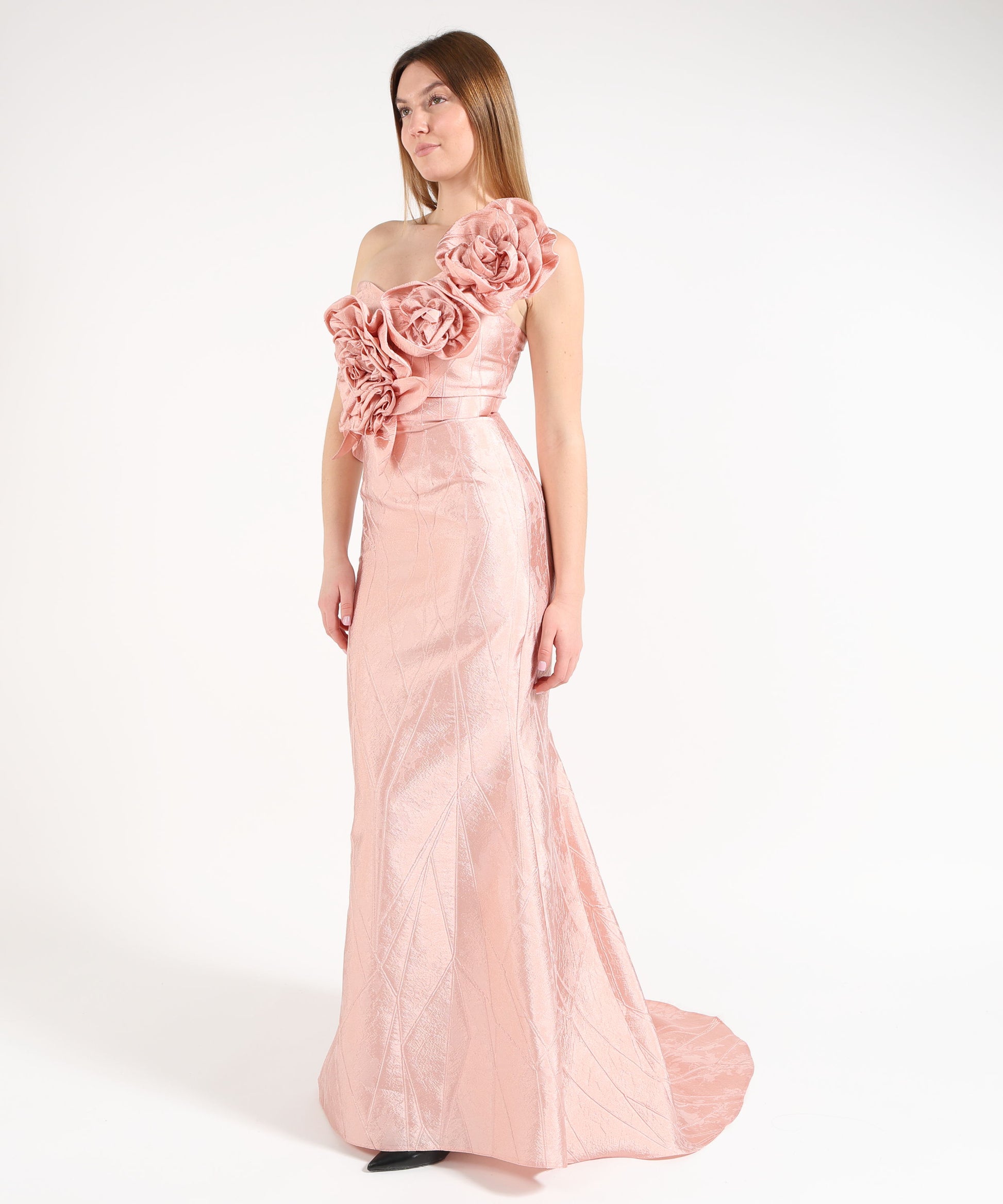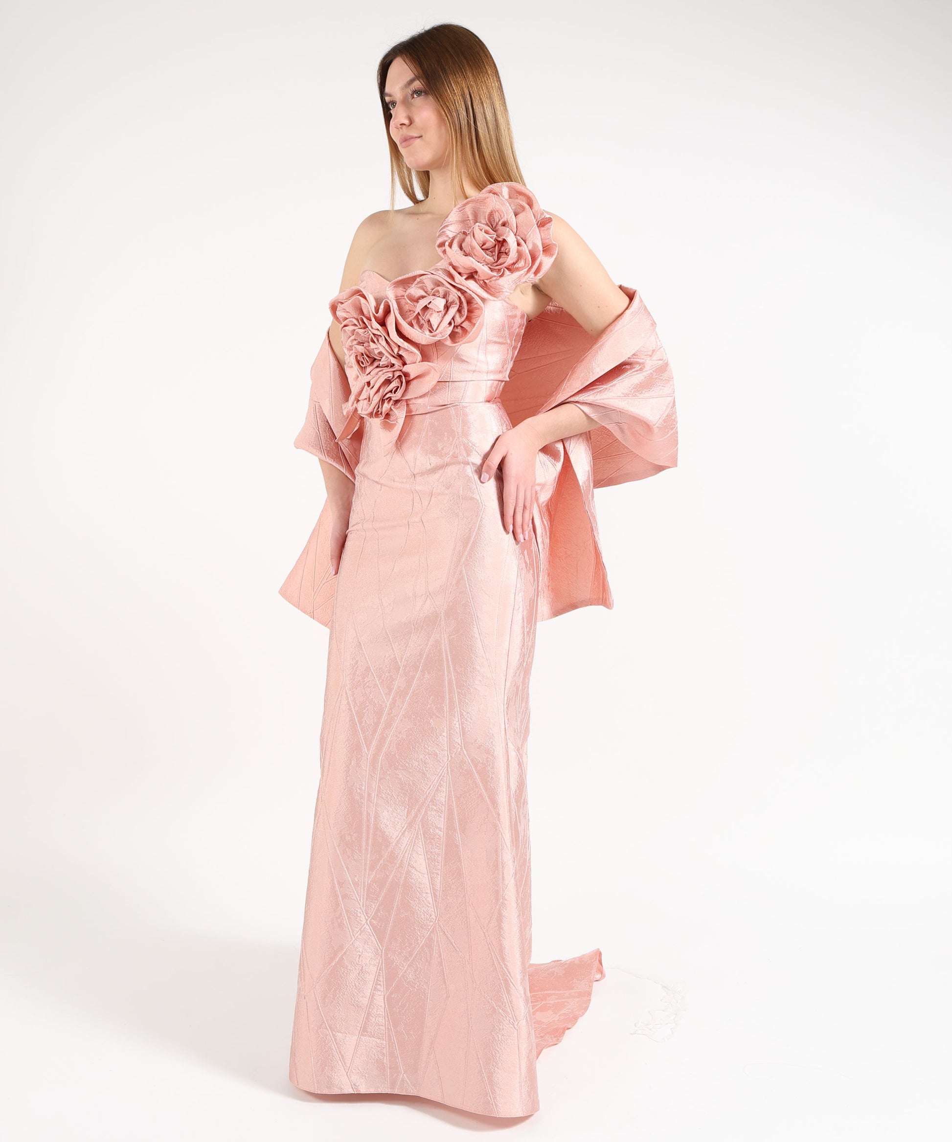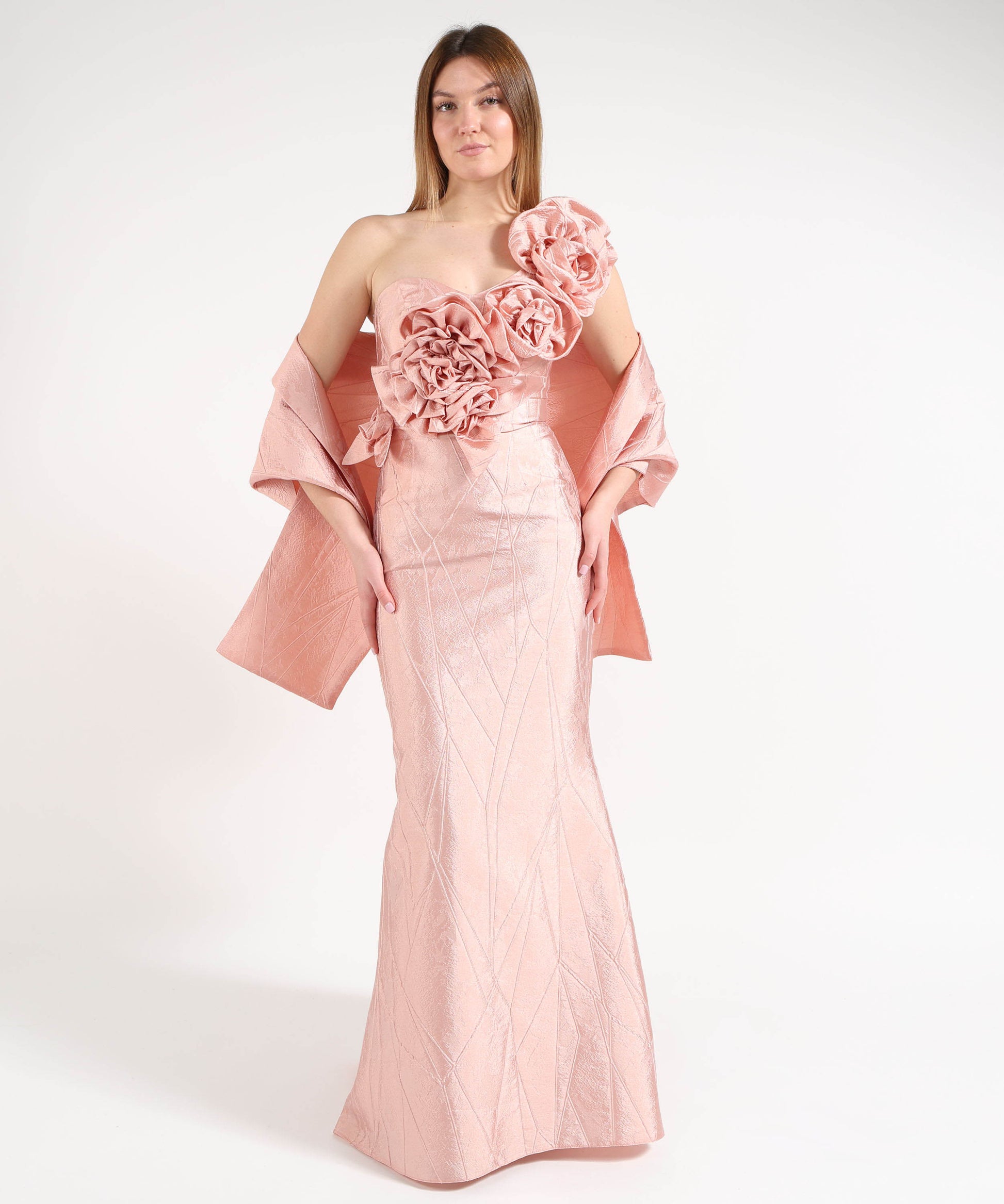 Abito monospalla modello sirena in tessuto lavorato, con applicazioni floreali sulla parte superiore, coda elegante e stola coordinata. Perfetto per cerimonie ed eventi importanti.