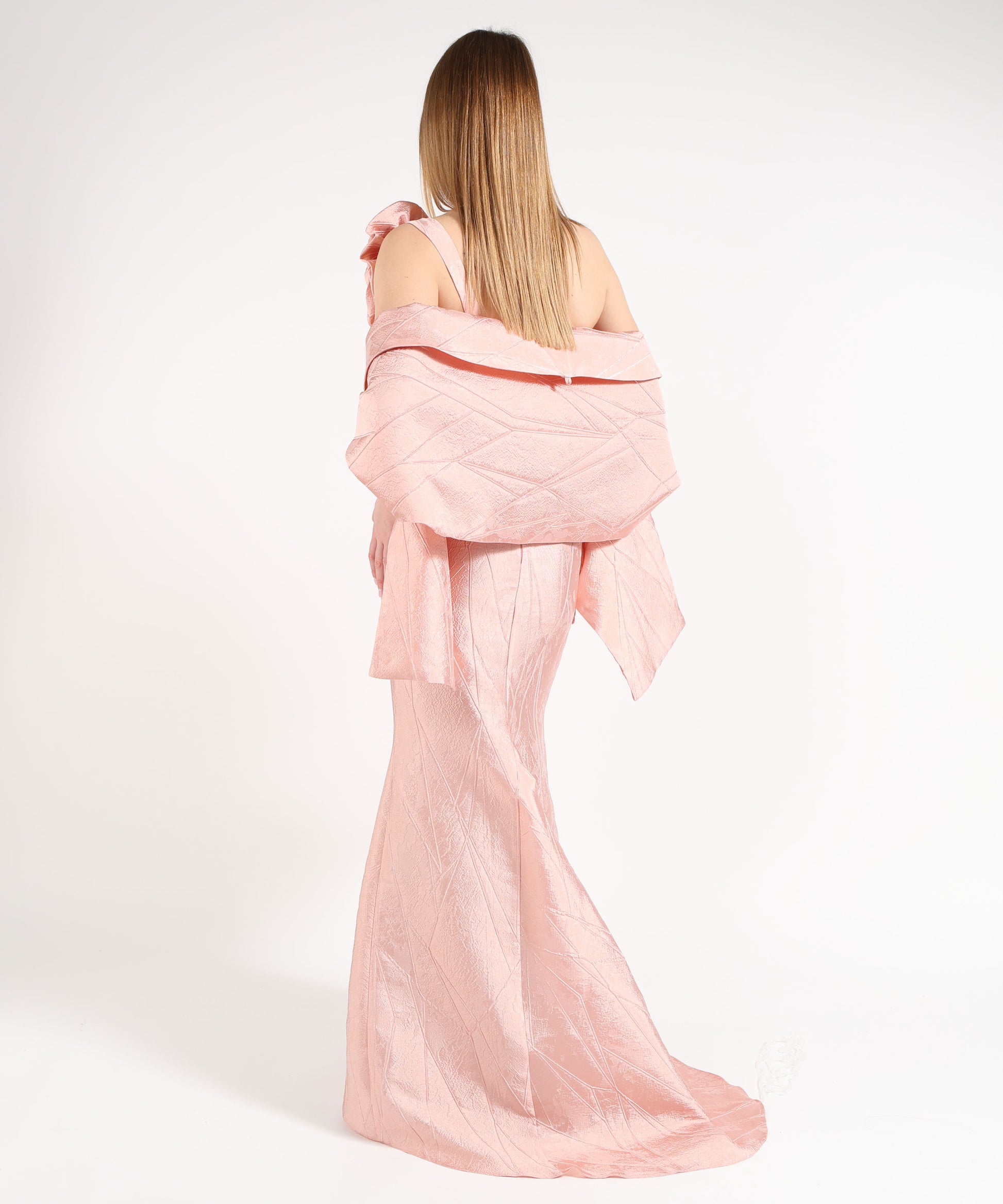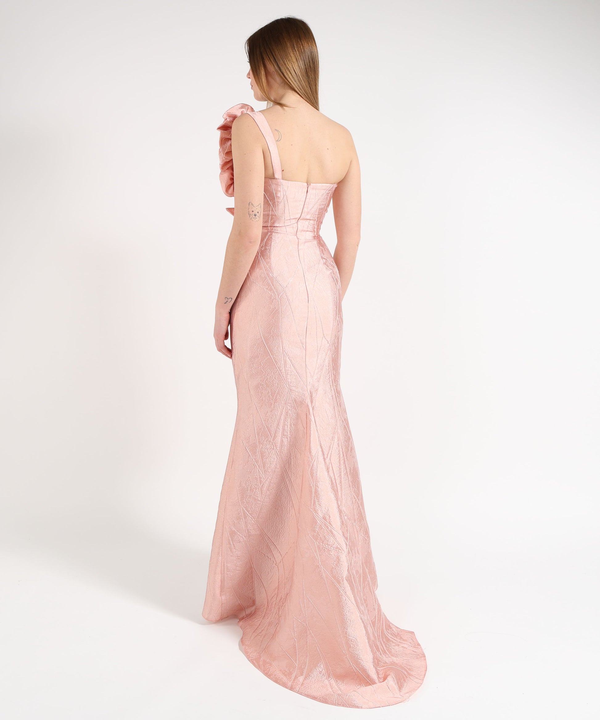 Abito monospalla dal raffinato modello sirena, pensato per valorizzare la silhouette con eleganza e femminilità. Il taglio aderente accompagna le forme fino al fondo, dove si apre in una coda scenografica che dona movimento e imponenza al look.