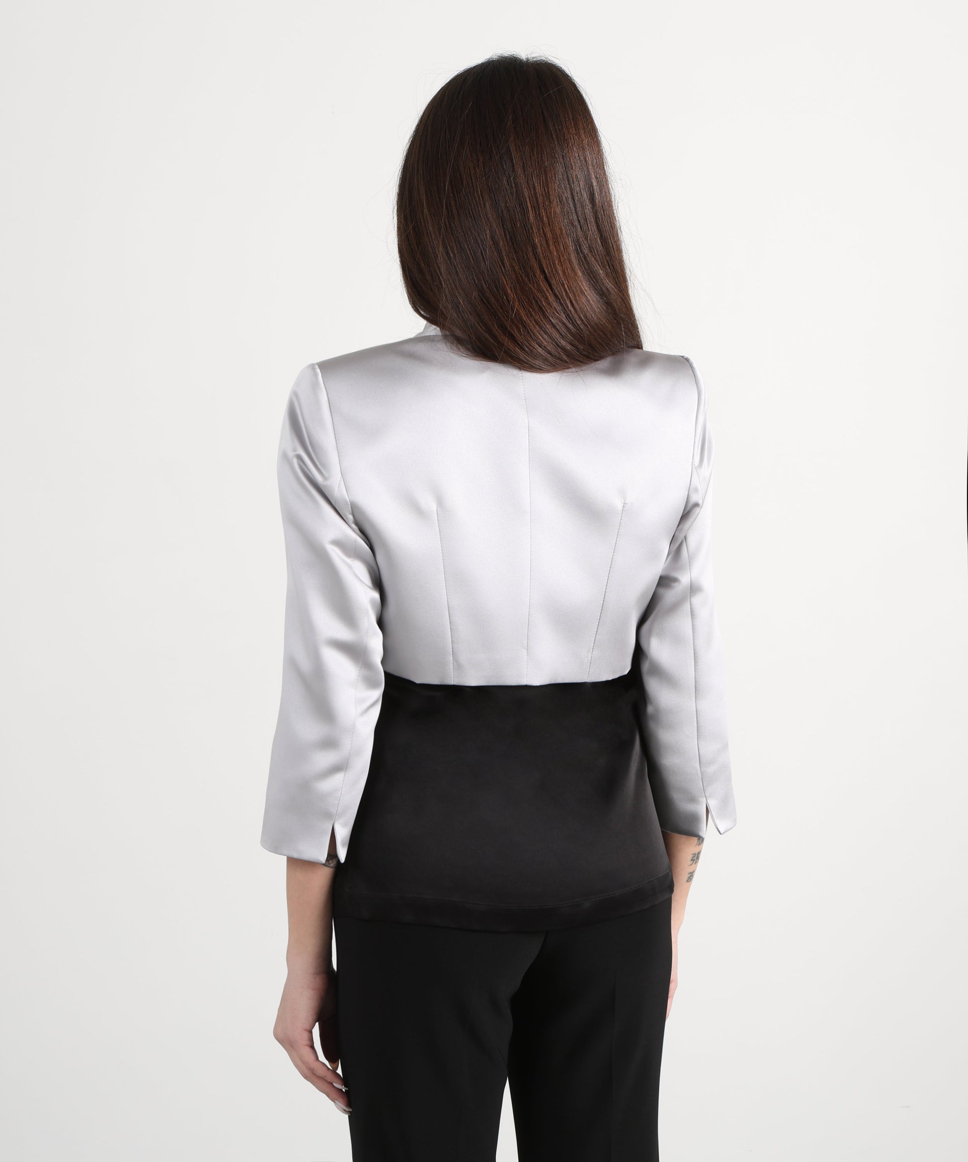 Bolero corto in raso mikado, con collo pistagna e maniche al gomito con spacchetti e polsi risvoltabili. Perfetto per completare look eleganti, coprendo spalle e braccia senza nascondere i dettagli dell’abito in vita.