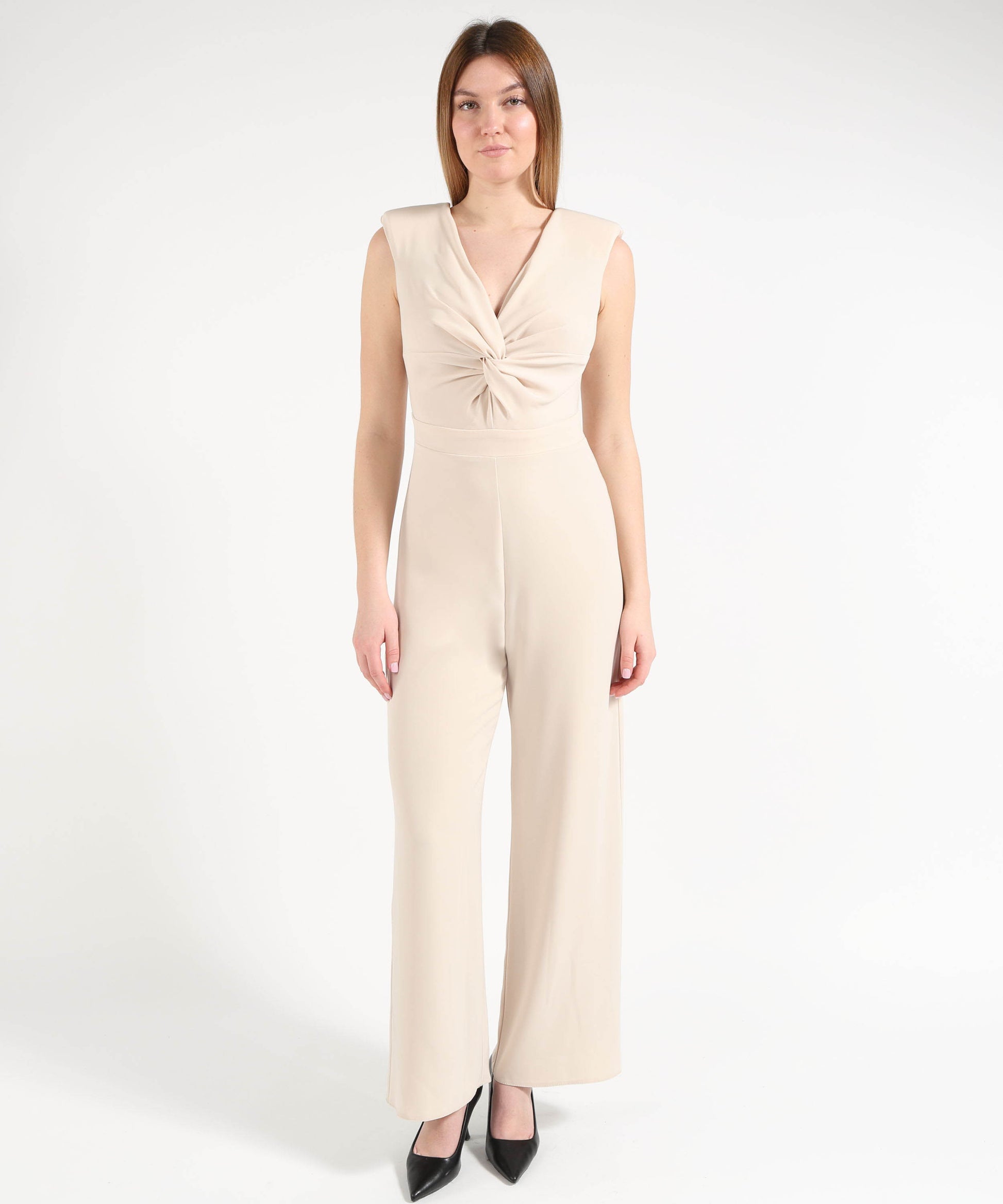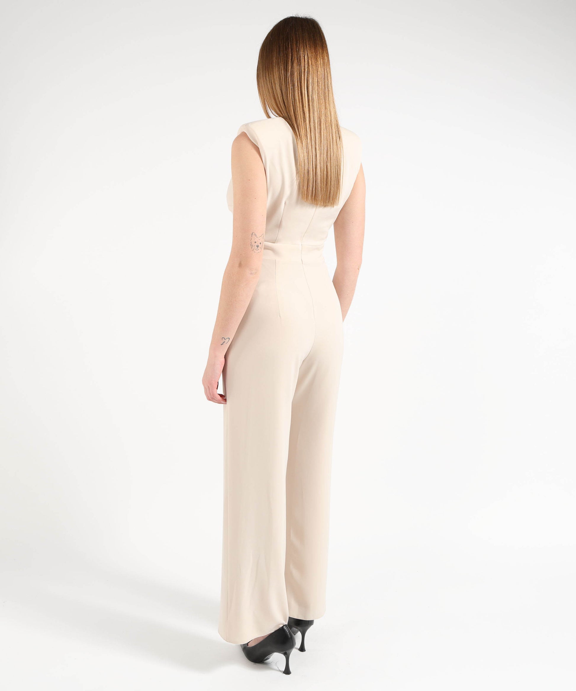 Completo elegante composto da tuta e spolverino coordinato, pensato per occasioni speciali e cerimonie in cui stile e raffinatezza sono protagonisti. La tuta smanicata si distingue per la linea ampia e fluida che valorizza la silhouette, con scollo a V impreziosito da un delicato intreccio sul seno. Il taglio in vita definisce le proporzioni, mentre la chiusura con zip sul retro assicura una vestibilità pratica e pulita. Lo spolverino aggiunge un tocco sofisticato e ricercato: realizzato in tessuto intagliato con fantasia floreale, crea un elegante gioco di trasparenze. Lo scollo a V è rifinito da un leggero colletto stile coreano, mentre le maniche a tre quarti presentano una bordatura coordinata nello stesso tessuto della tuta, per un effetto armonioso e curato nei dettagli. Un completo versatile e scenografico, ideale per eventi formali, cerimonie e occasioni serali. Scheda tecnica